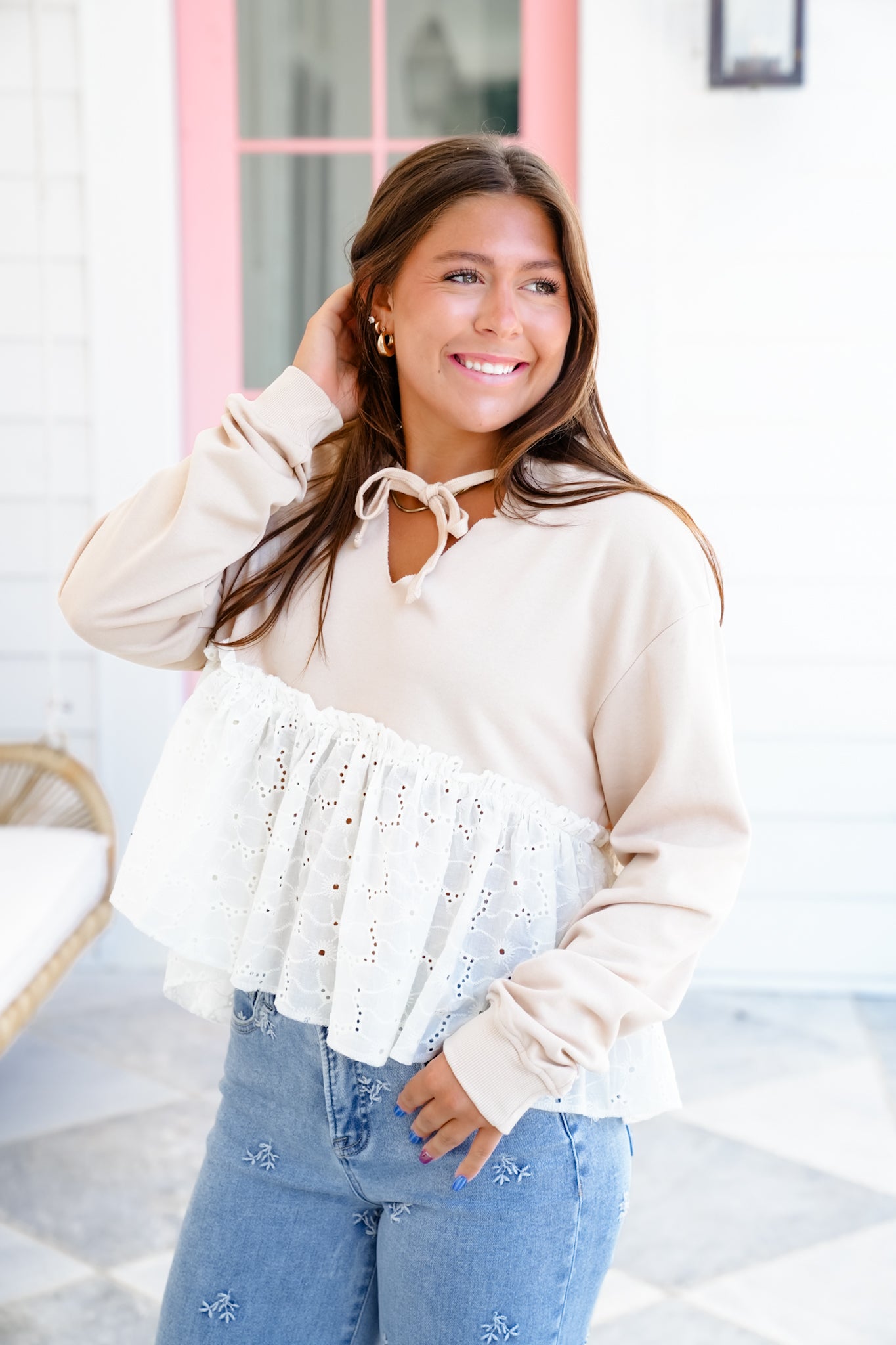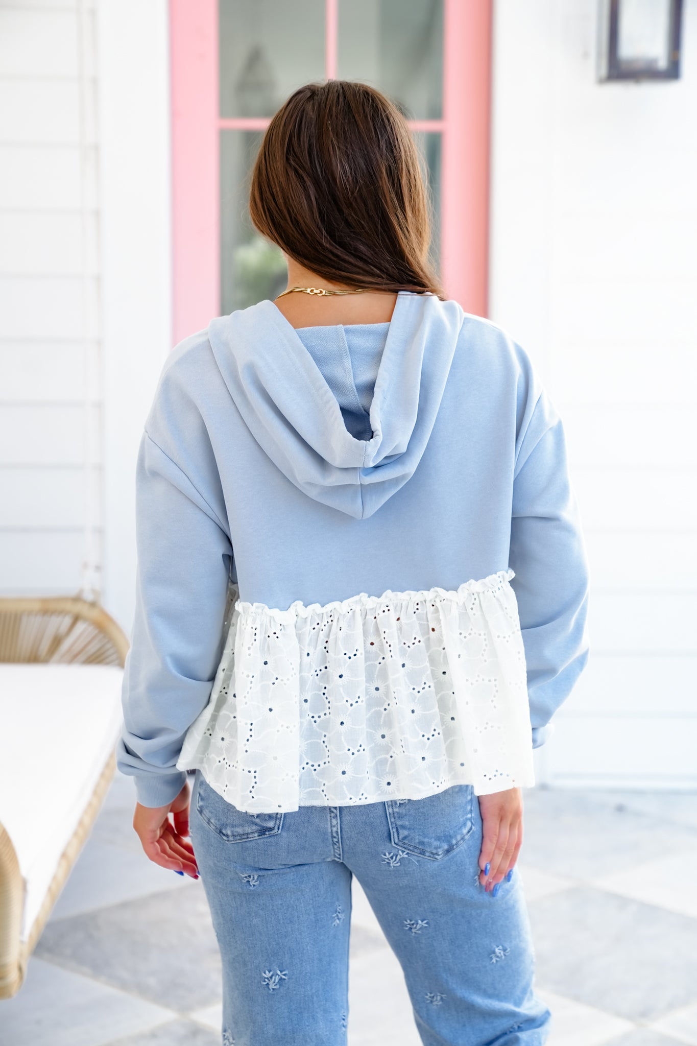 Long Sleeve Pullover Hoodie Top with Eyelet Ruffle Detail