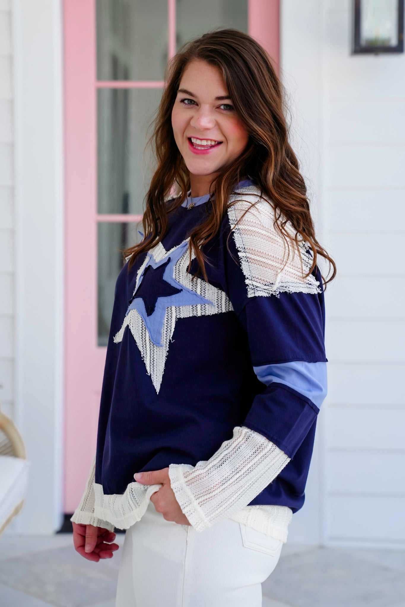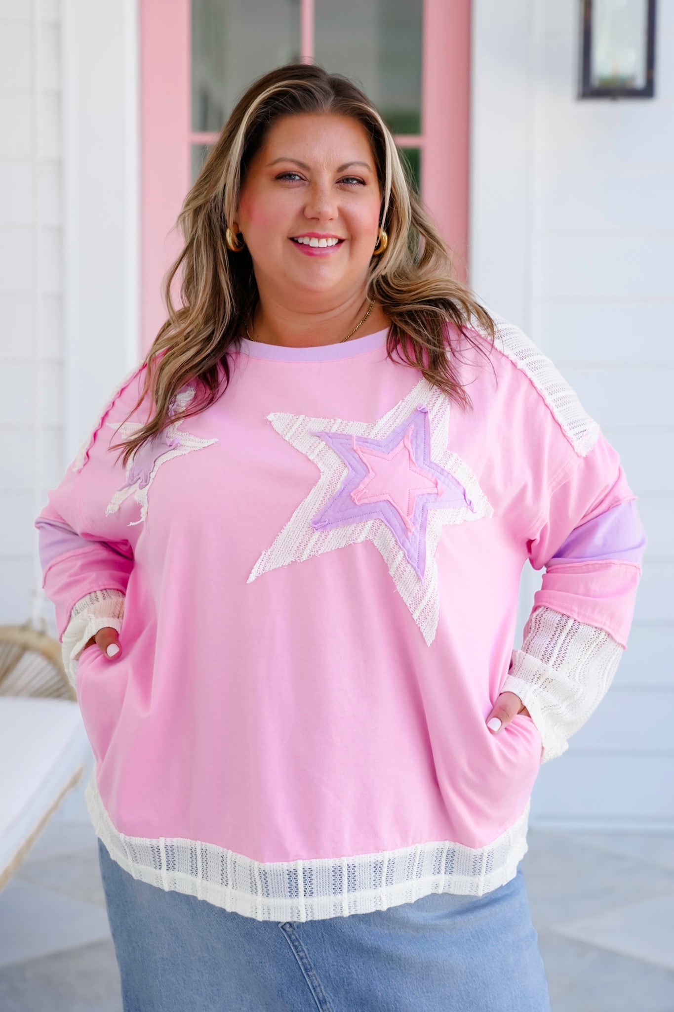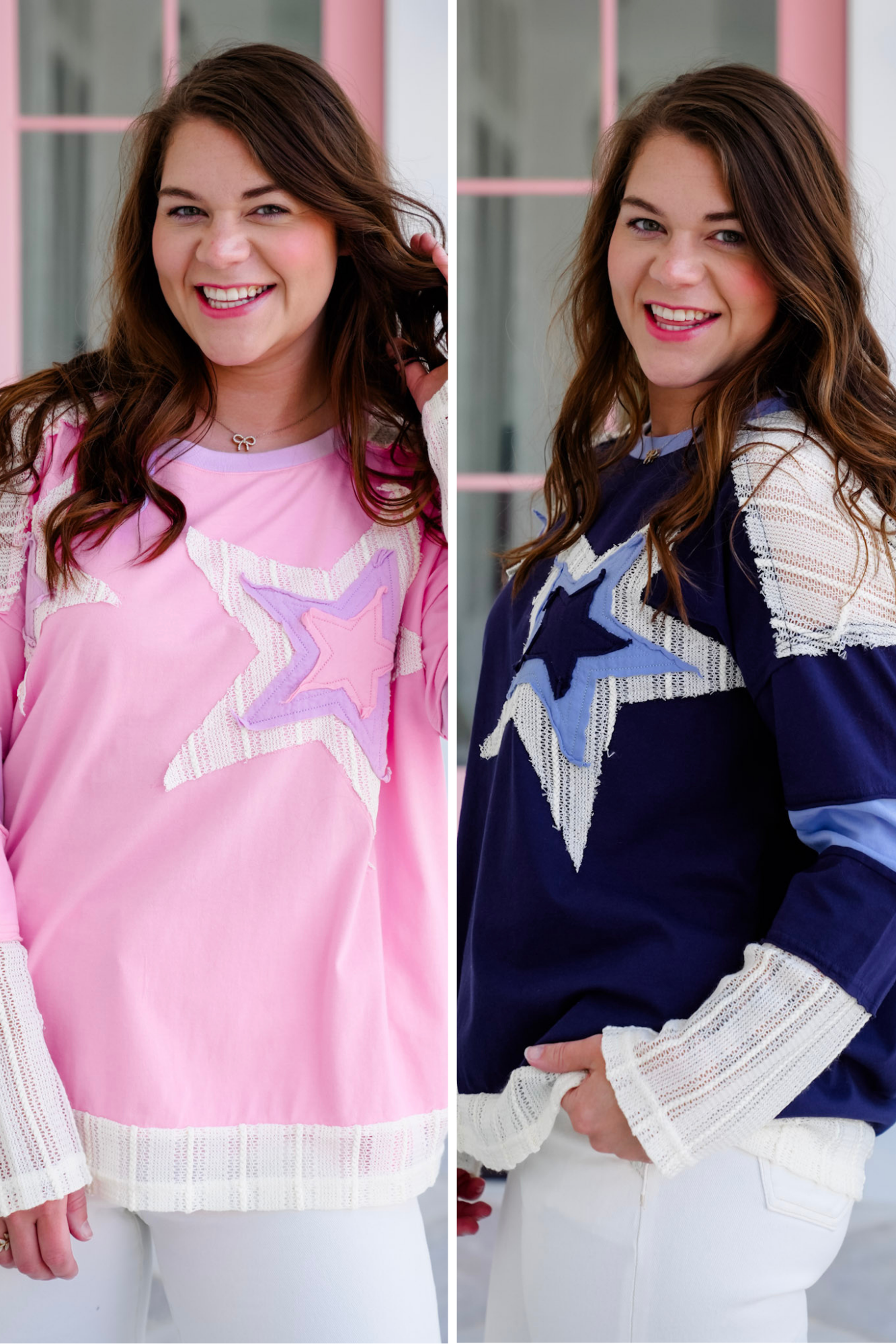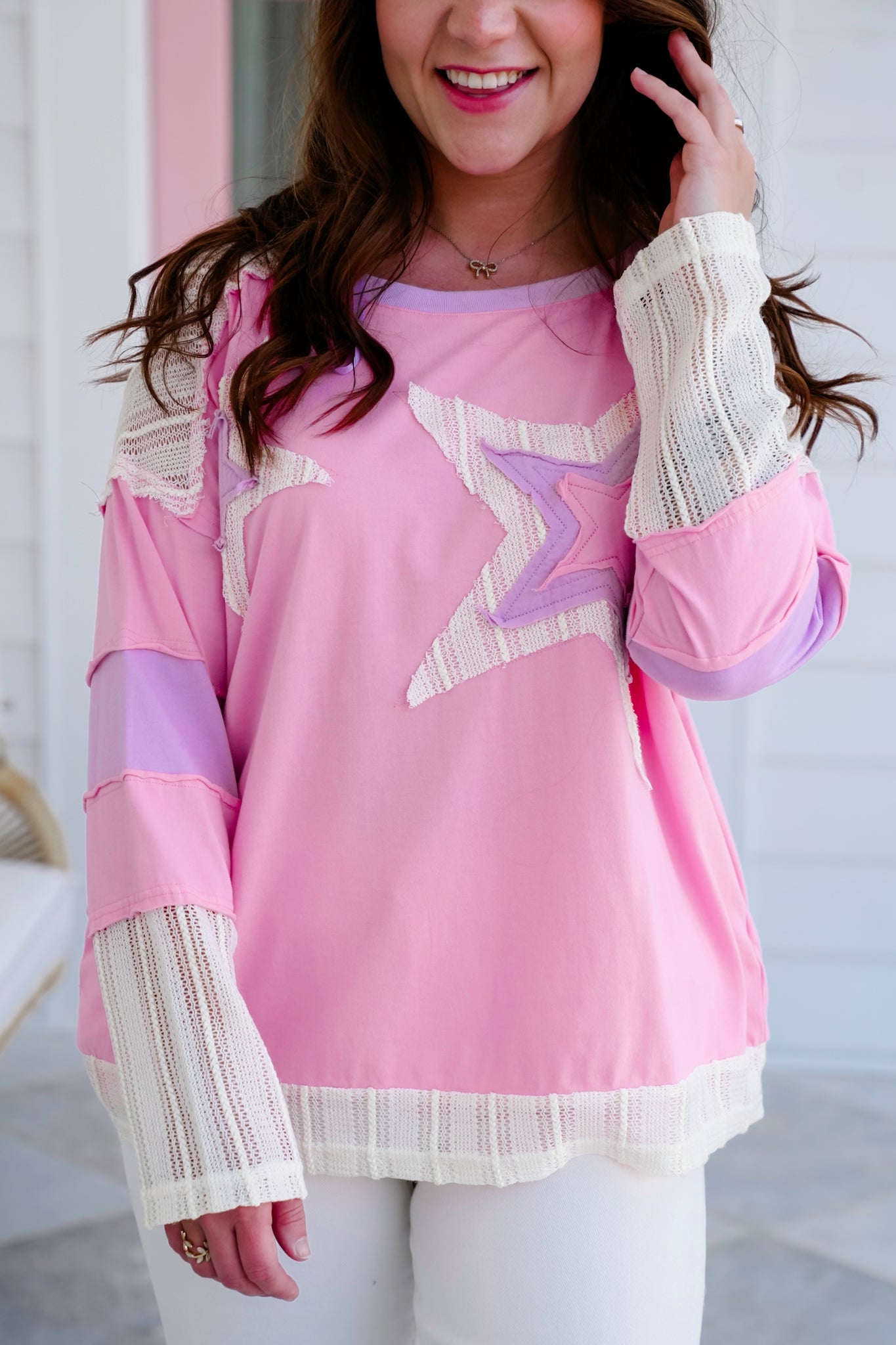 This top is bringing all the playful energy! With bold star patches, color-blocked details, and peekaboo pleated fabric at the sleeves and hem, it’s the kind of piece that makes any outfit feel fun. Style it with white denim, sneakers, and a messy bun for a laid-back but standout look.