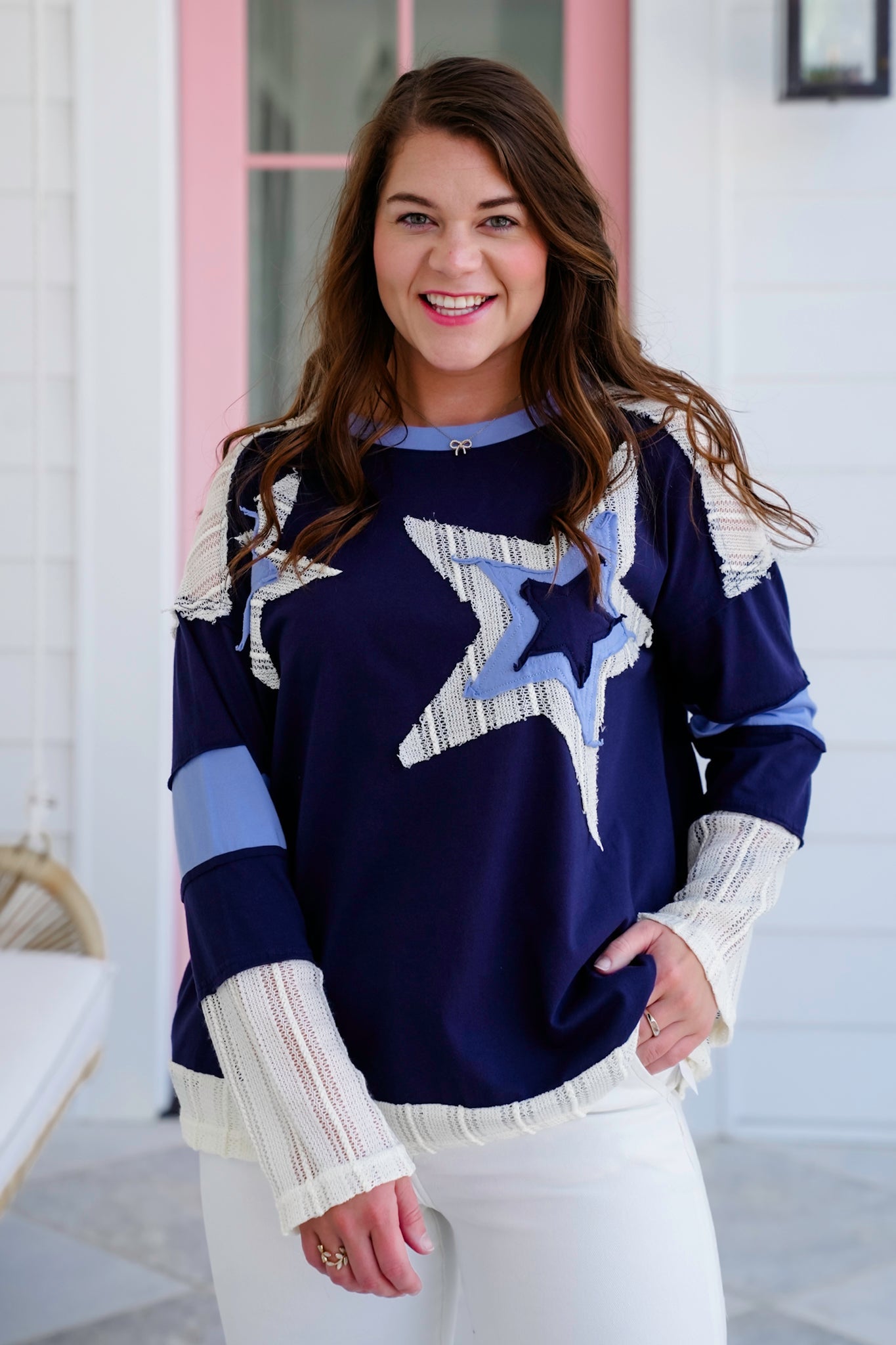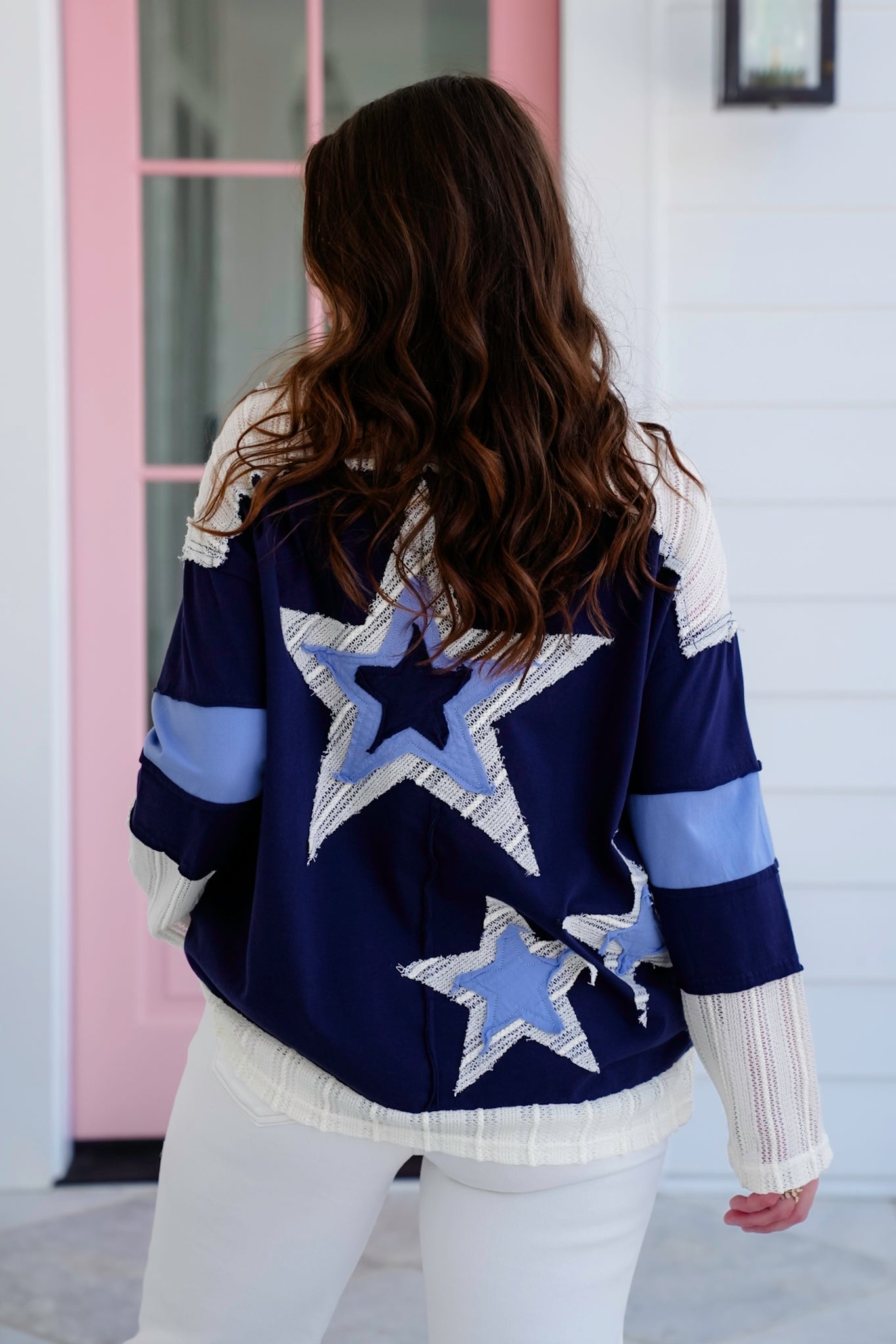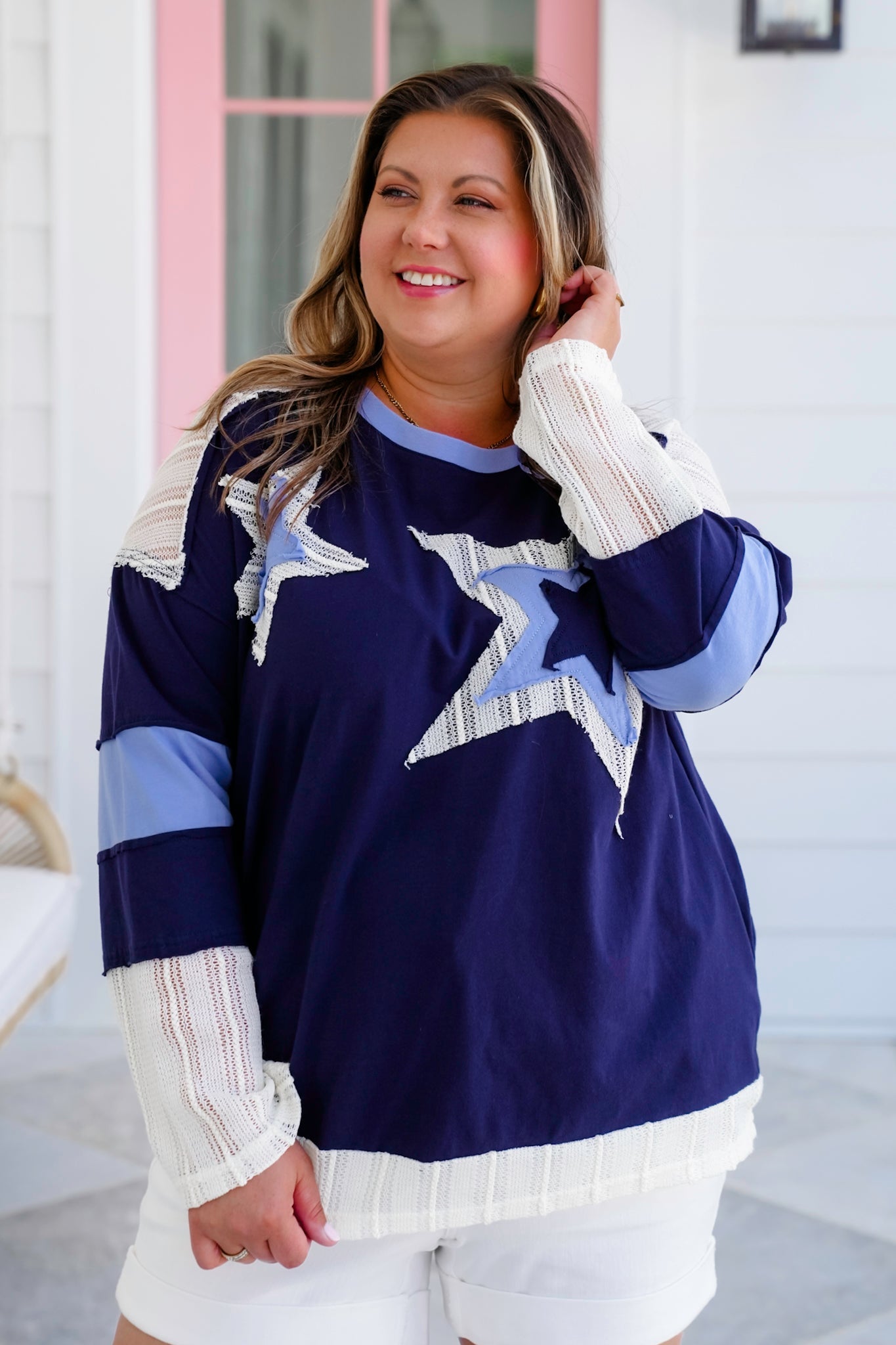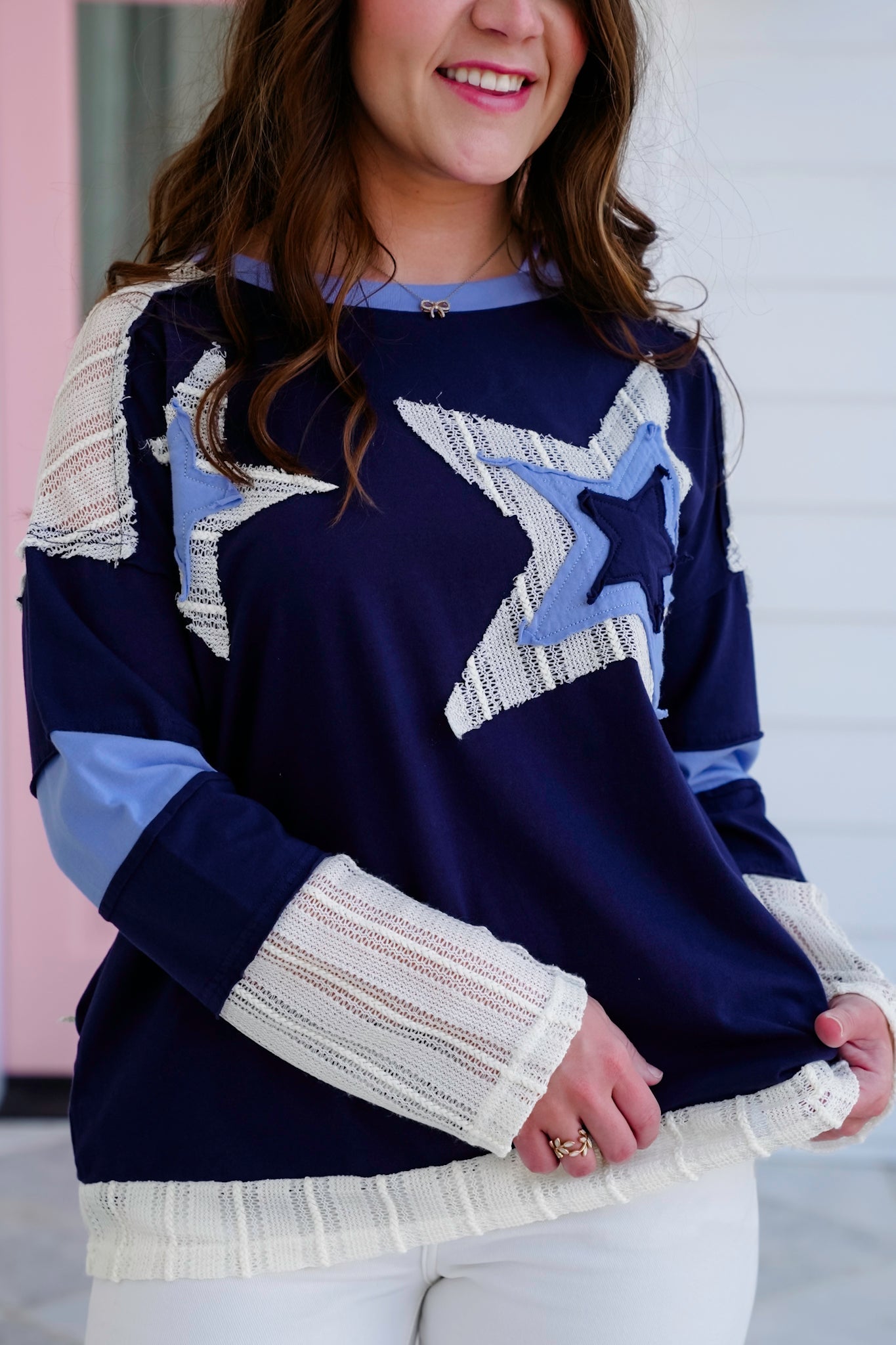 This top is bringing all the playful energy! With bold star patches, color-blocked details, and peekaboo pleated fabric at the sleeves and hem, it’s the kind of piece that makes any outfit feel fun. Style it with white denim, sneakers, and a messy bun for a laid-back but standout look.