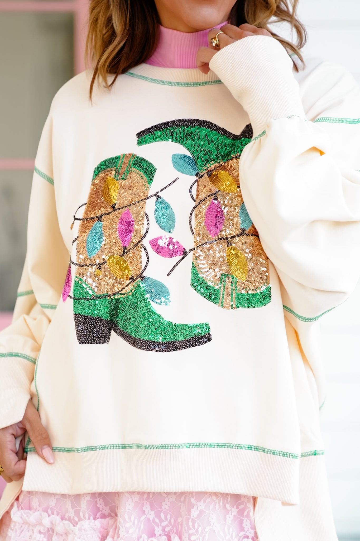 Long Sleeve Sequin Cowboy Boots Pullover Sweatshirt