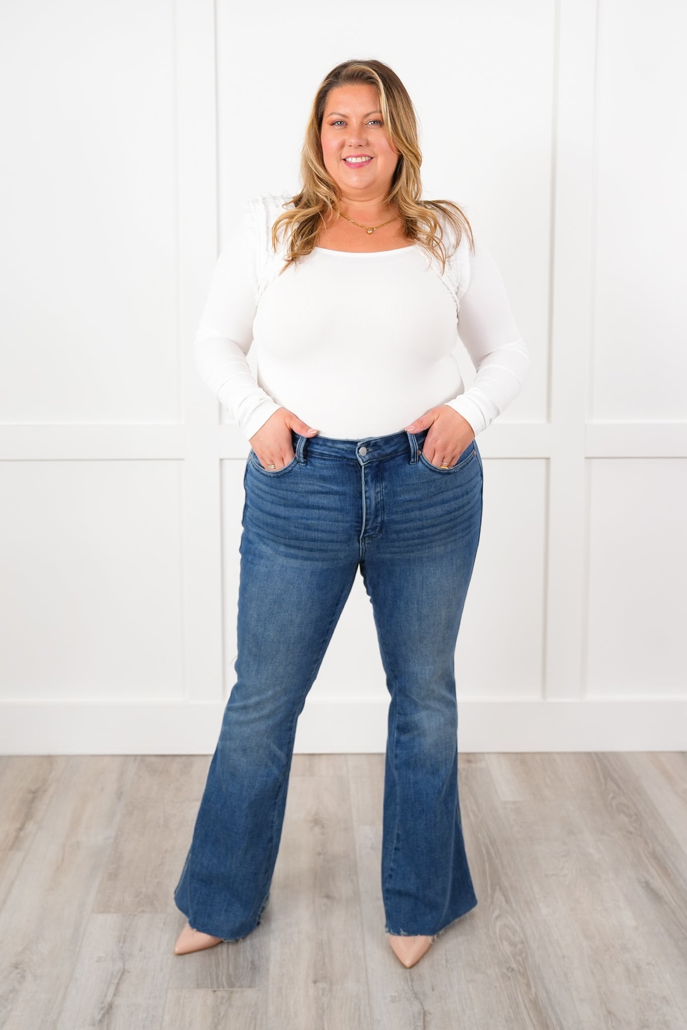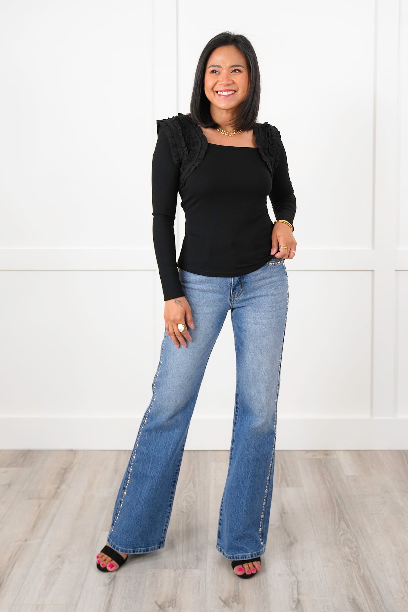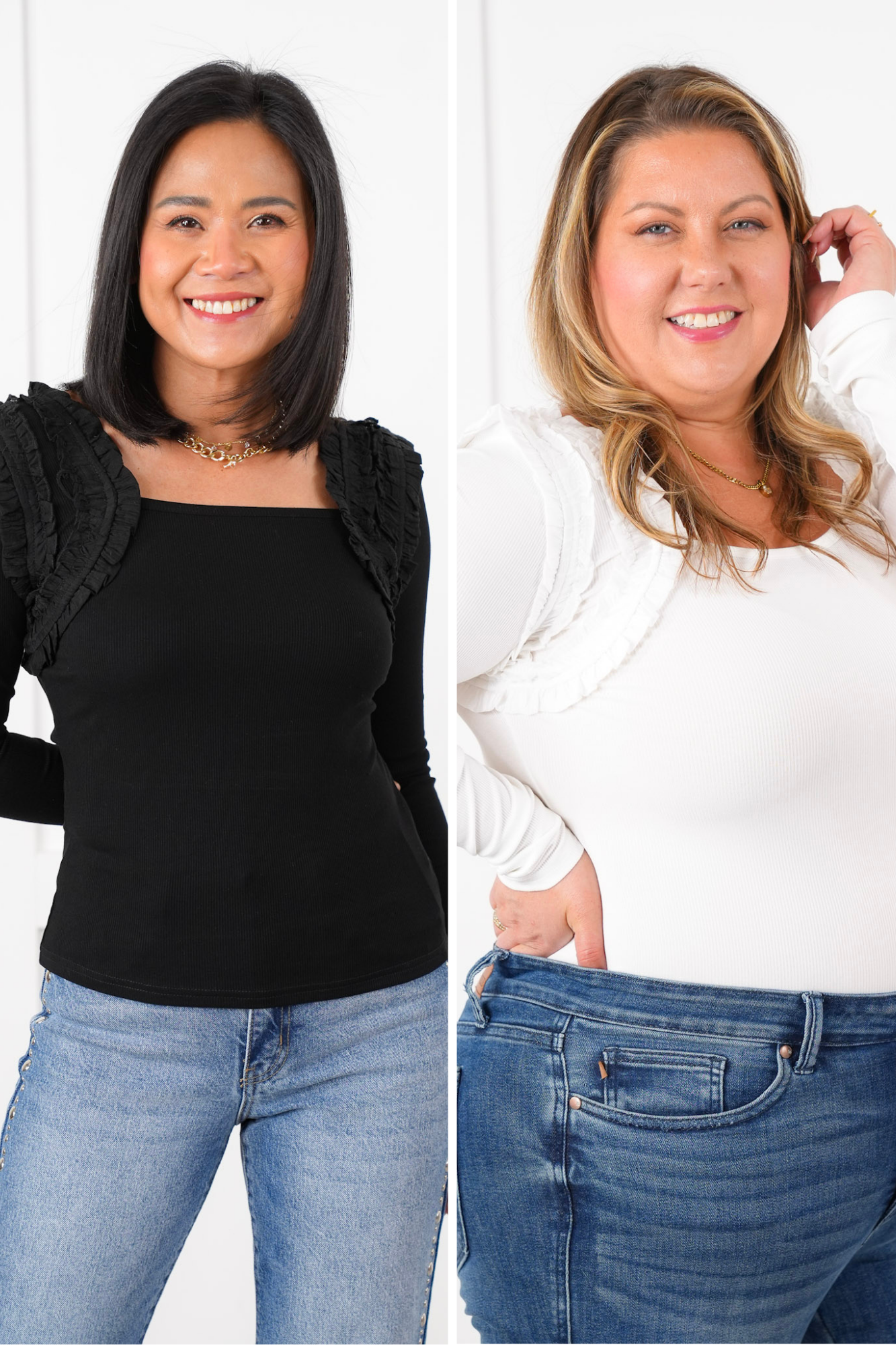 This fitted top is all about clean lines and cute details. The square neckline is flattering, and the ruffle accents on the shoulders give it just the right amount of drama. Whether you pair it with high-waisted jeans or a skirt, you’re sure to look polished and put-together.