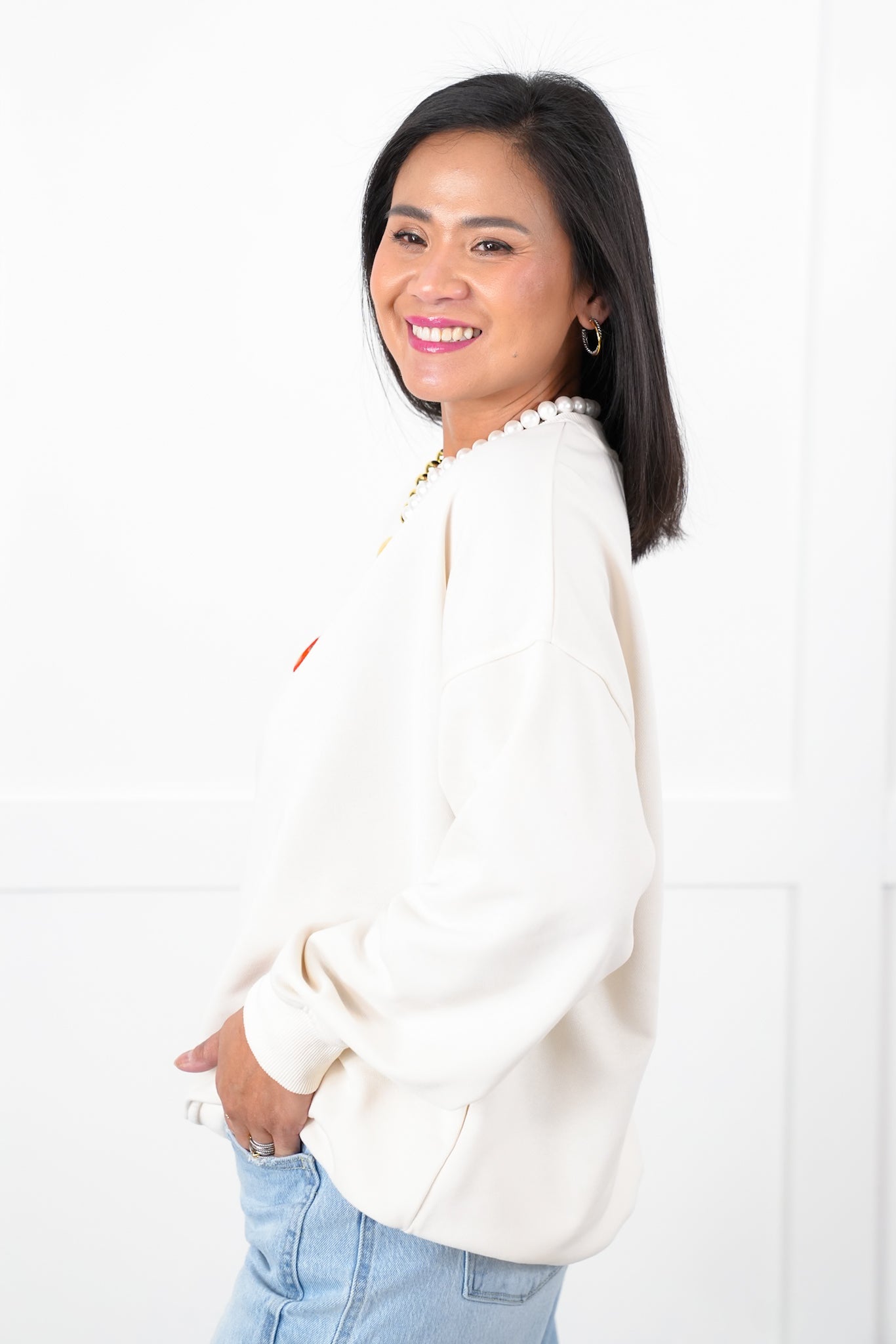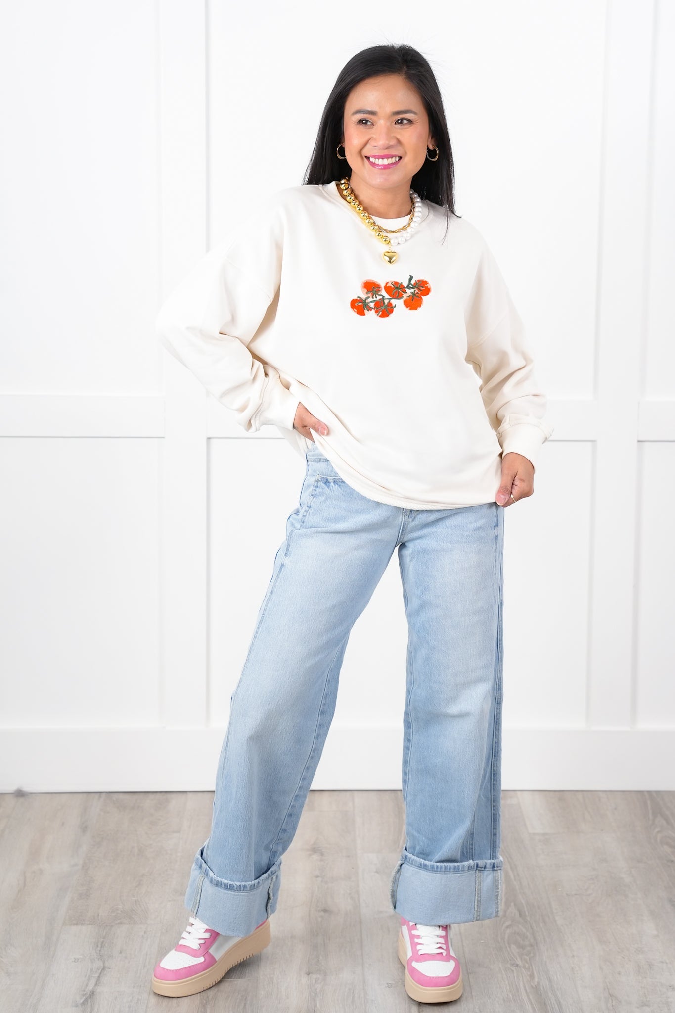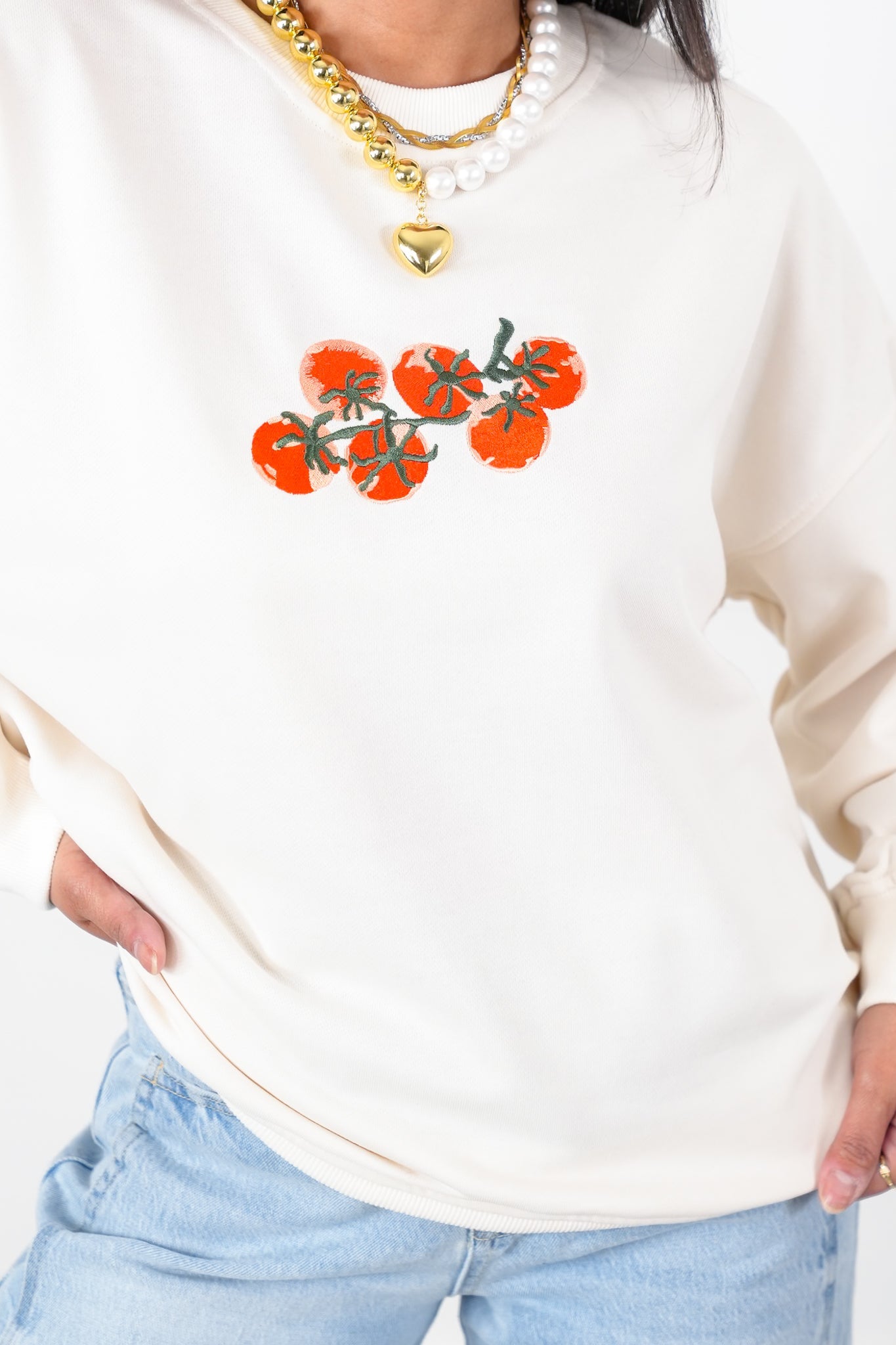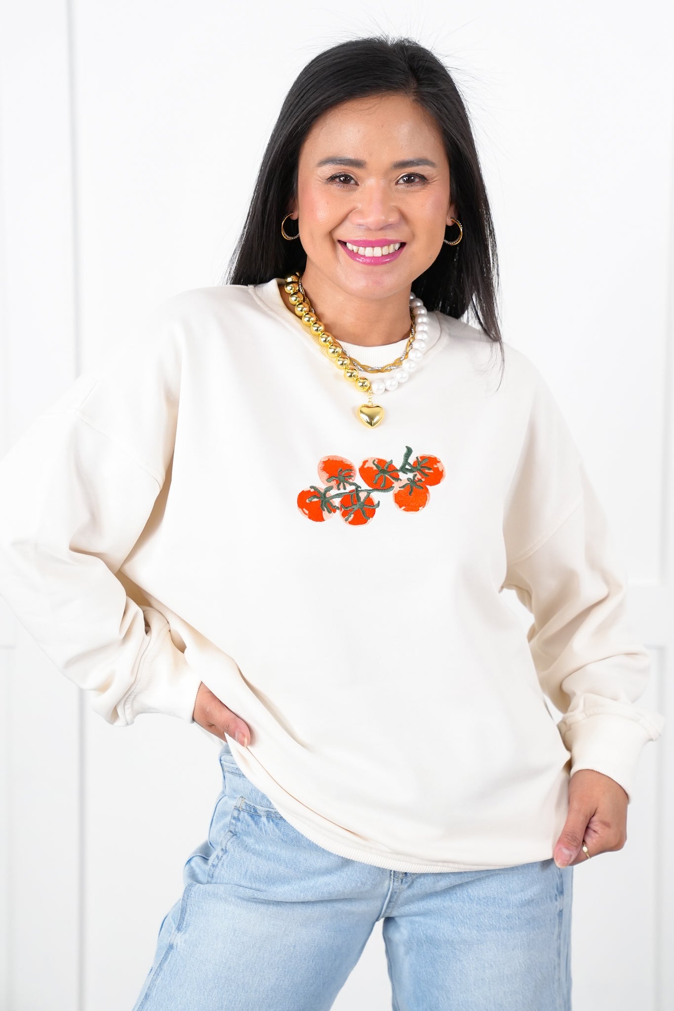 This playful long-sleeve sweatshirt adds a fun twist to your wardrobe with its vibrant, embroidered tomato design. The soft fabric and relaxed fit make it a cozy, casual choice that’s perfect for pairing with jeans, leggings, or even skirts.