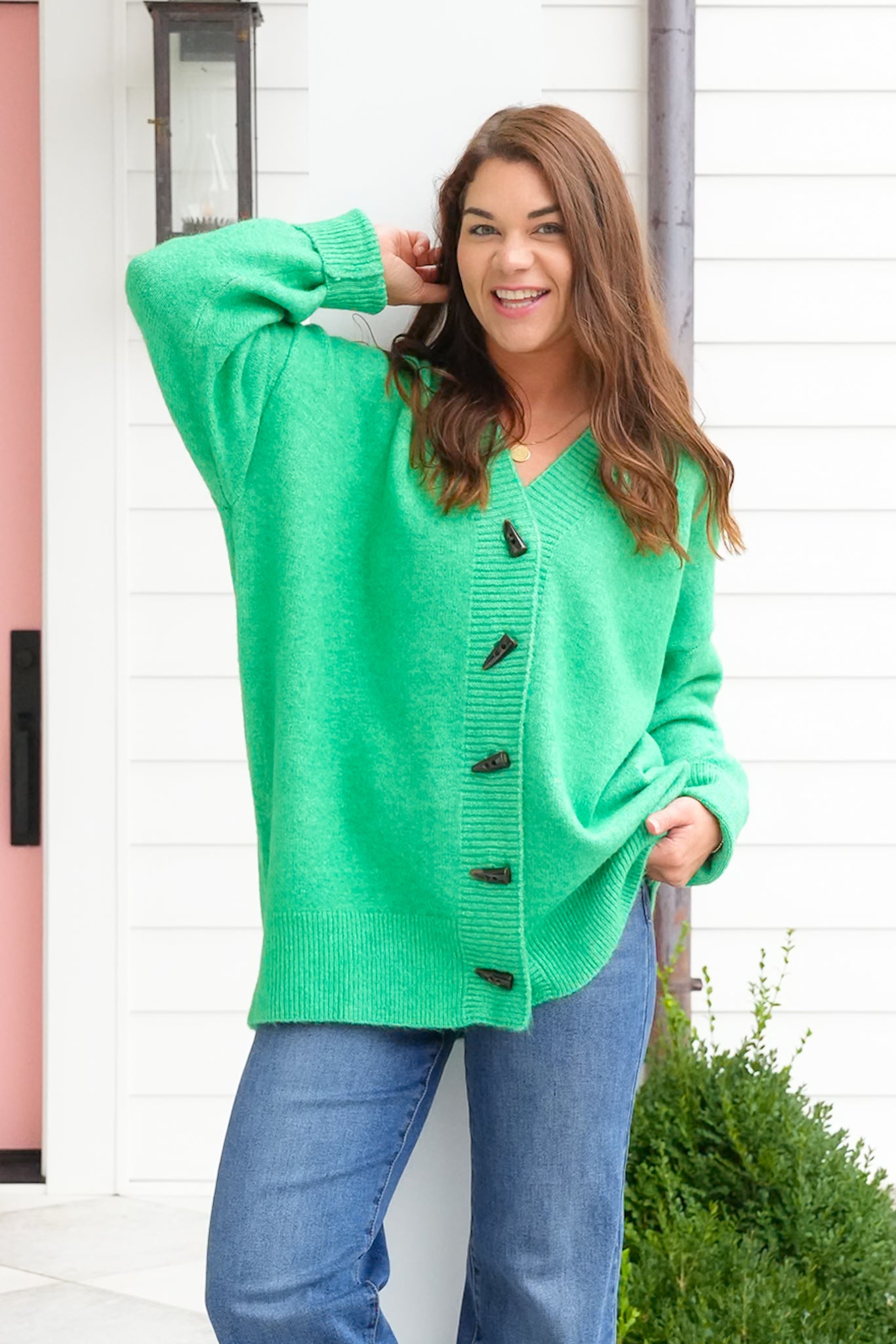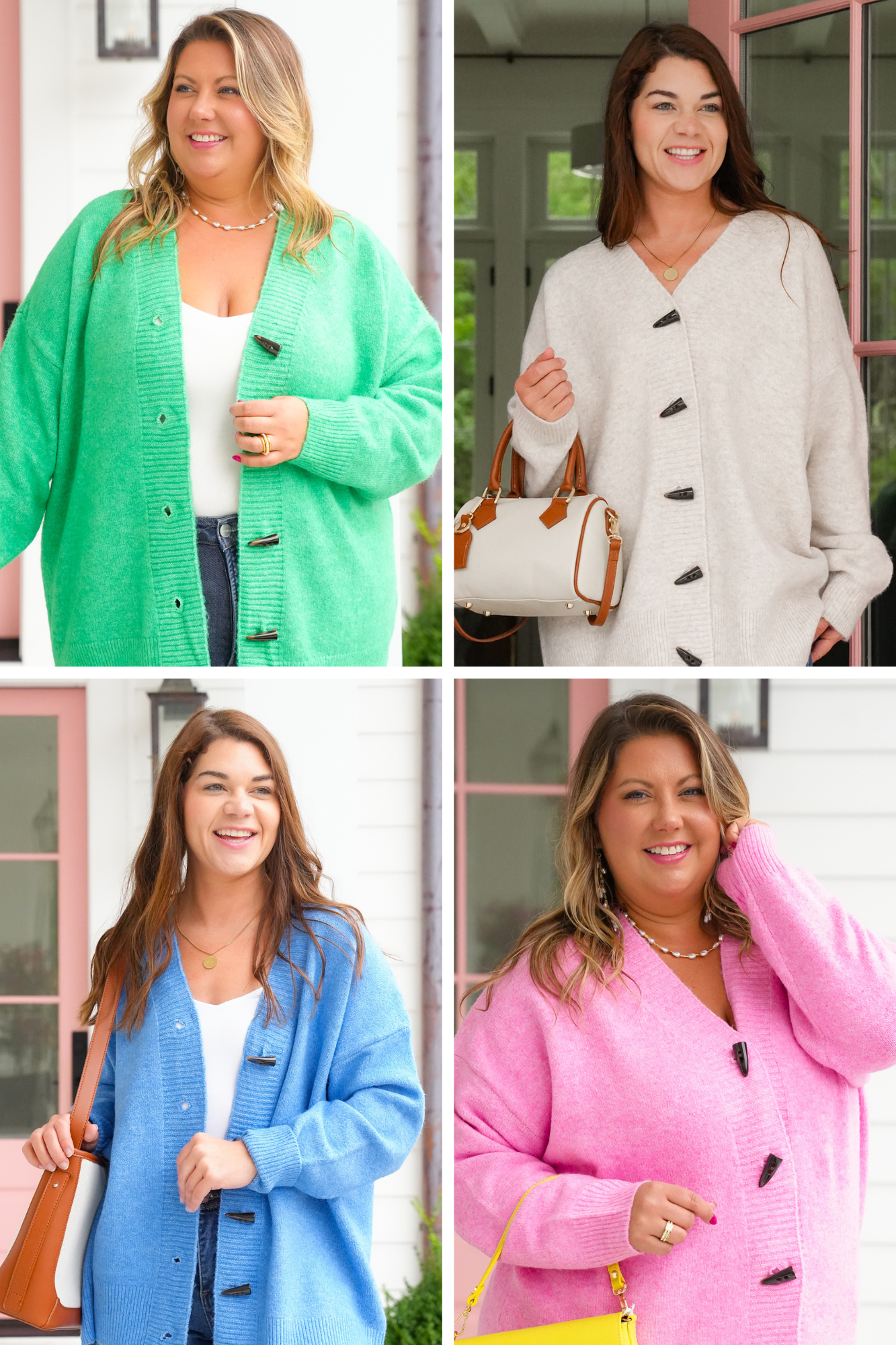 This toggle button cardigan is the ultimate mix of cozy and chic. With its plush knit and bold toggle details, it’s the perfect throw-on layer to make your outfit feel instantly elevated. Whether you go for a pop of color or keep it neutral, this cardigan is a fall-to-winter must-have.