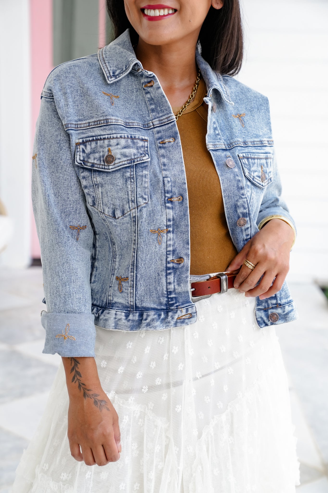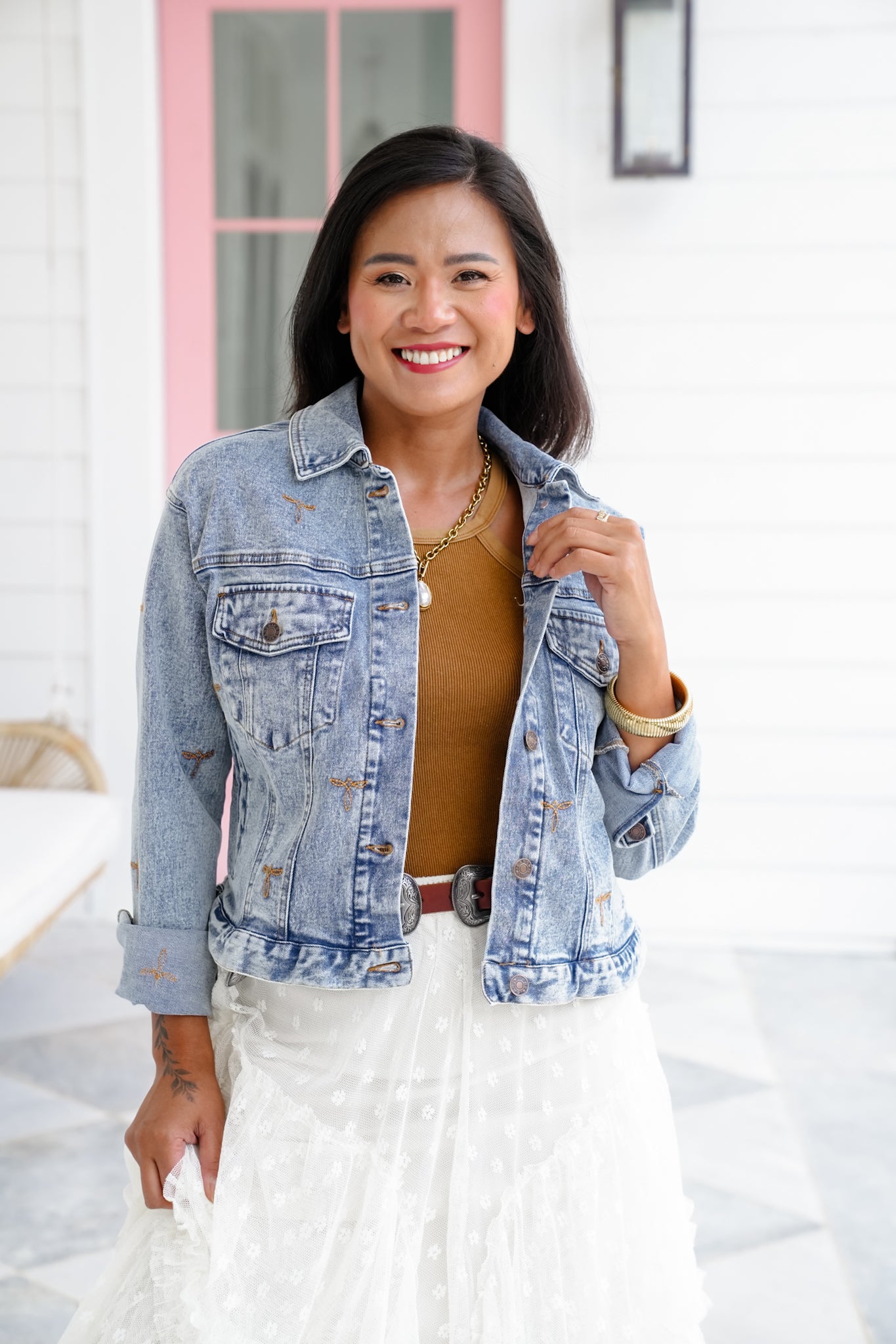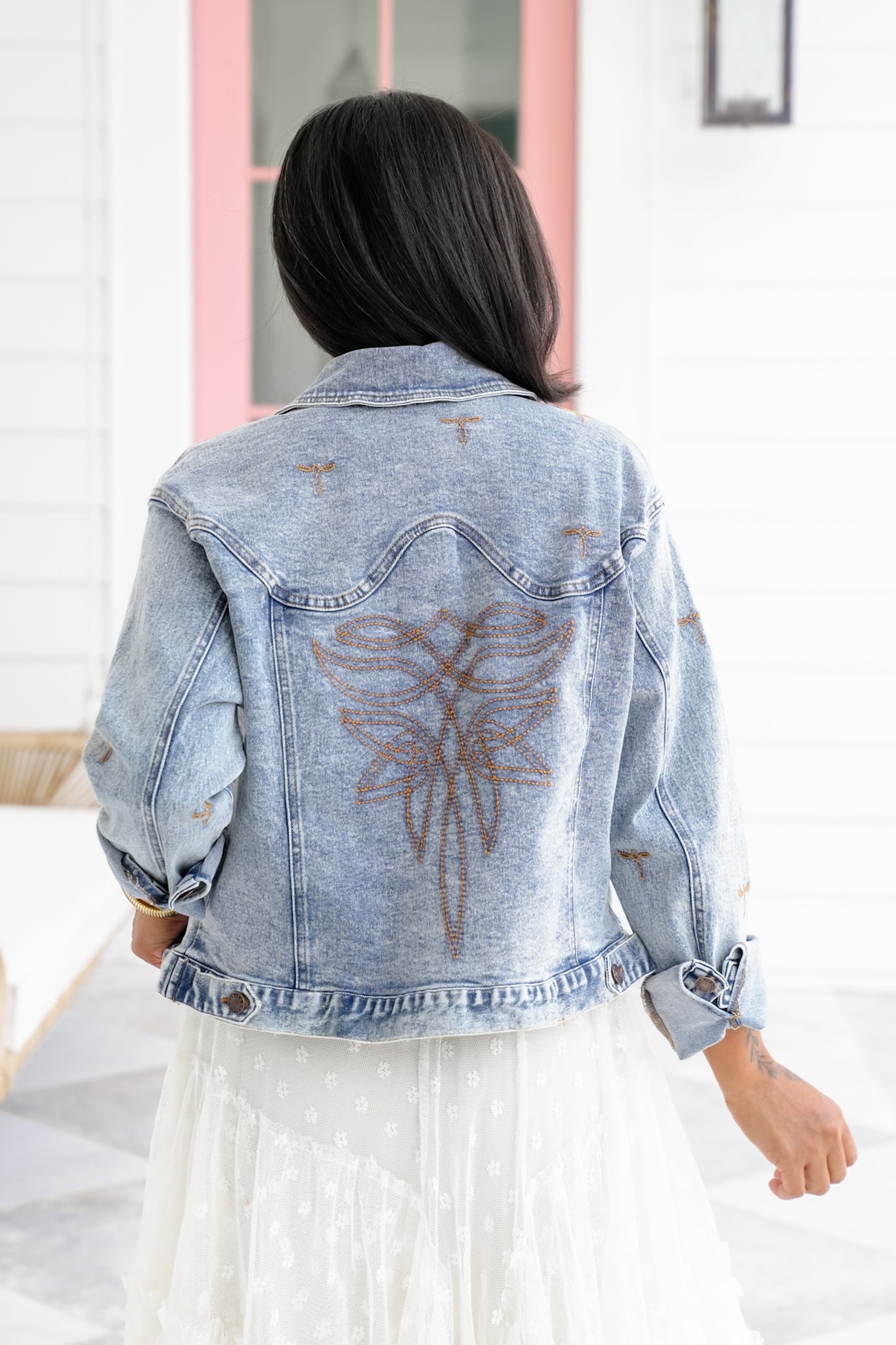 This isn’t your basic denim jacket—those embroidered stitch accents and perfectly faded wash give it a Western flair that stands out. Whether you're layering over a dress or going full denim-on-denim, this piece adds a cool touch to every look.