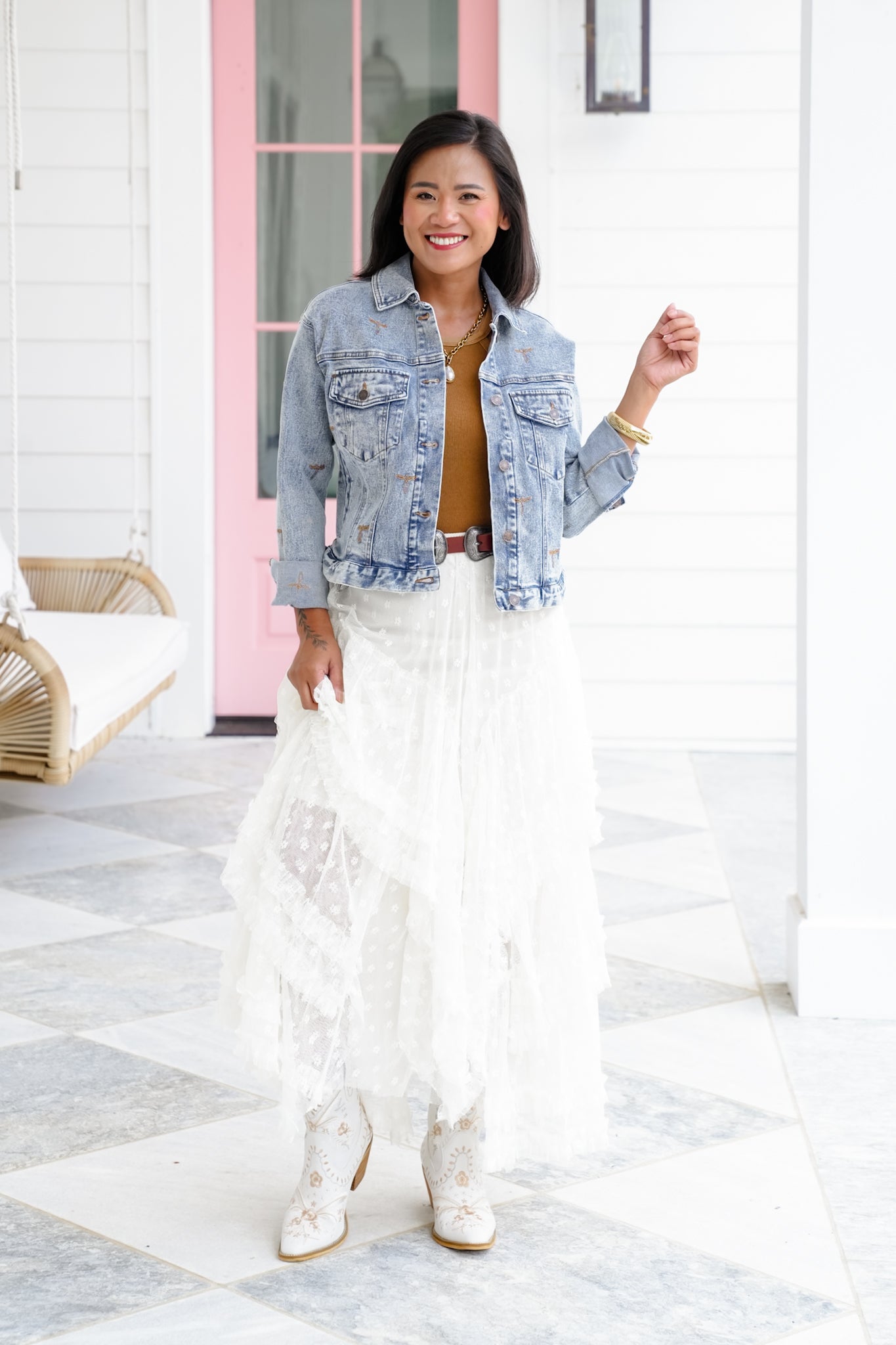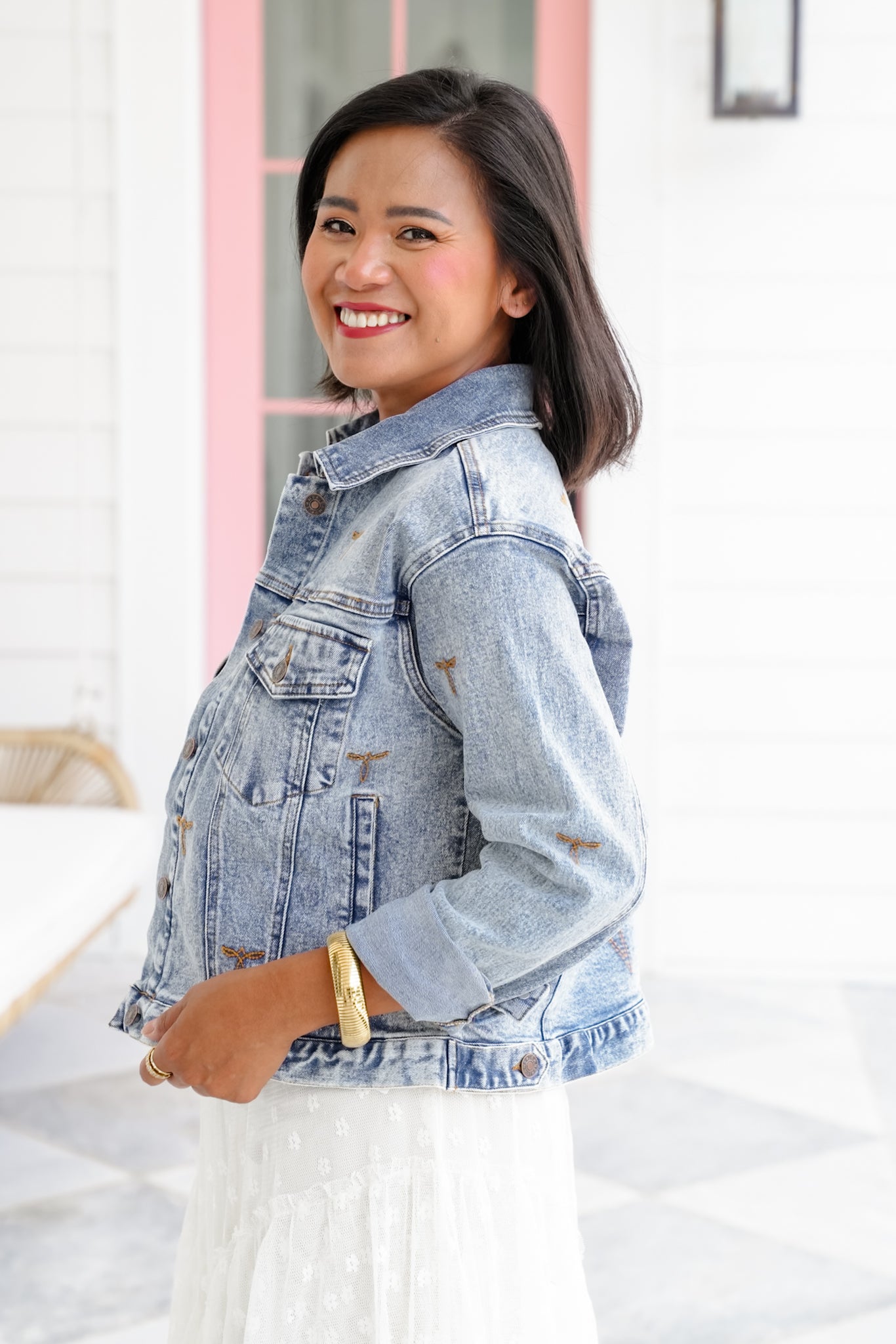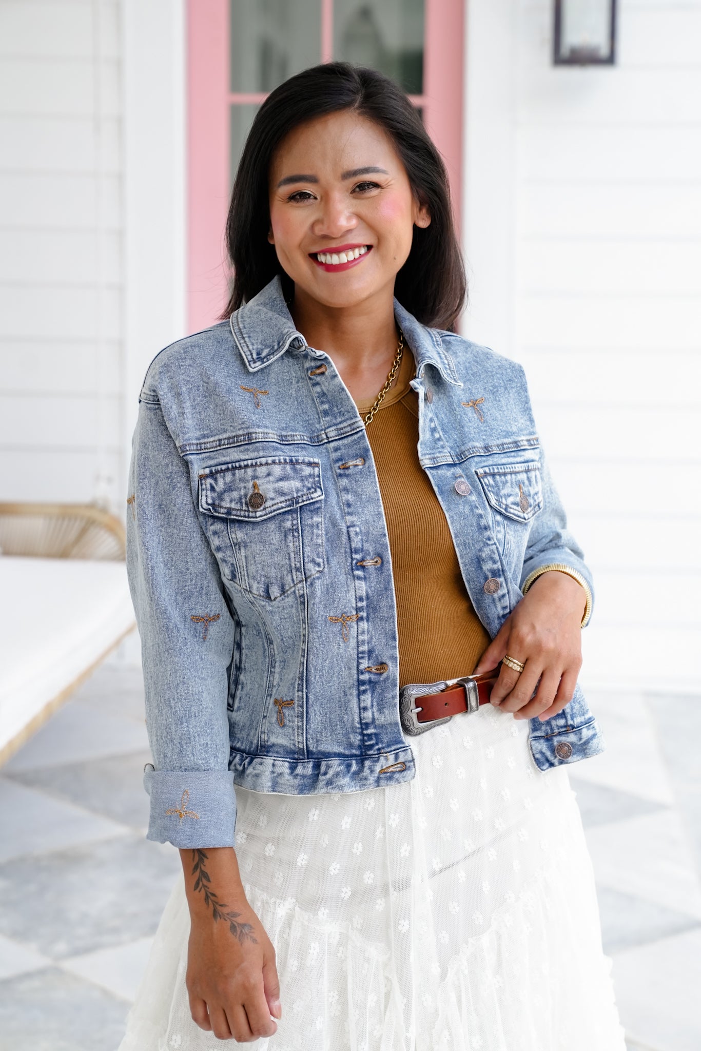 This isn’t your basic denim jacket—those embroidered stitch accents and perfectly faded wash give it a Western flair that stands out. Whether you're layering over a dress or going full denim-on-denim, this piece adds a cool touch to every look.