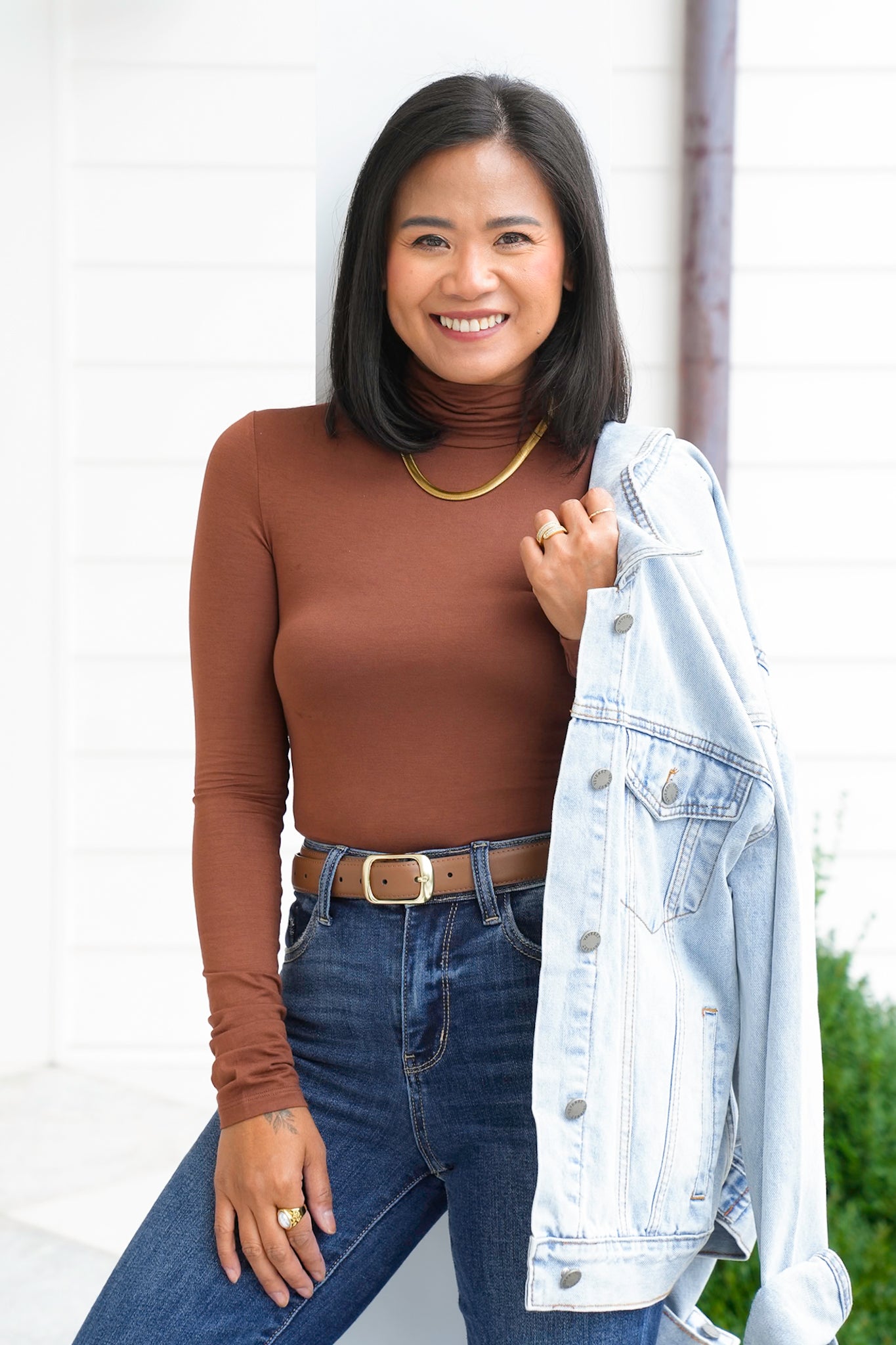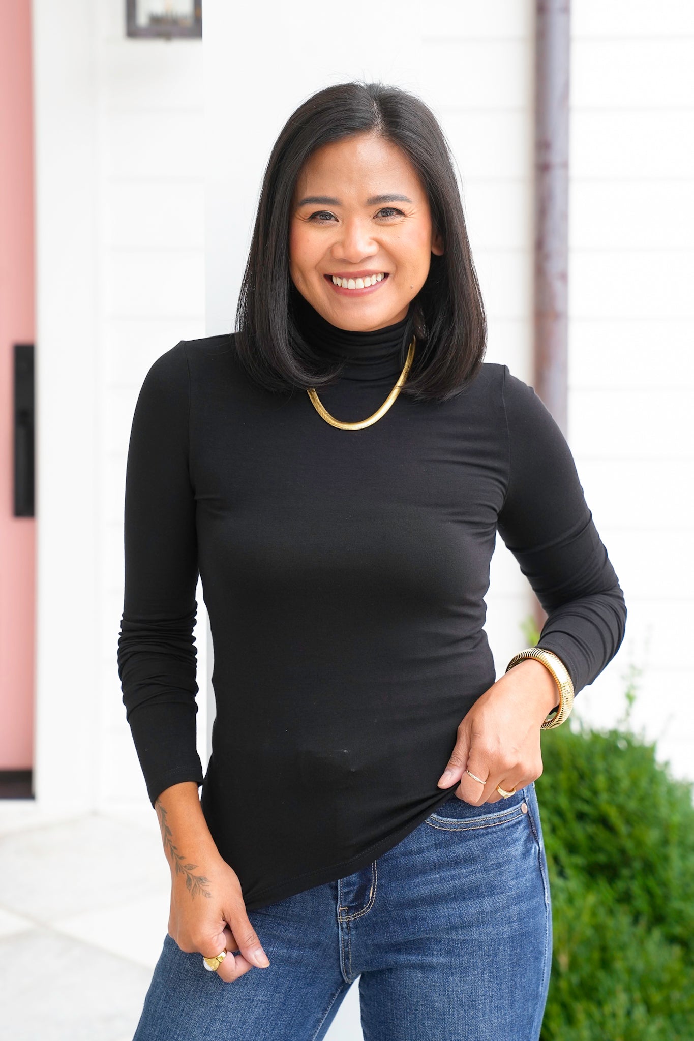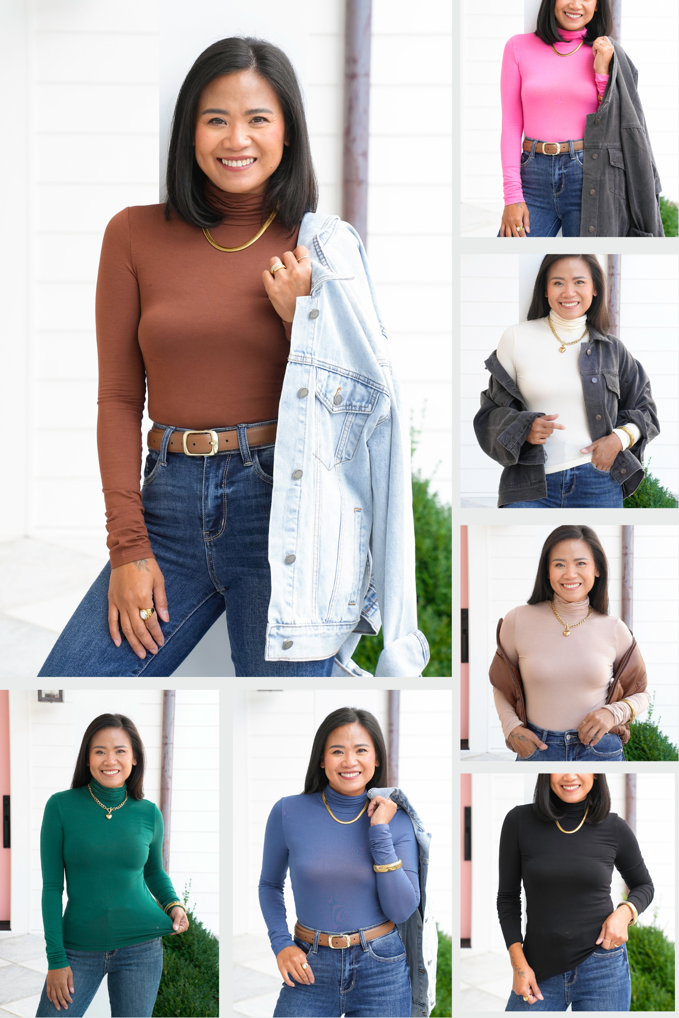 This fitted turtleneck is the definition of chic layering. Lightweight with a touch of stretch, it’s perfect under blazers, cardigans, or vests—but just as stylish worn solo with jeans or skirts. With so many colors to choose from, it’s the piece you’ll keep reaching for to build endless looks.