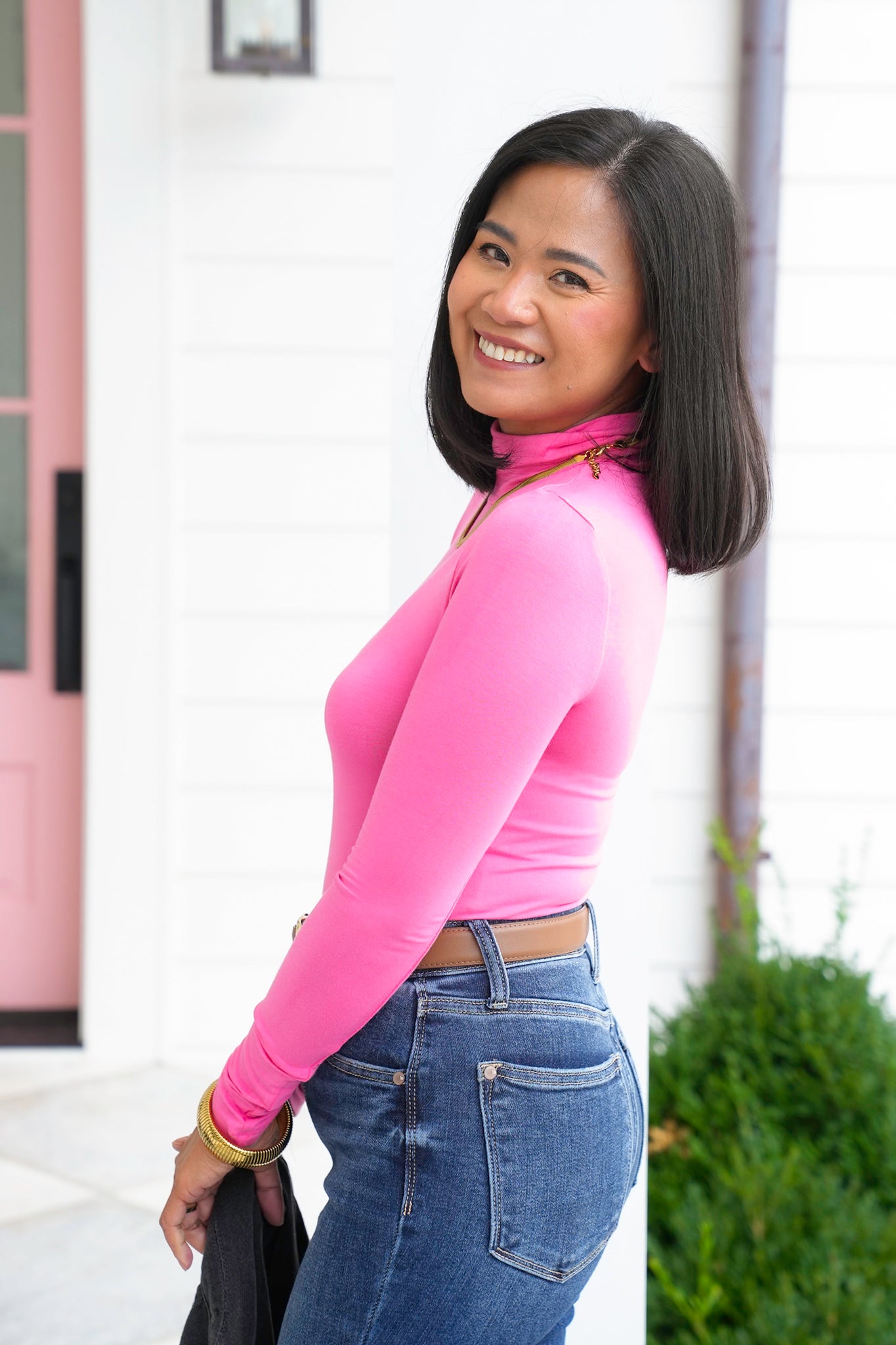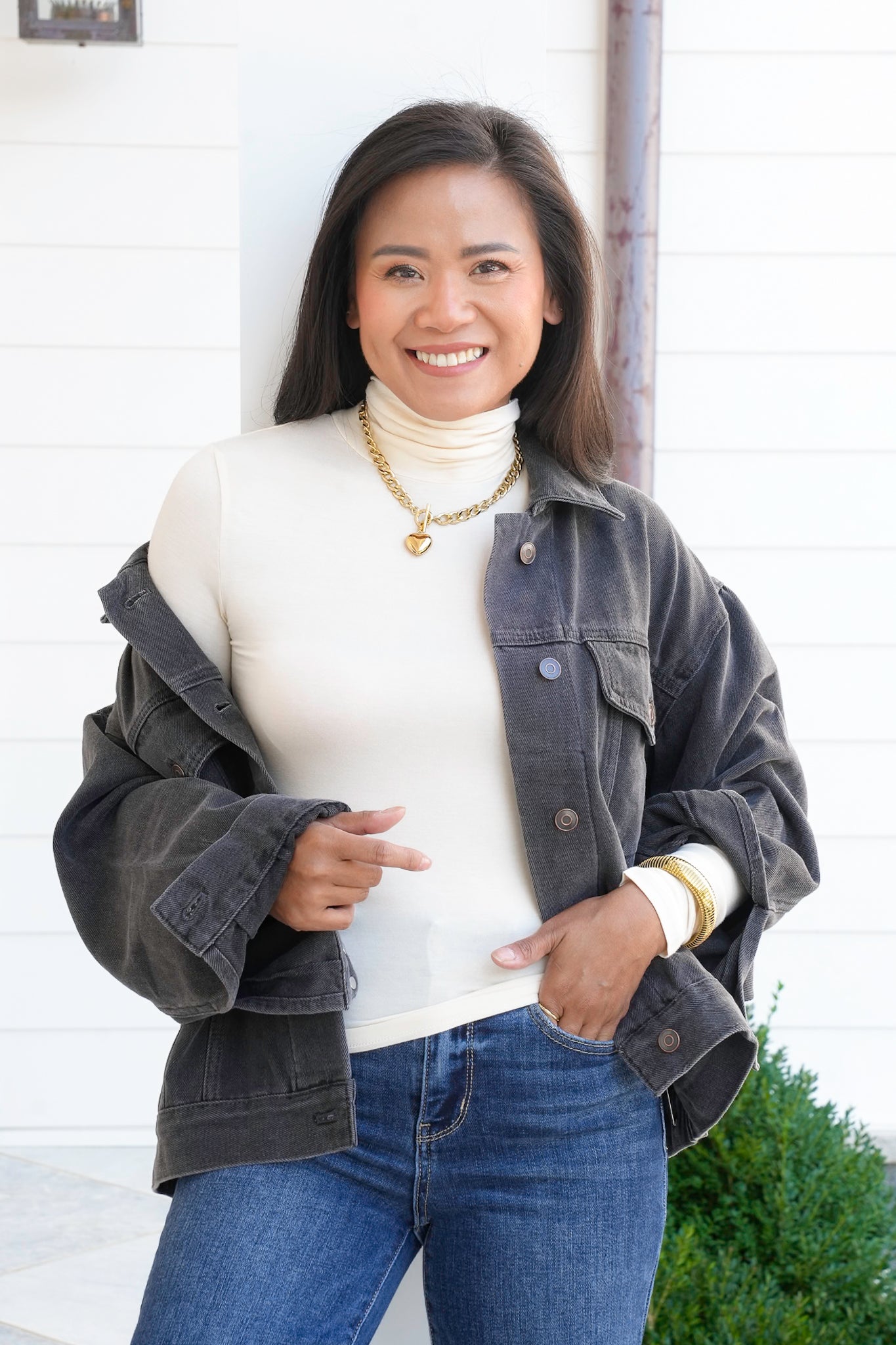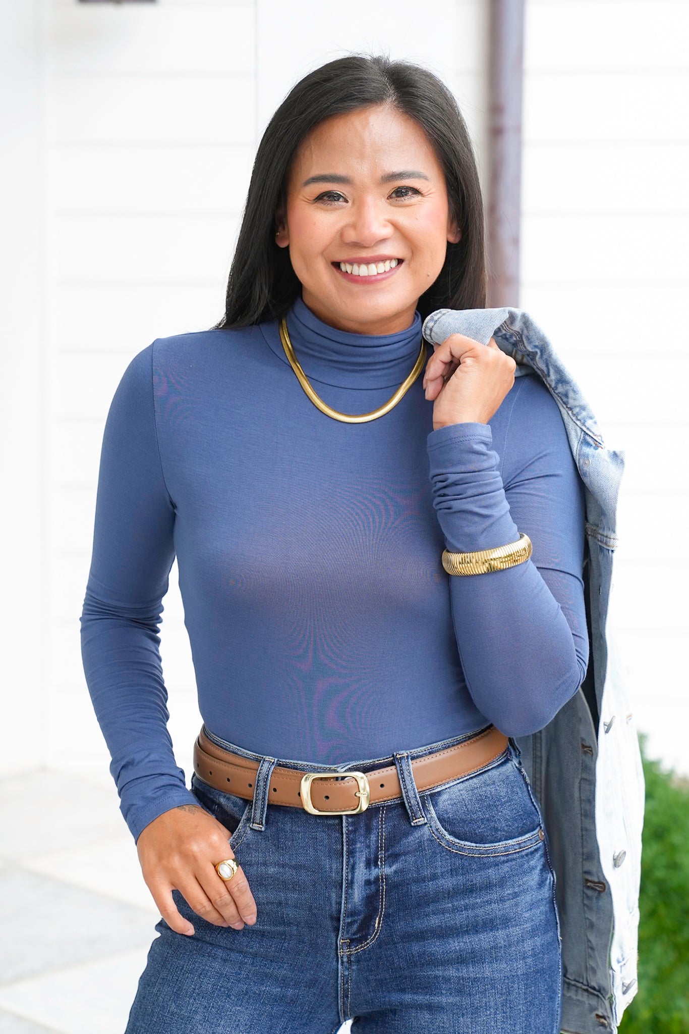 This fitted turtleneck is the definition of chic layering. Lightweight with a touch of stretch, it’s perfect under blazers, cardigans, or vests—but just as stylish worn solo with jeans or skirts. With so many colors to choose from, it’s the piece you’ll keep reaching for to build endless looks.