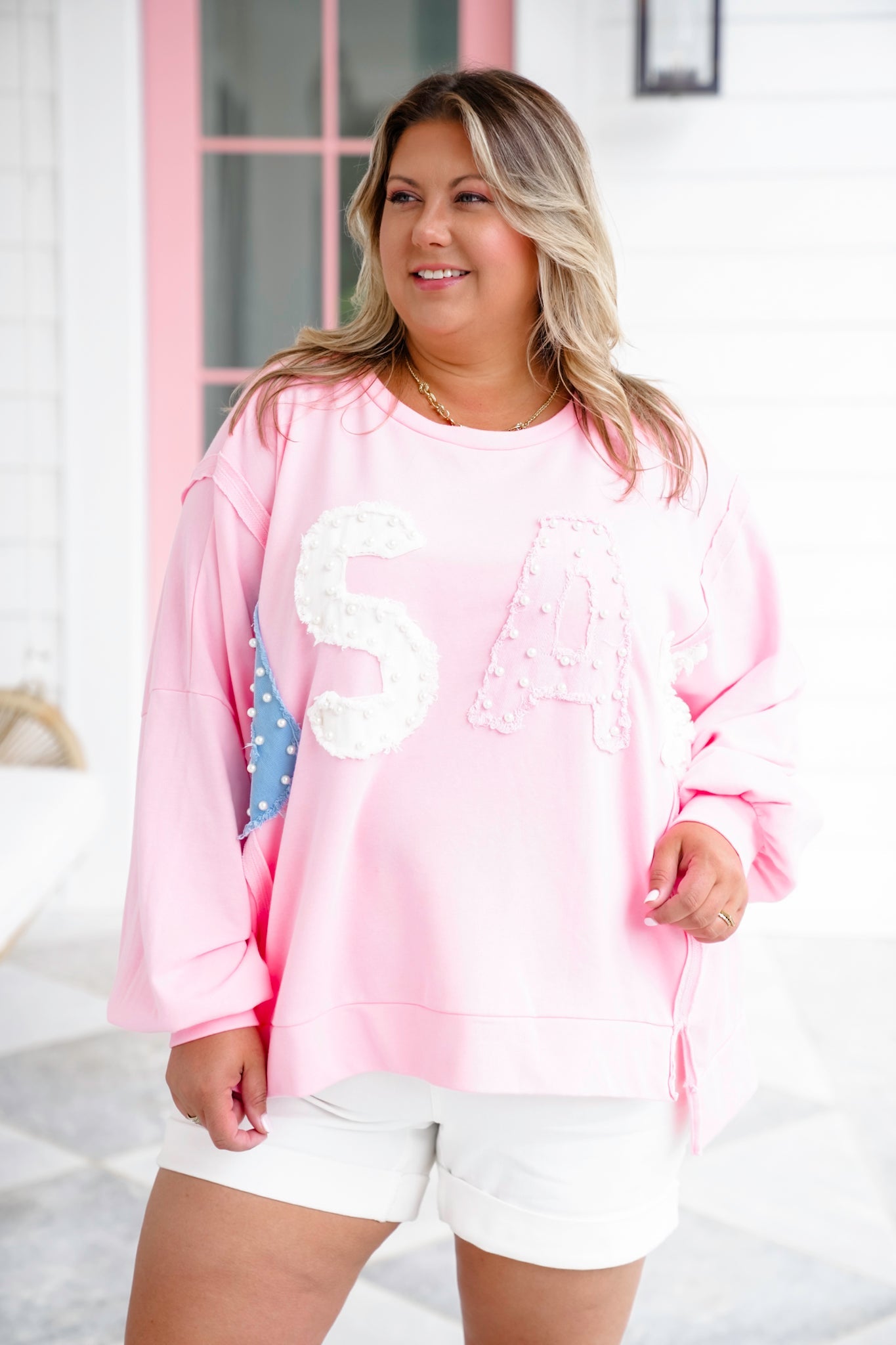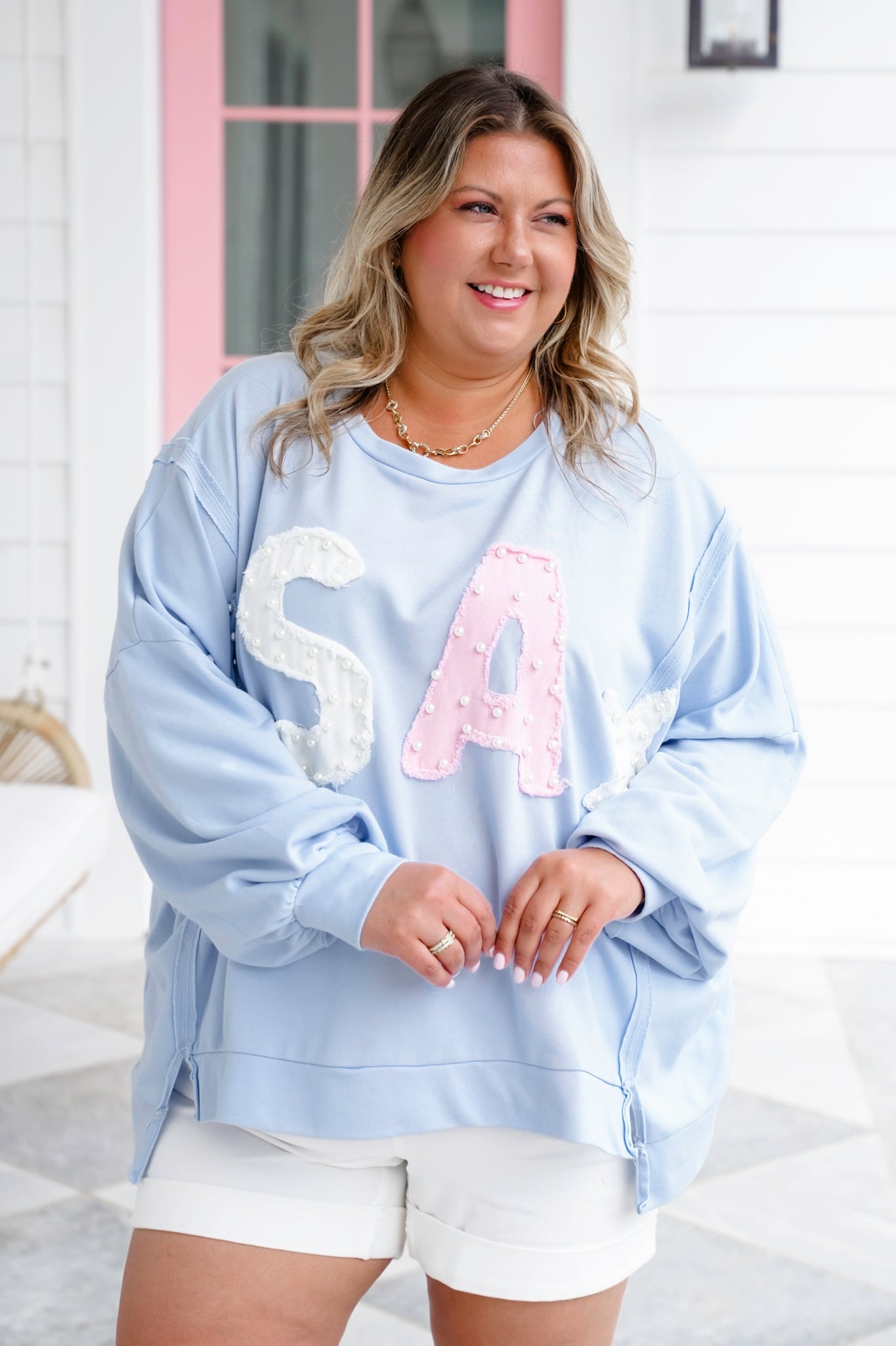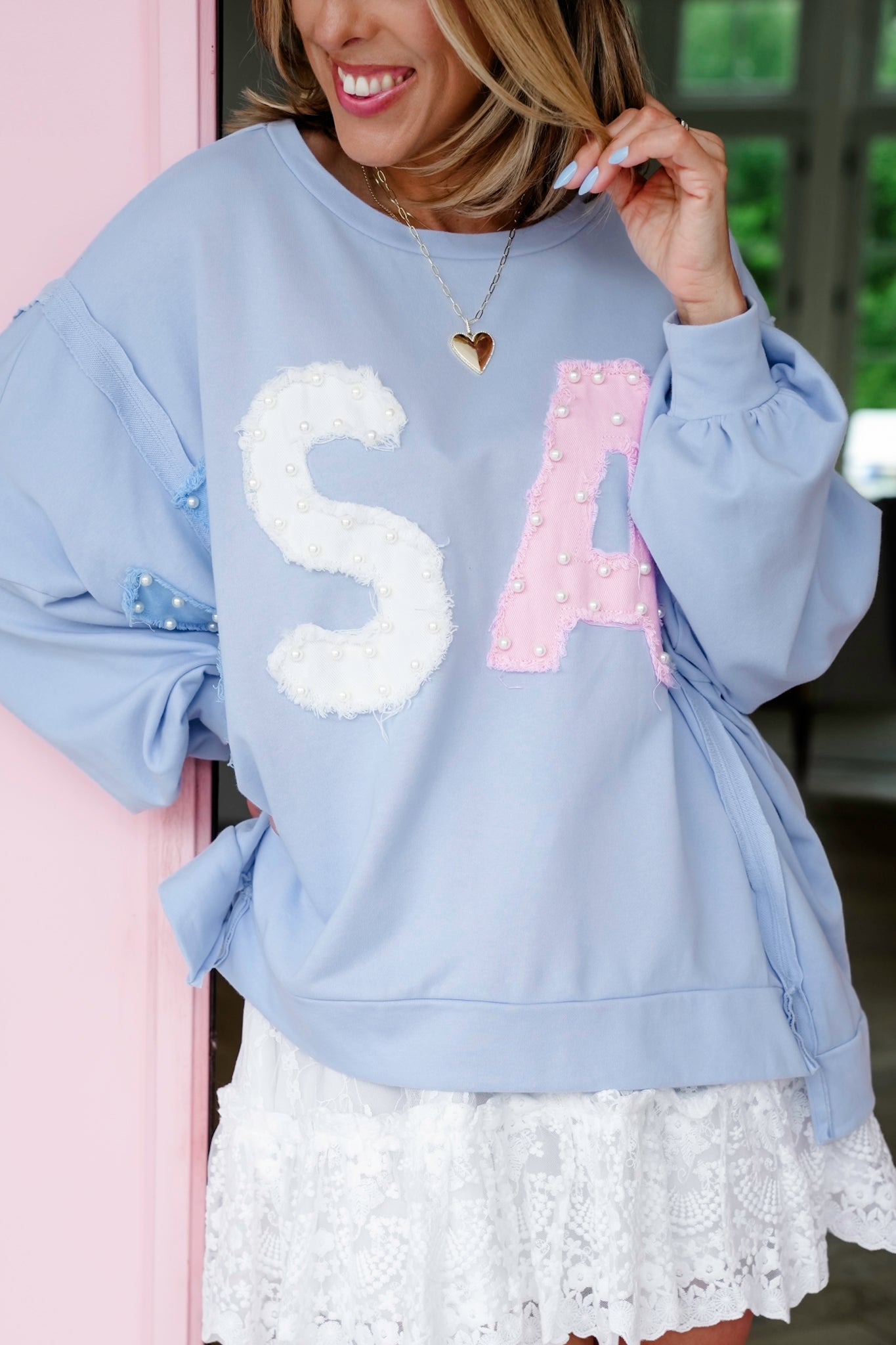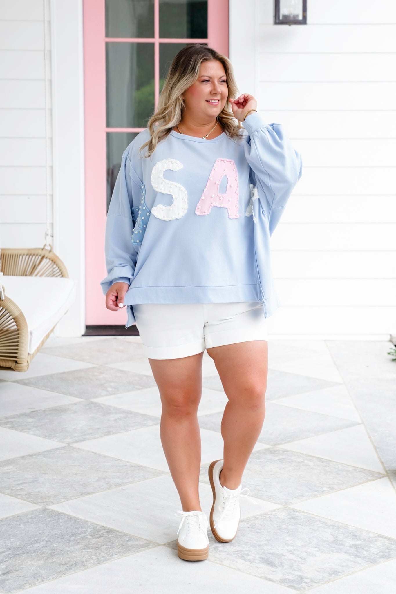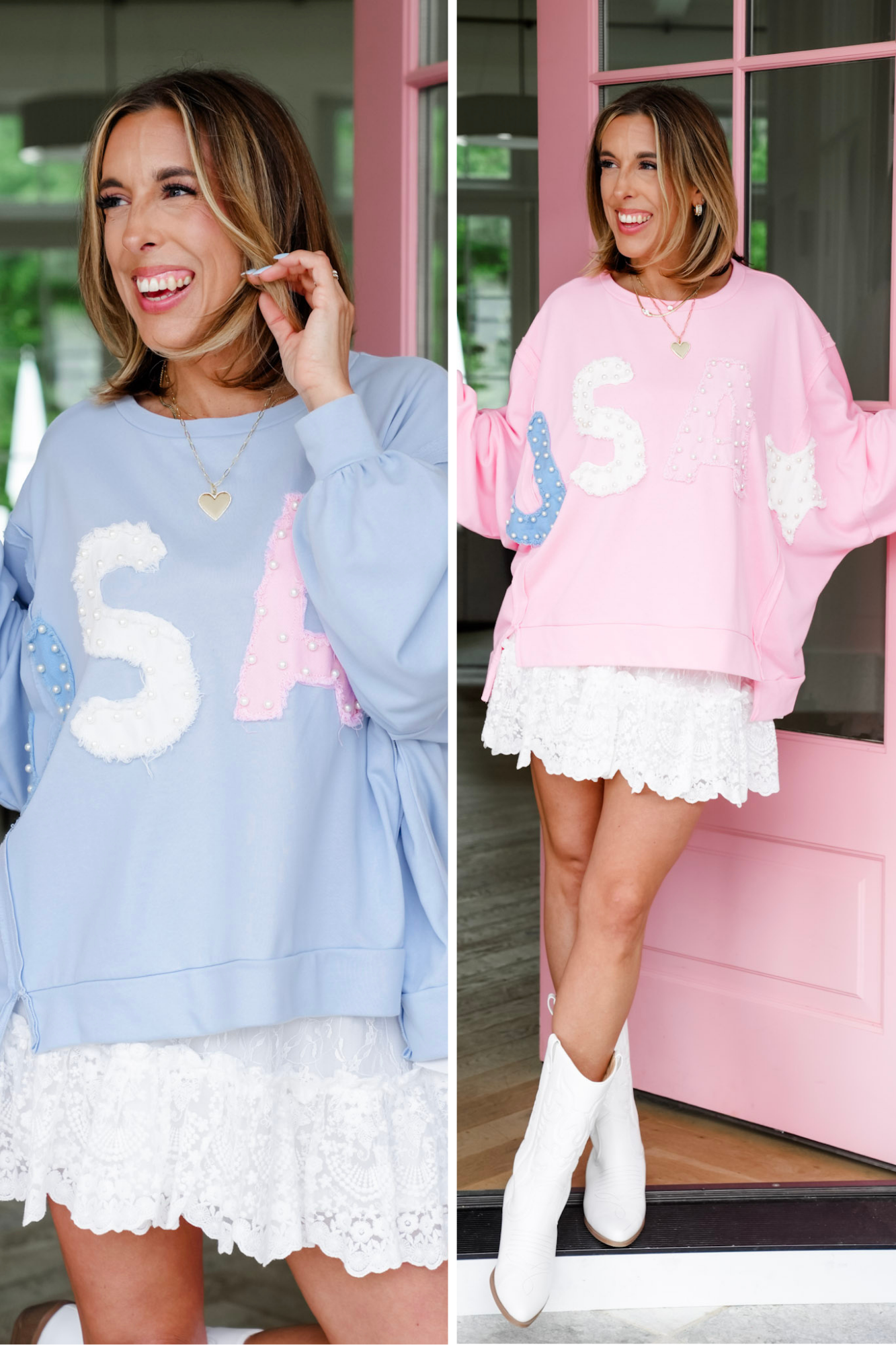 Long Sleeve "USA" Patch Pullover with Pearl Detail