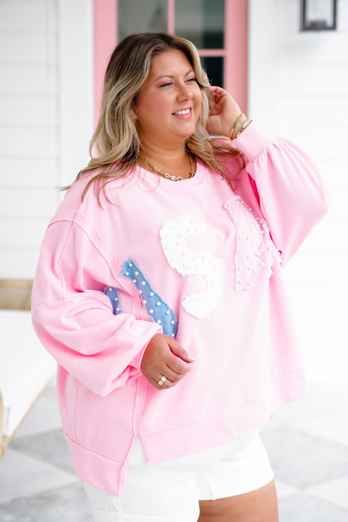 Your cozy Americana moment just got a glam upgrade. This oversized pullover features playful 3D “USA” lettering with pearl embellishments and mixed-pattern fabric that keeps it sweet but bold. Pair it with biker shorts or a pleated mini skirt for a preppy, comfy combo.