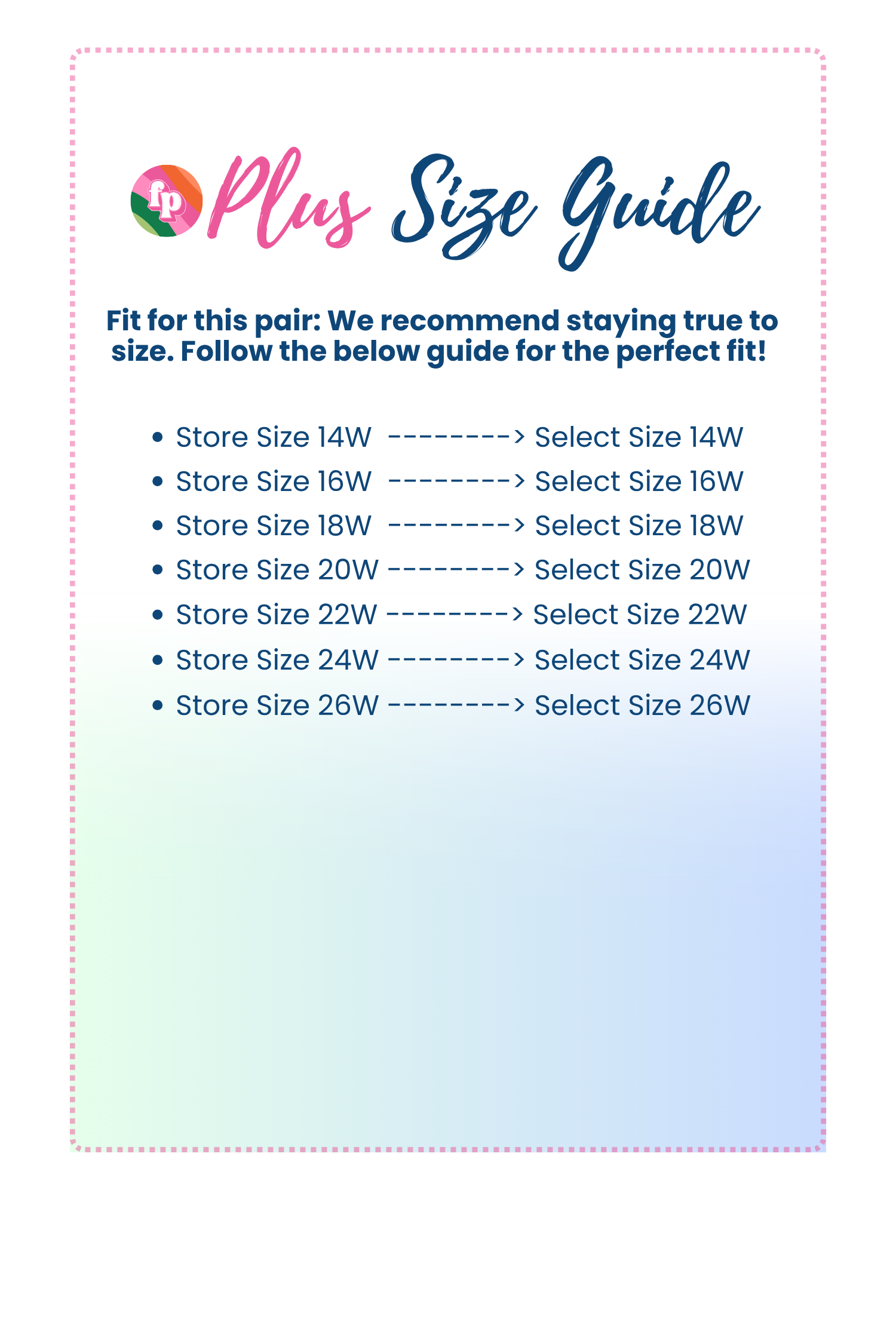 Plus (sizes 14W-24W): Stay with your true size for that perfect fit.