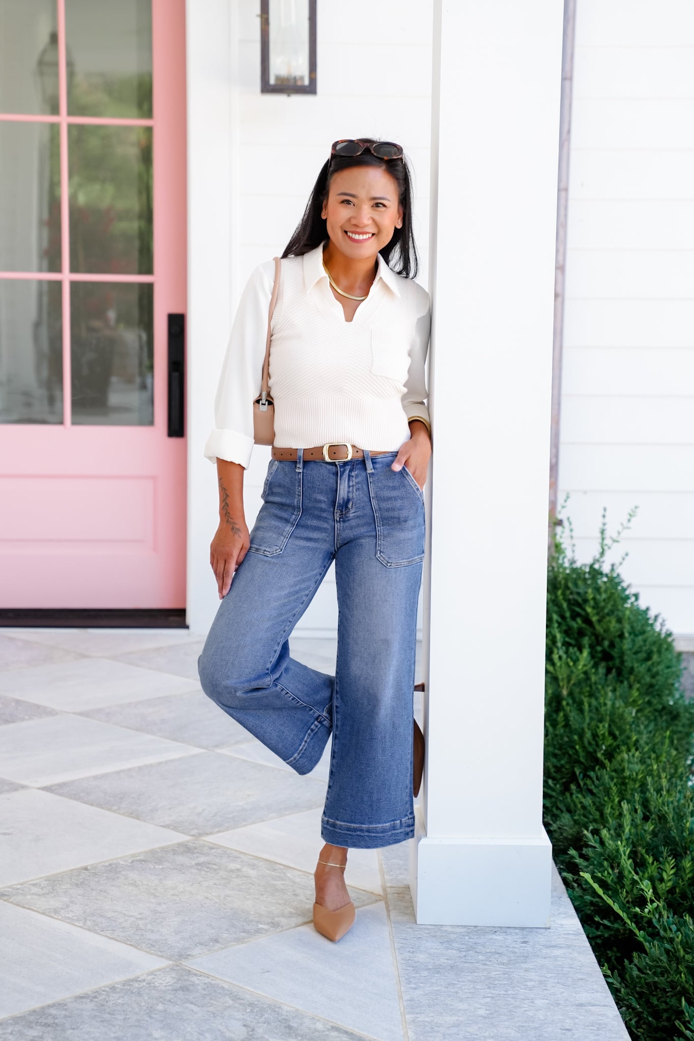 These Lovervet wide leg jeans are where polish meets comfort. The high rise design gives a flattering fit through the waist and hips, while the wide leg silhouette flows into a clean trouser hem that instantly elevates your outfit. The utility pocket detail adds just the right amount of edge without sacrificing versatility.