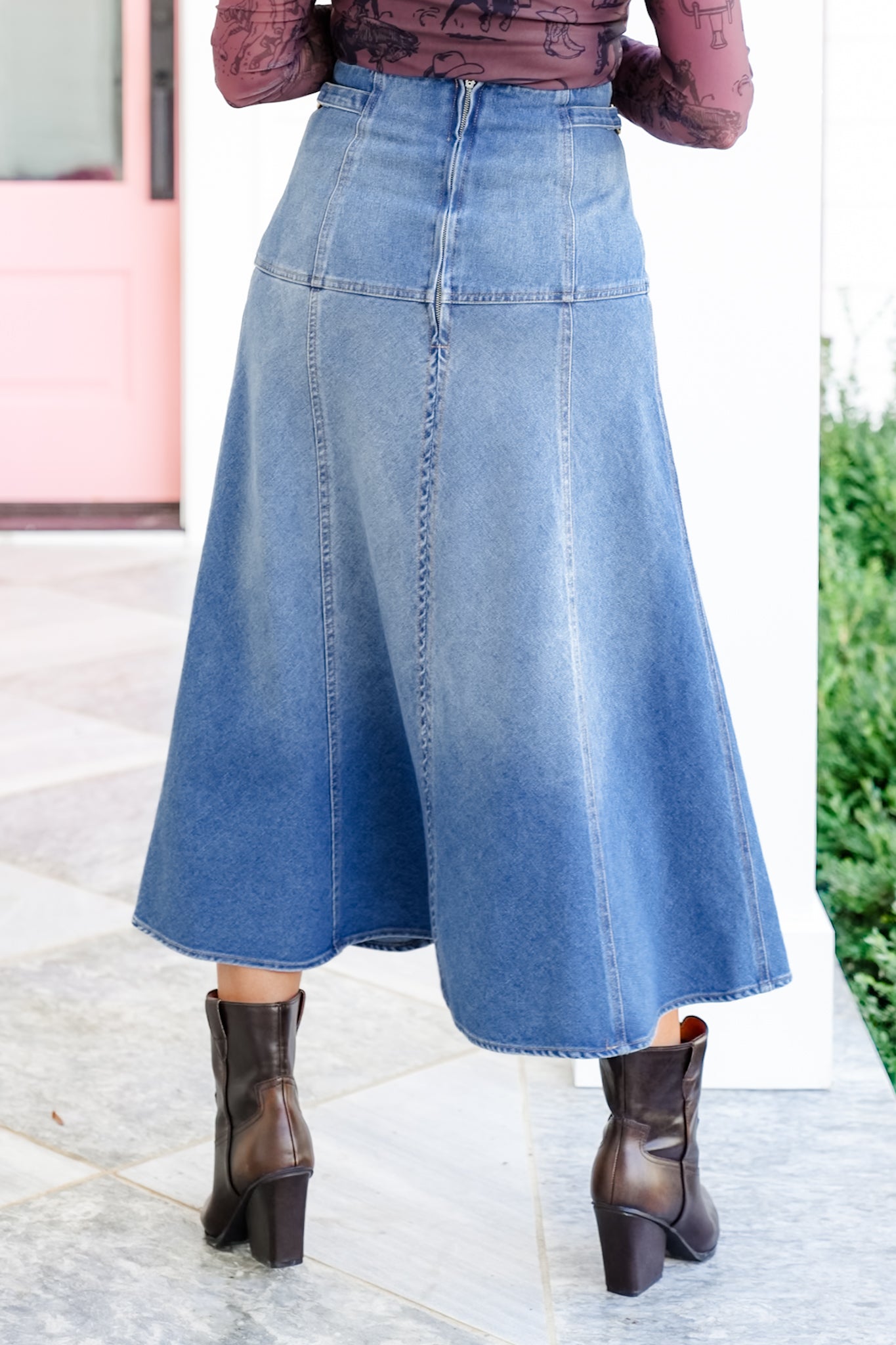 This midi skirt brings a confident, pulled-together denim look with its high waist and structured shape. The clean medium wash keeps it incredibly versatile, while the buckle details add that extra style moment everyone is loving right now! It pairs beautifully with fitted knits, tucked-in blouses, or layered sweaters and boots.
