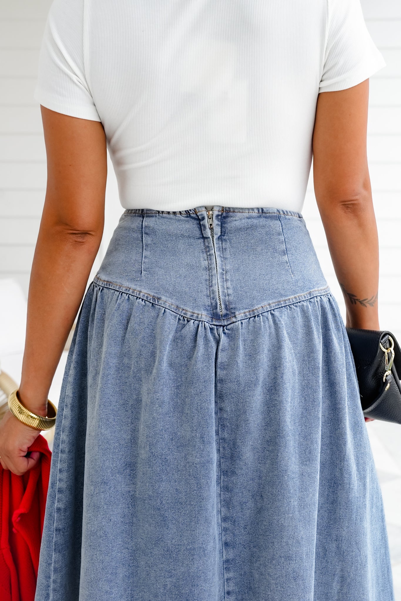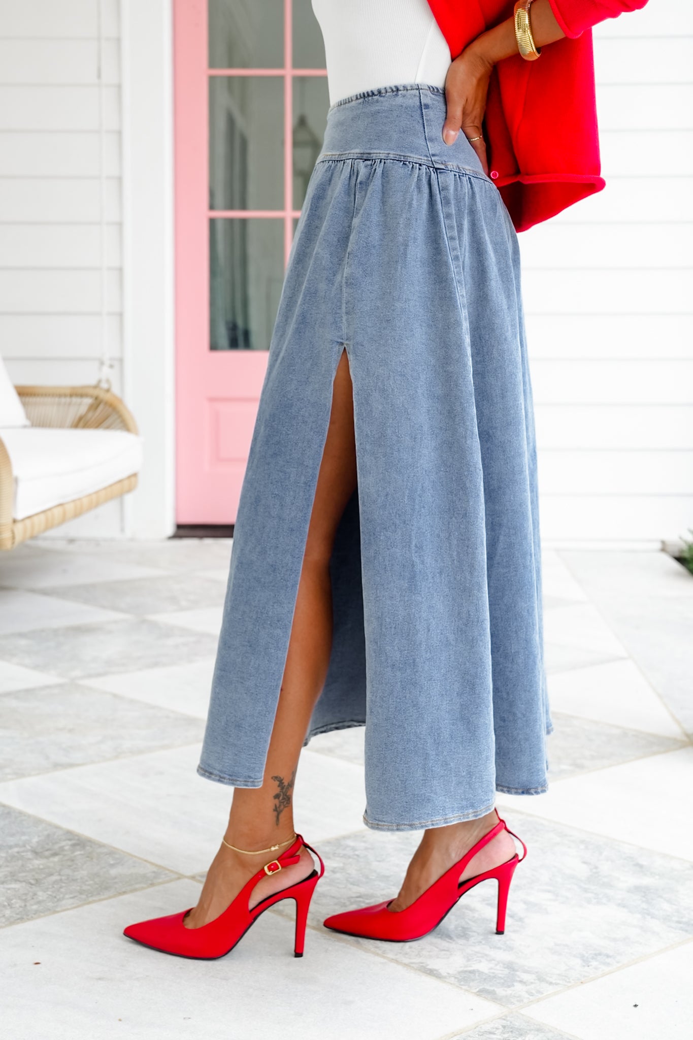 This denim midi skirt brings timeless style with a fresh edge. The side slit detail adds just the right amount of sass, making it perfect to dress up with heels and a fitted blouse or keep casual with sneakers and a graphic tee. You’ll find yourself reaching for it over and over—it’s versatile, stylish, and so easy to wear year-round.