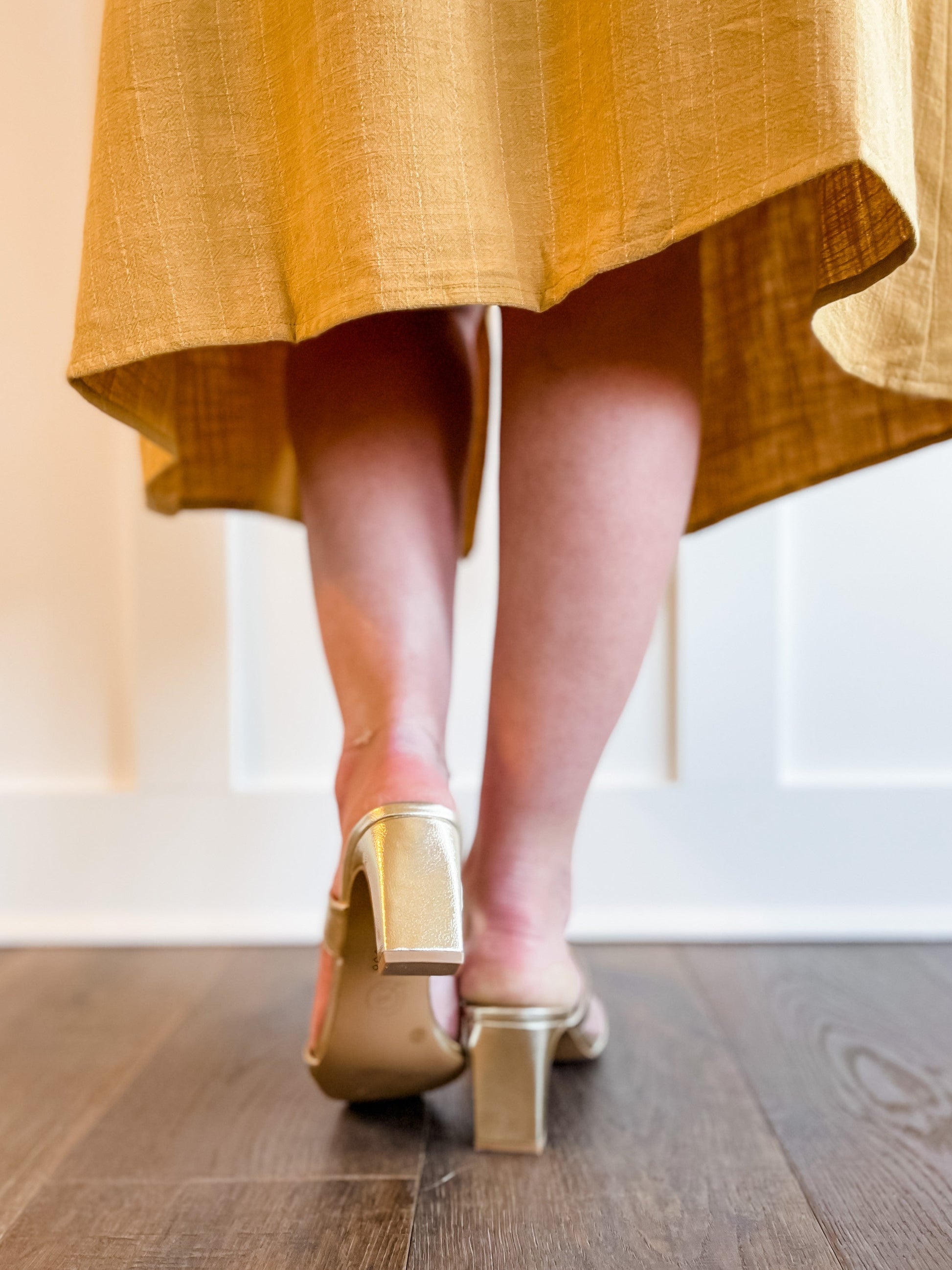 Metallic Light Gold Heeled Double Strap Slide In Sandals