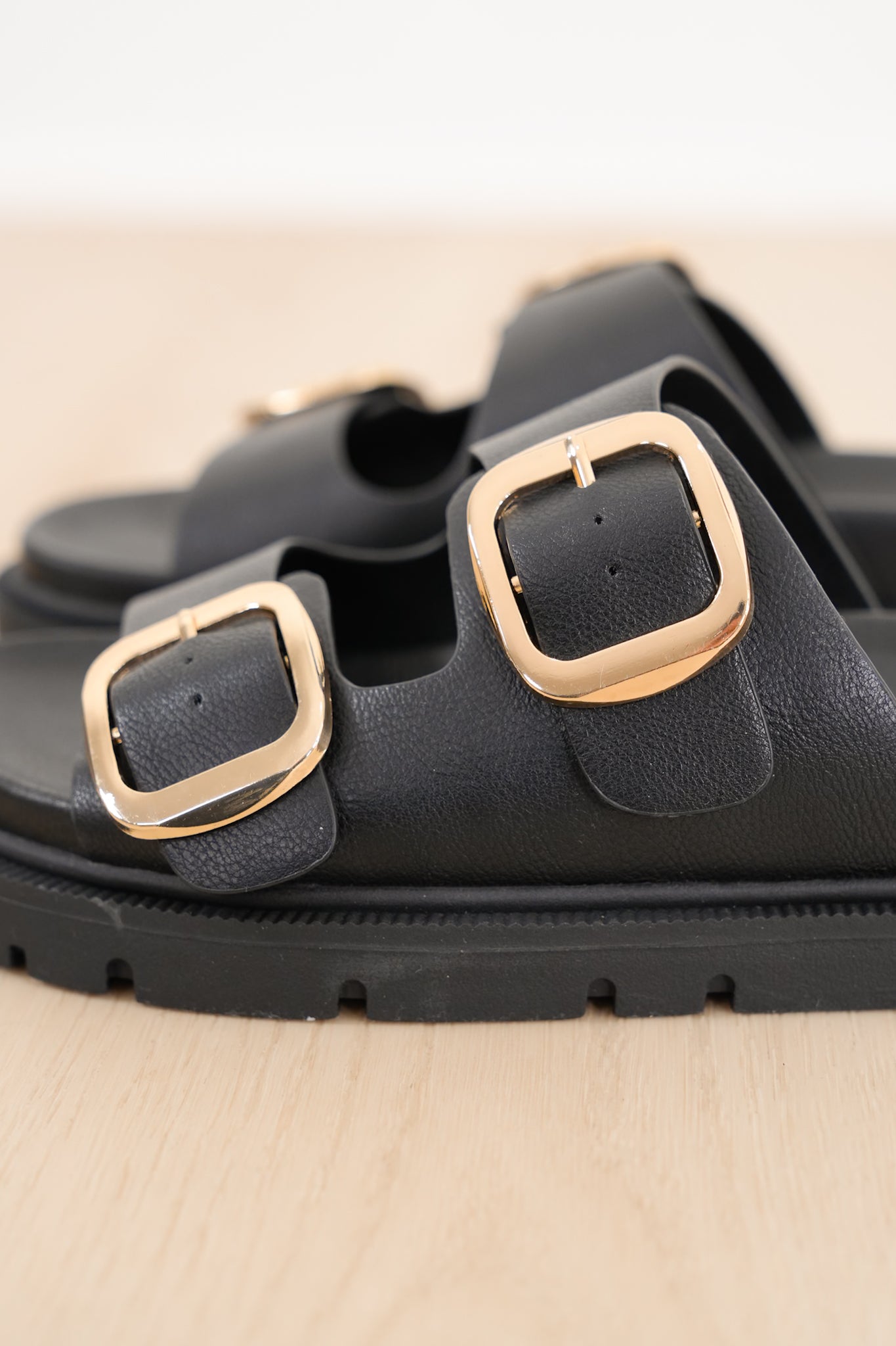 Bold, modern, and made to be noticed. This double buckle platform slide brings major style with sleek vegan leather straps and oversized gold hardware that instantly elevates any outfit. Lightweight, flexible, and supportive, this is the sandal you’ll grab for everything from casual denim days to breezy dresses.