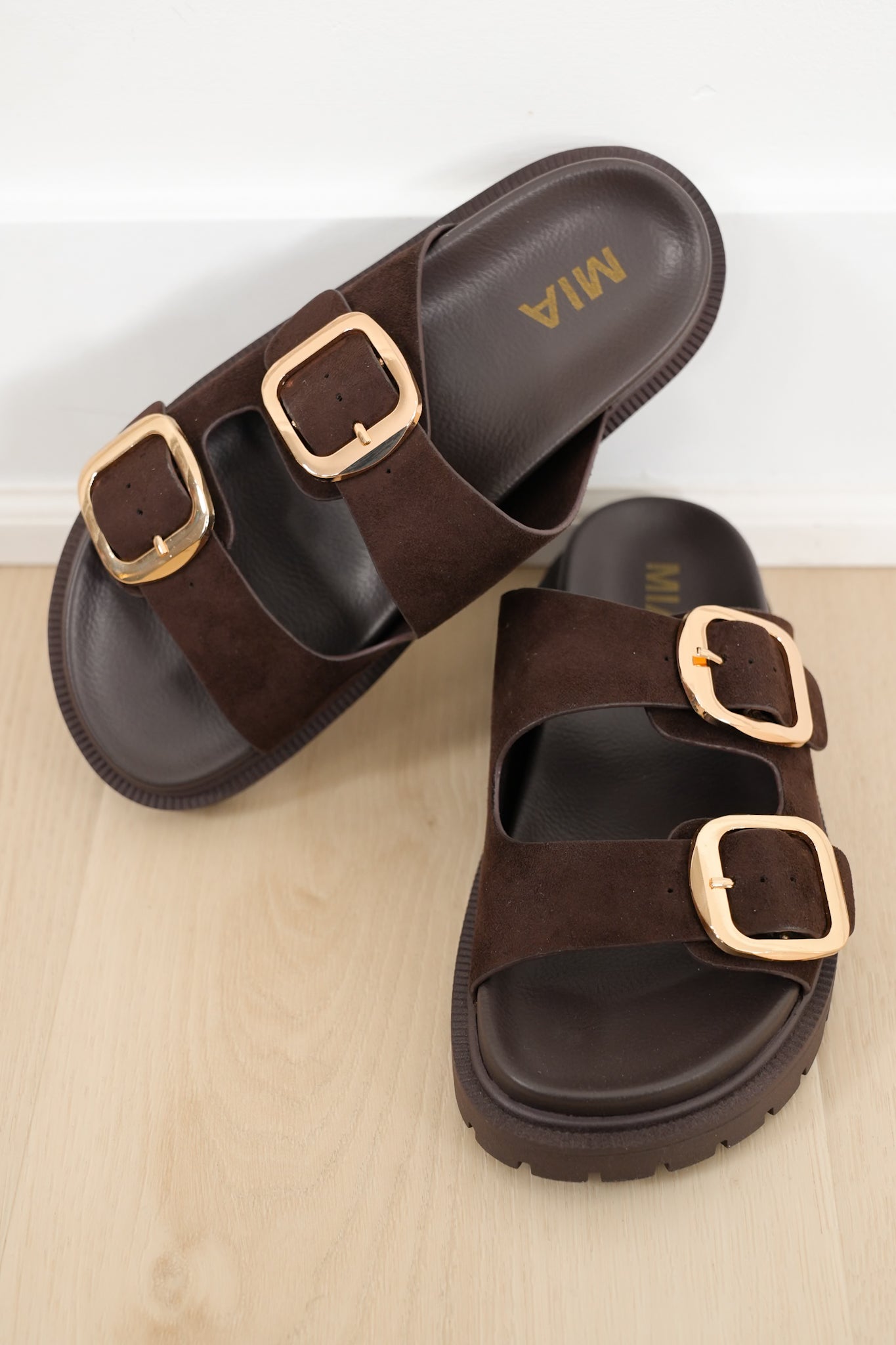 MIA Double Buckle Vegan Suede Platform Slide Sandal