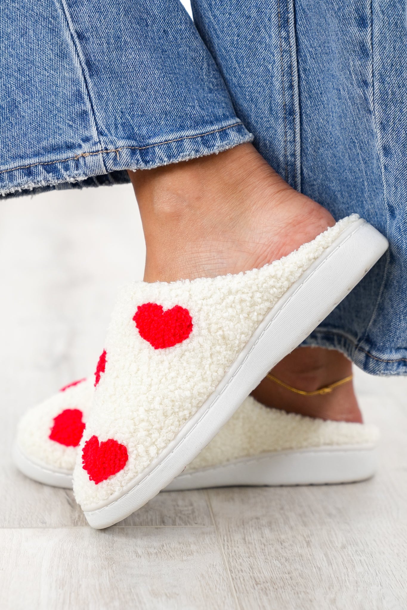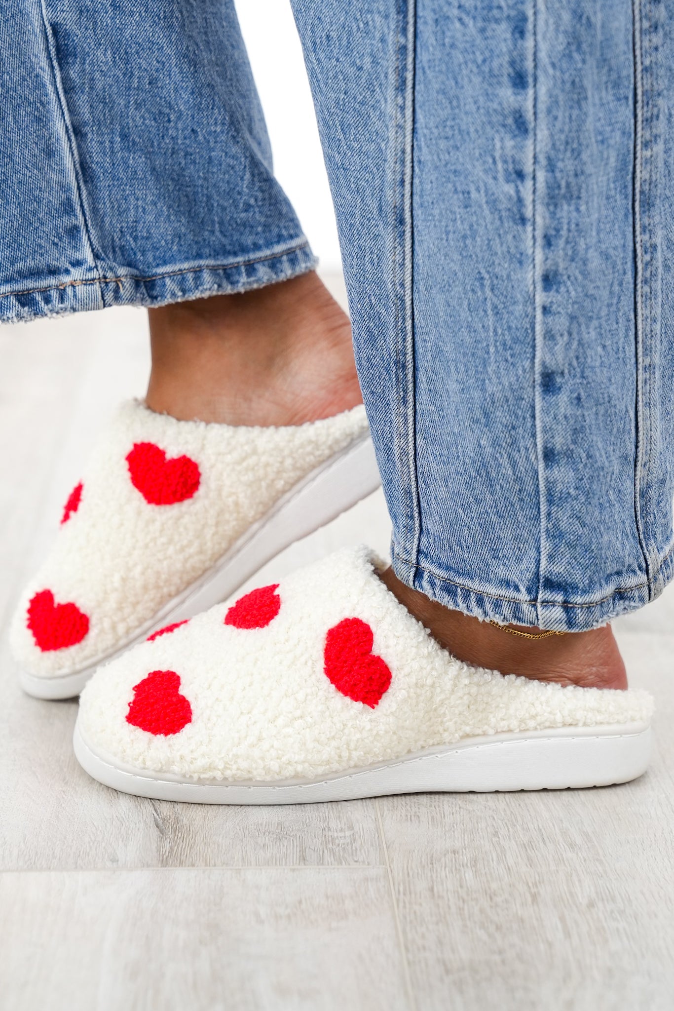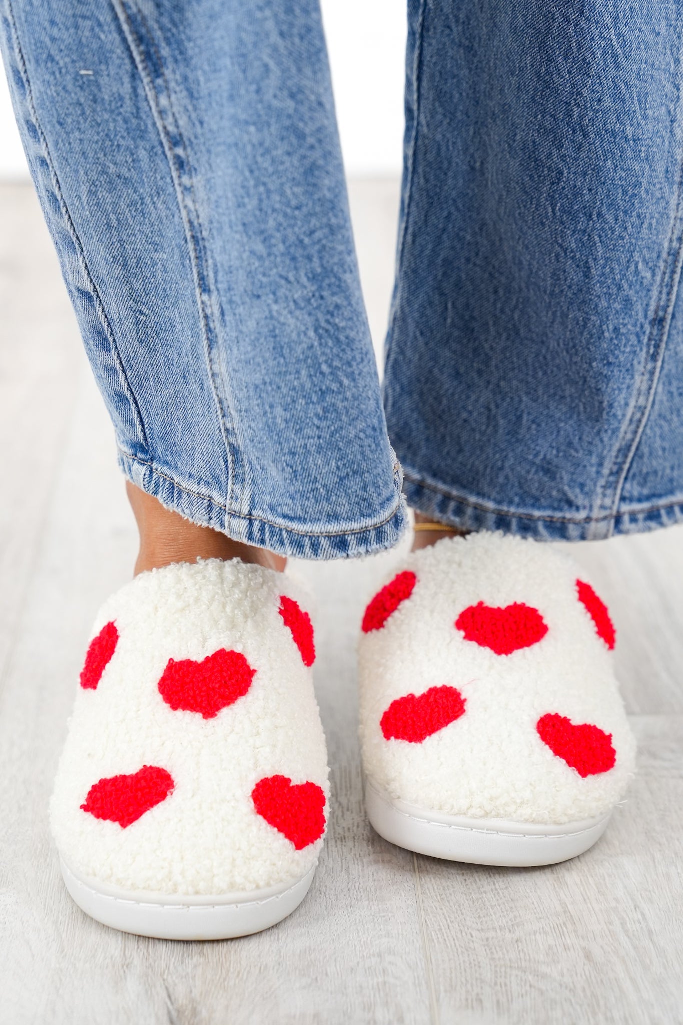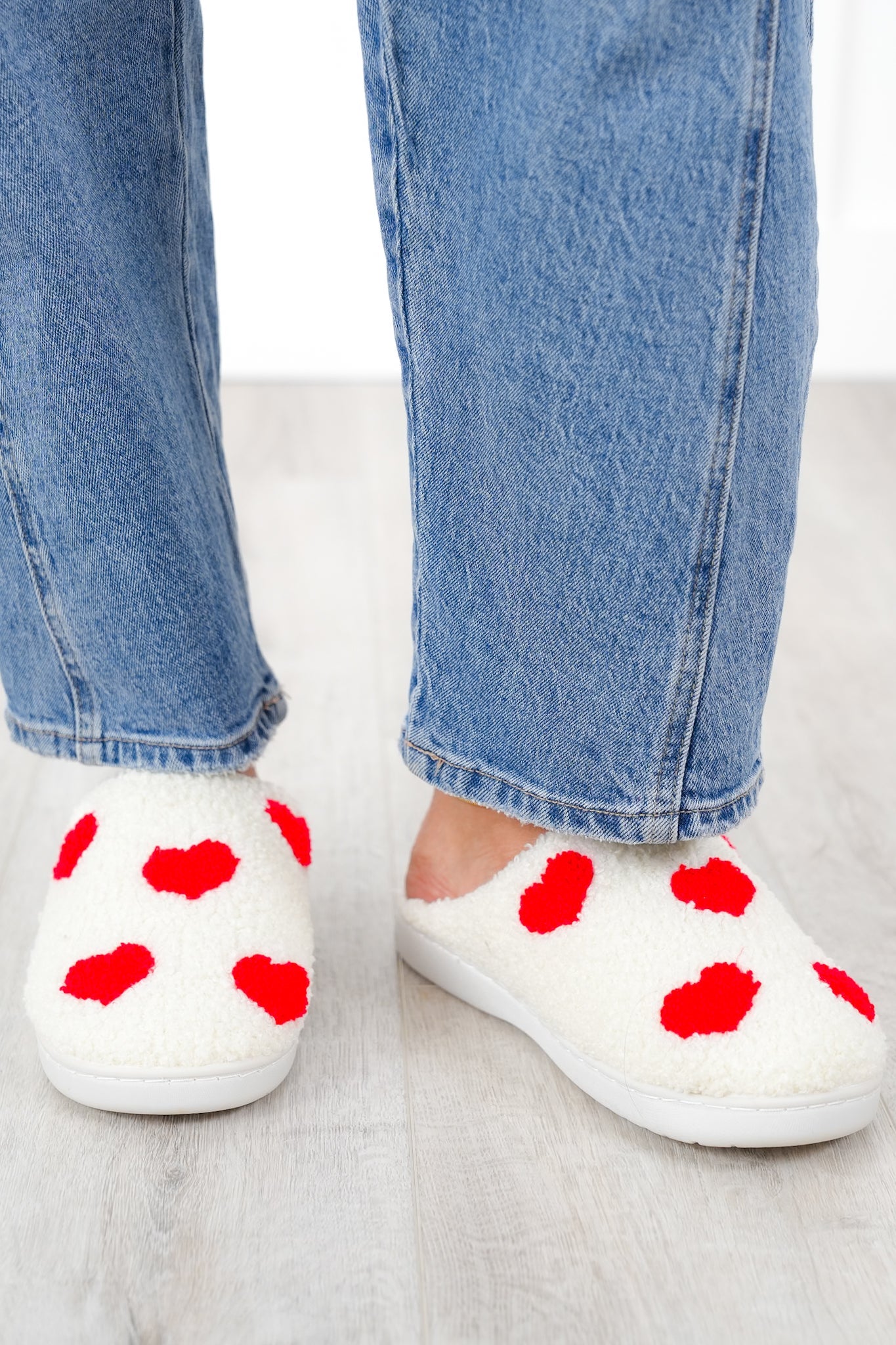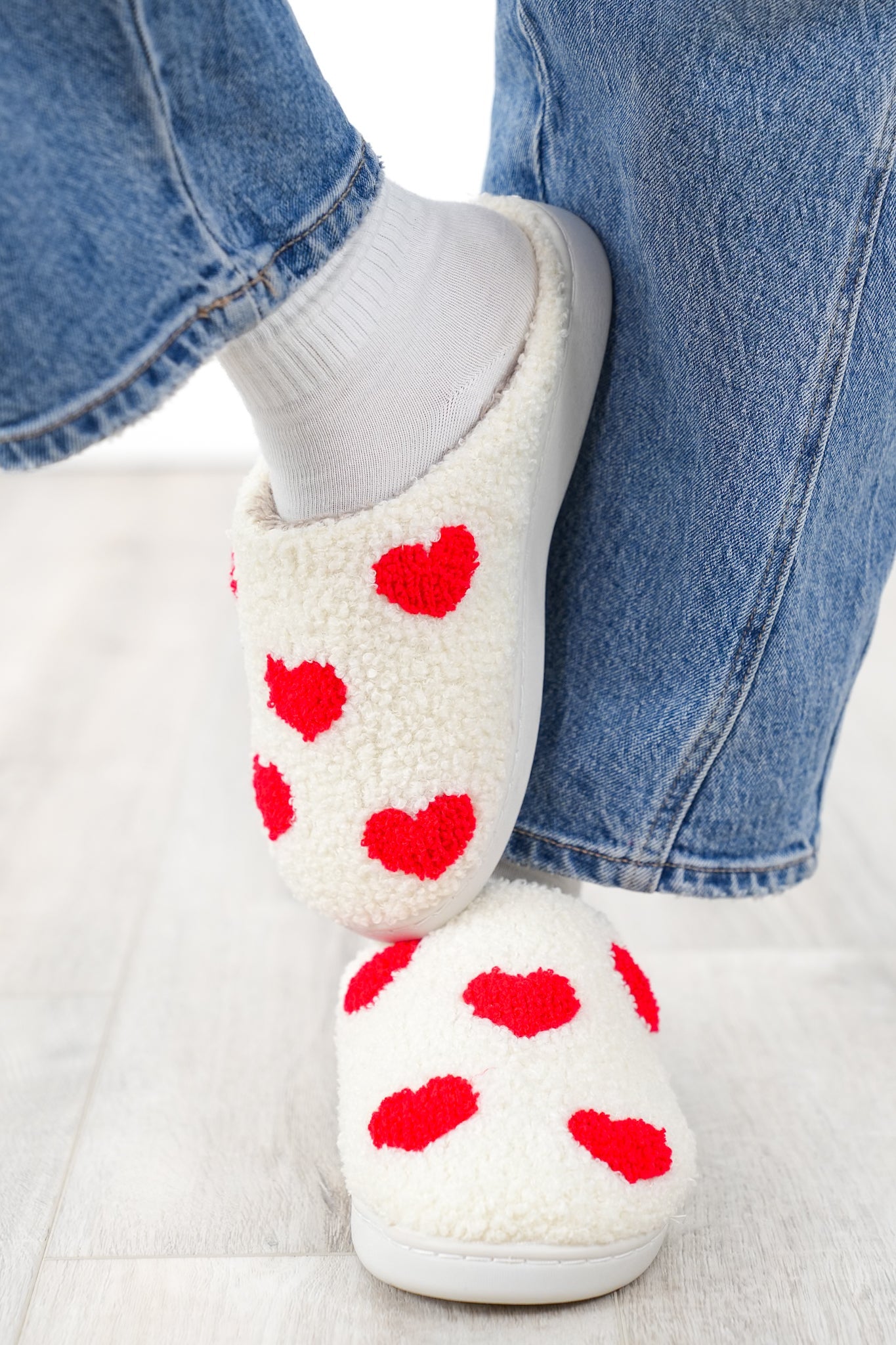 Cozy up in style with these heart-patterned fuzzy slippers that are all about comfort and charm! The soft, sherpa-like material feels like a warm hug for your feet, while the playful red hearts add just the right amount of whimsy.
