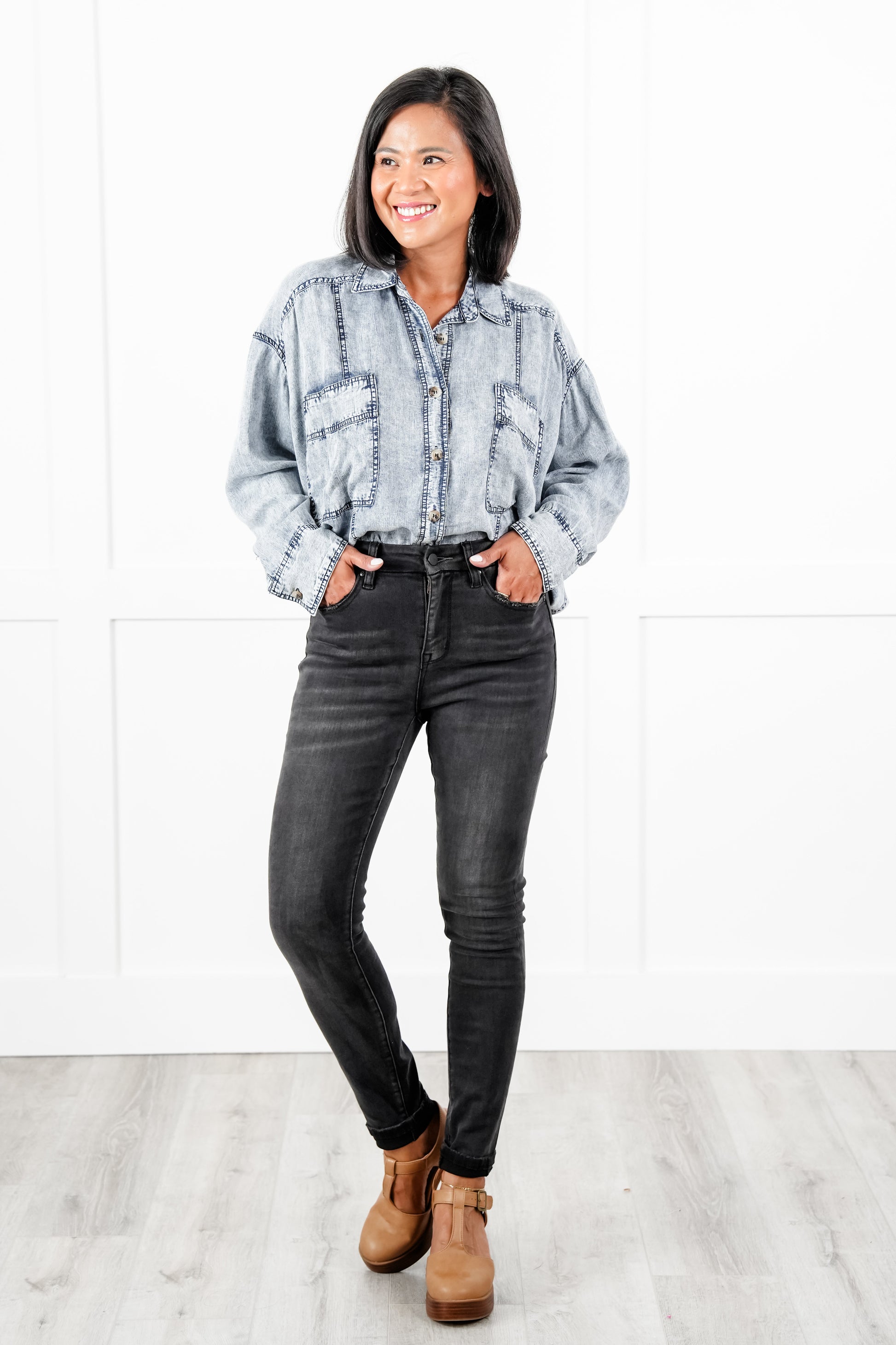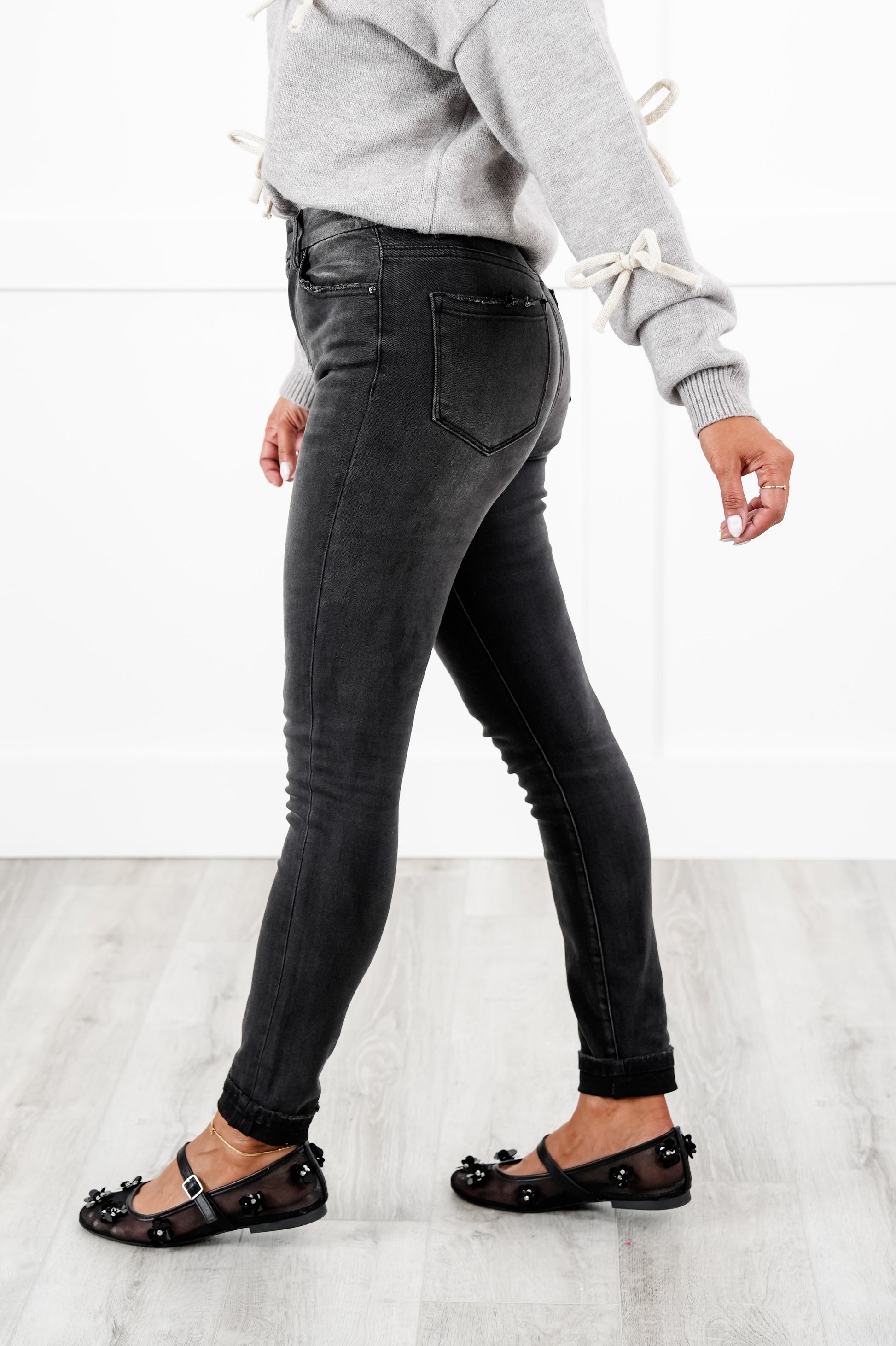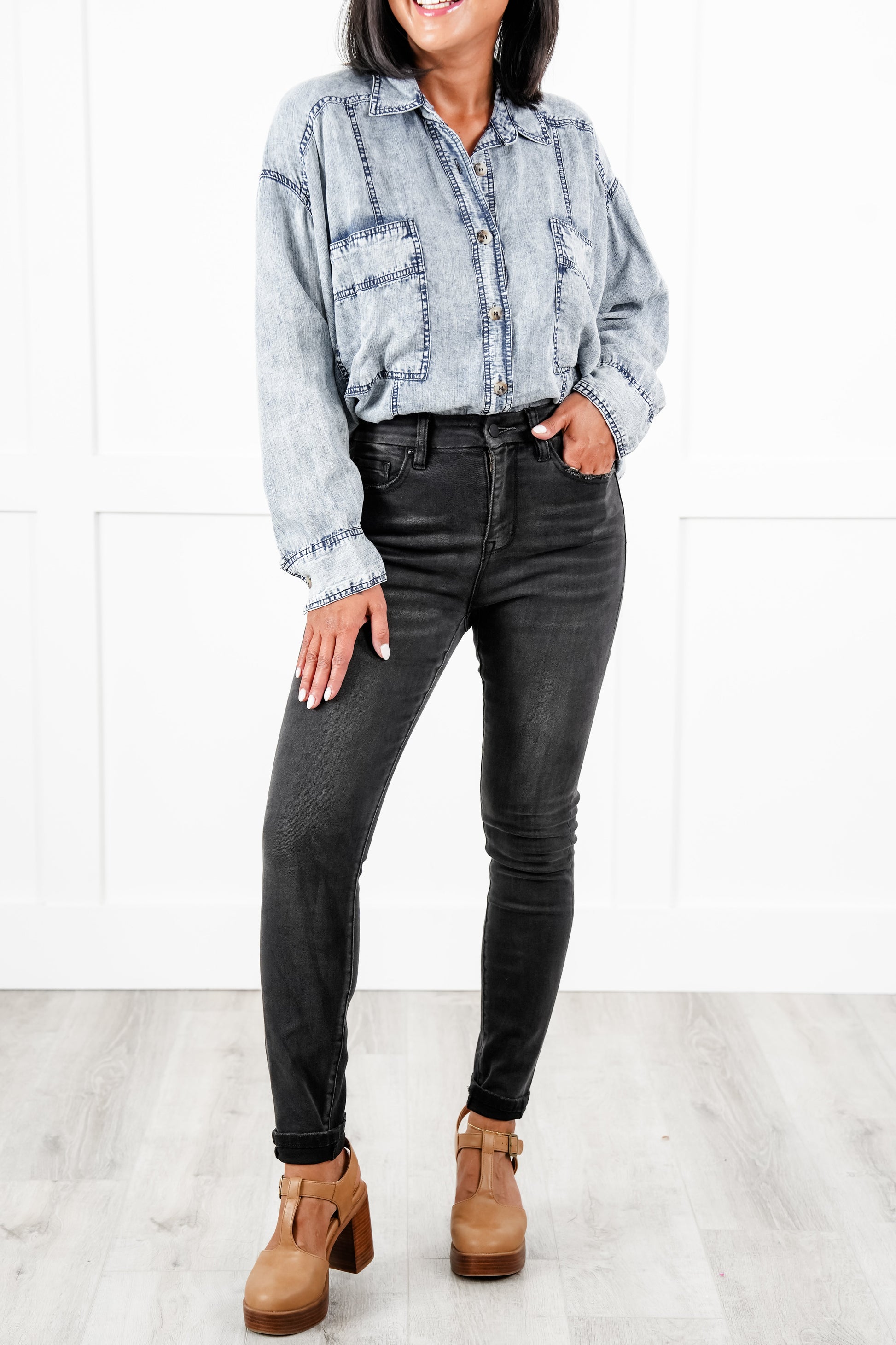 These washed black skinnies are absolute perfection! They are non-distressed with a finished hem... gorgeous! They are so dang flattering! Believe us when we tell you that these will be in heavy rotation all year round, girls!