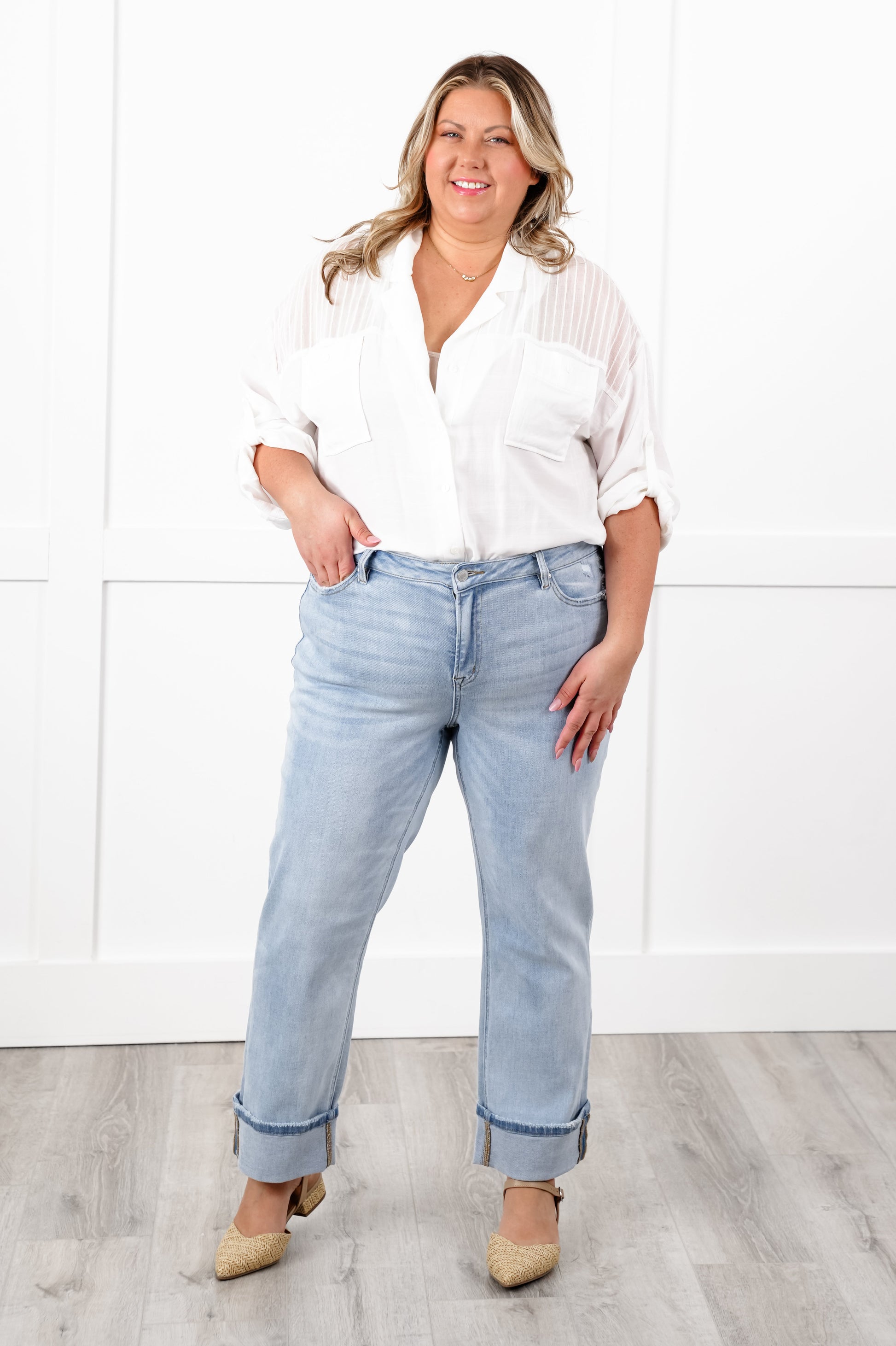 Mica jeans are an absolute must have! This pair is a straight leg cut with a timeless vintage light wash in a mid-rise with a cuffed hem giving them a cool, casual vibe. The cuff gives them a cropped length, and you can uncuff them for added length. They are super stretchy and comfortable with very subtle distressing on the pockets and hem and no distressing in the legs.