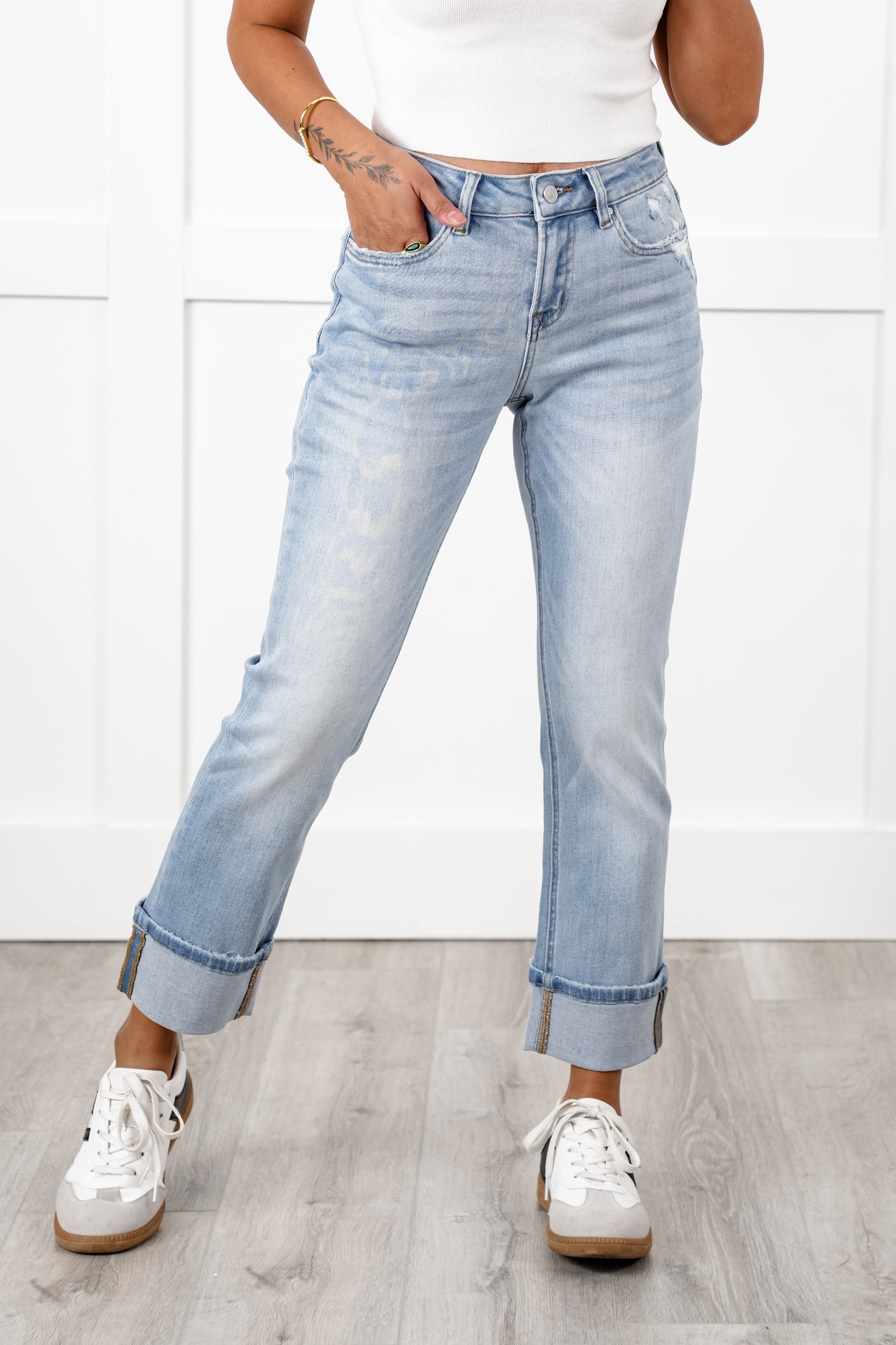 Mica Mid Rise Light Wash Cuffed Straight Leg Jeans