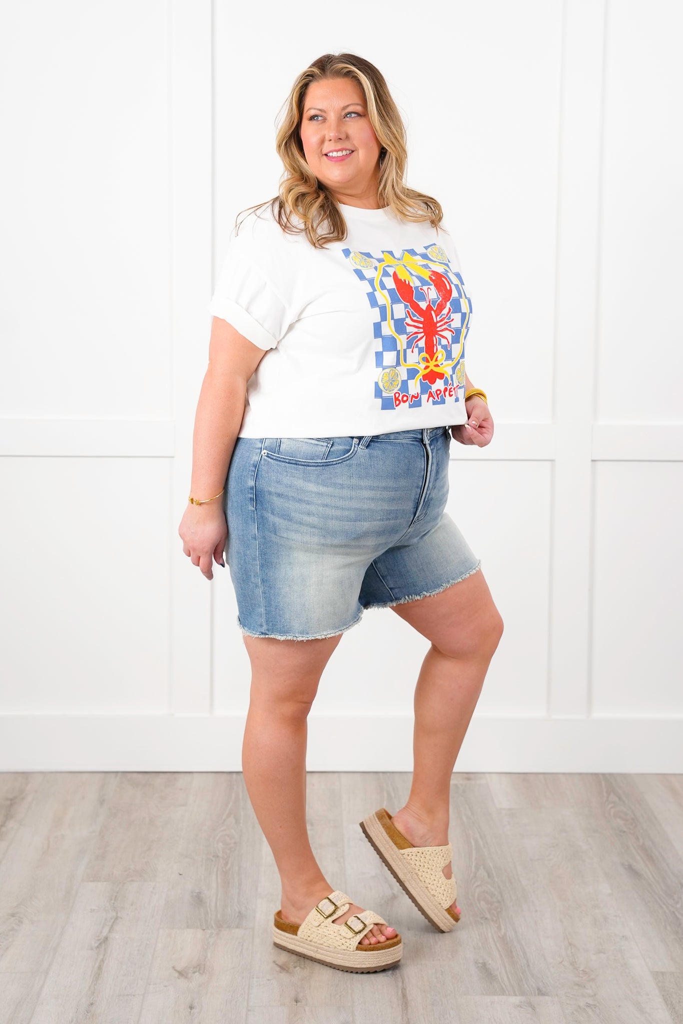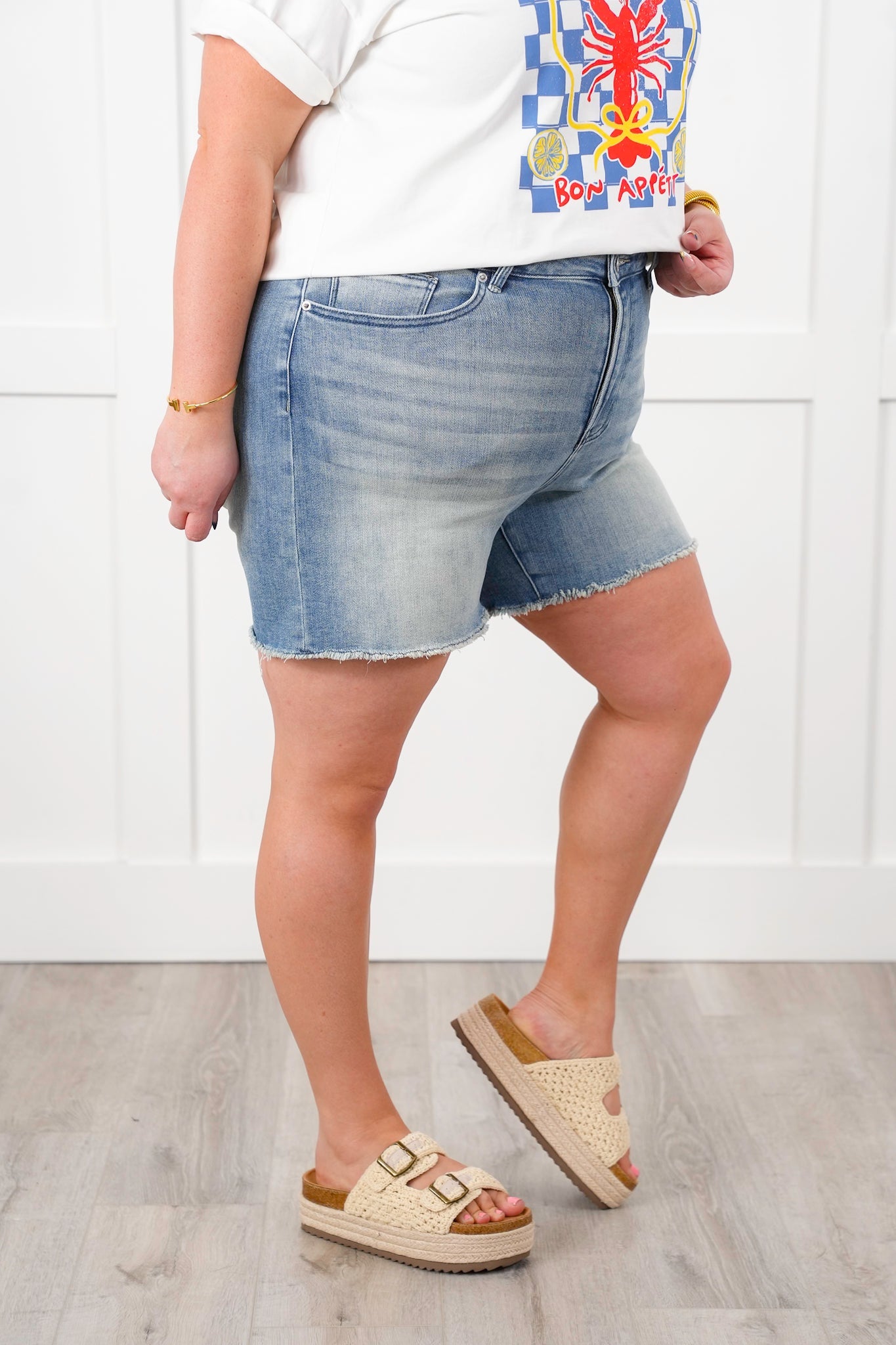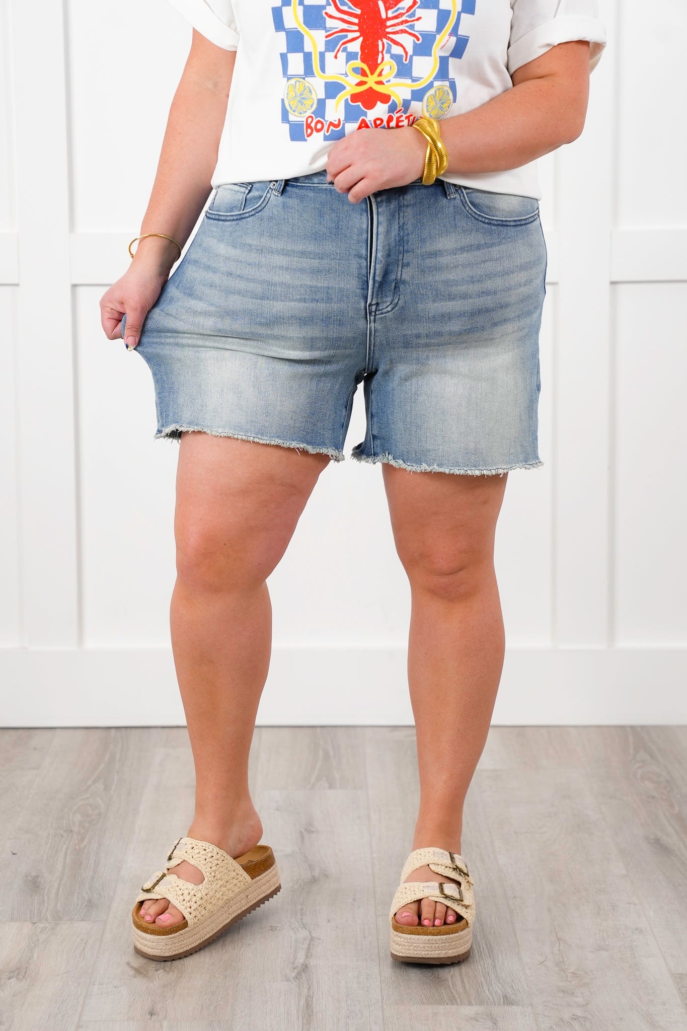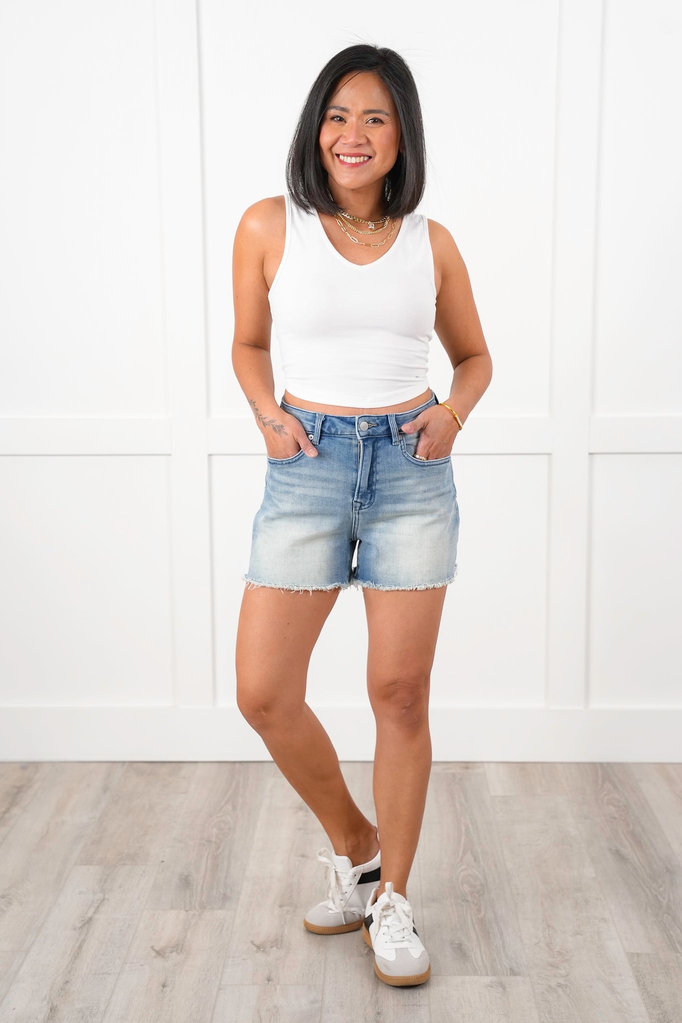 These Mica shorts are magical! They are a high-rise, with a longer inseam and the most beautiful medium wash. The graining is gorgeous and the frayed hem adds a hint of edge.