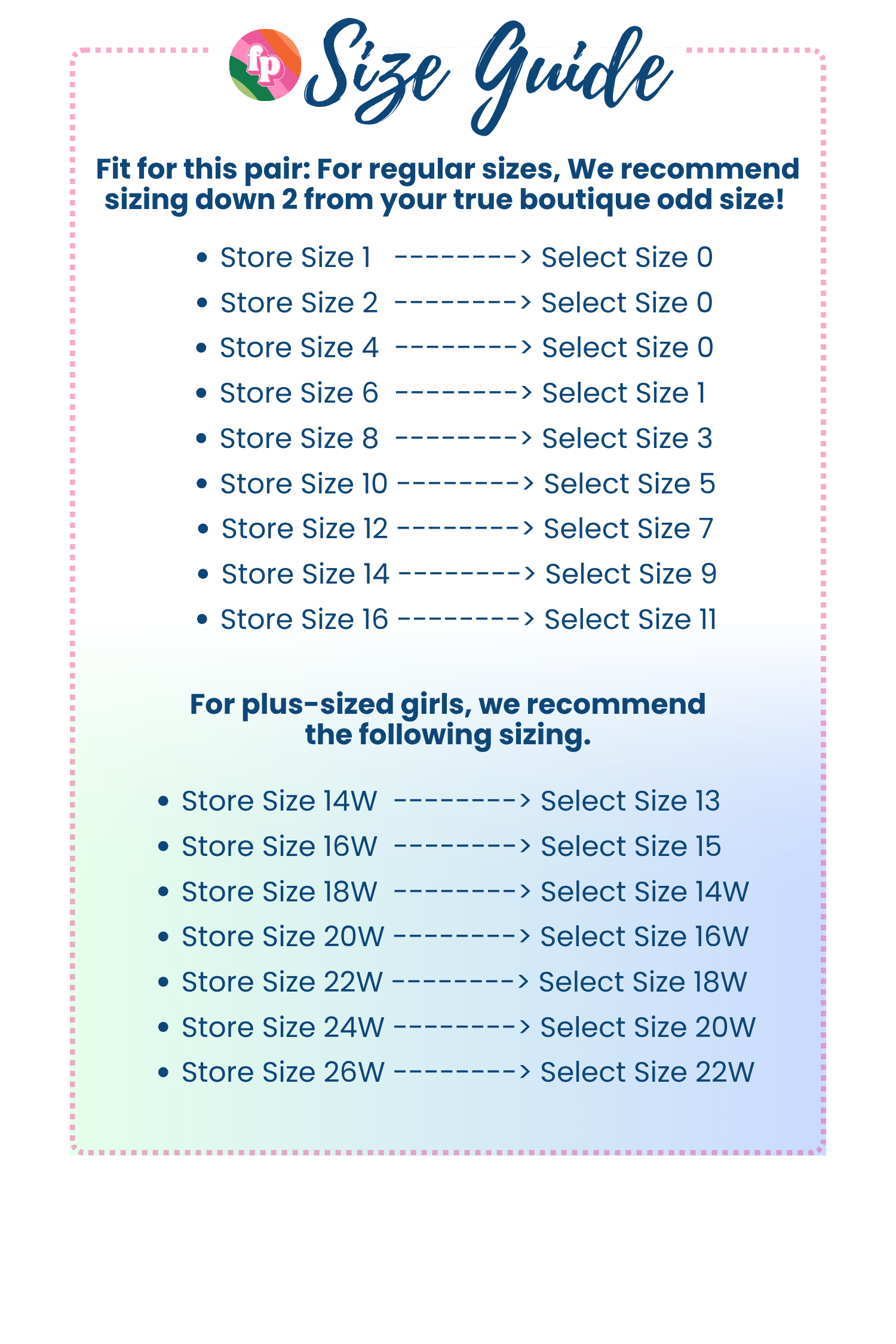 **Your true odd size is simply 1 down from your true even size. For example, if you are a women’s 8, your true odd size would be a 7. This is NOT sizing down. A 7 and 8 are the same size. From there, you follow the fit advice on each pair.**