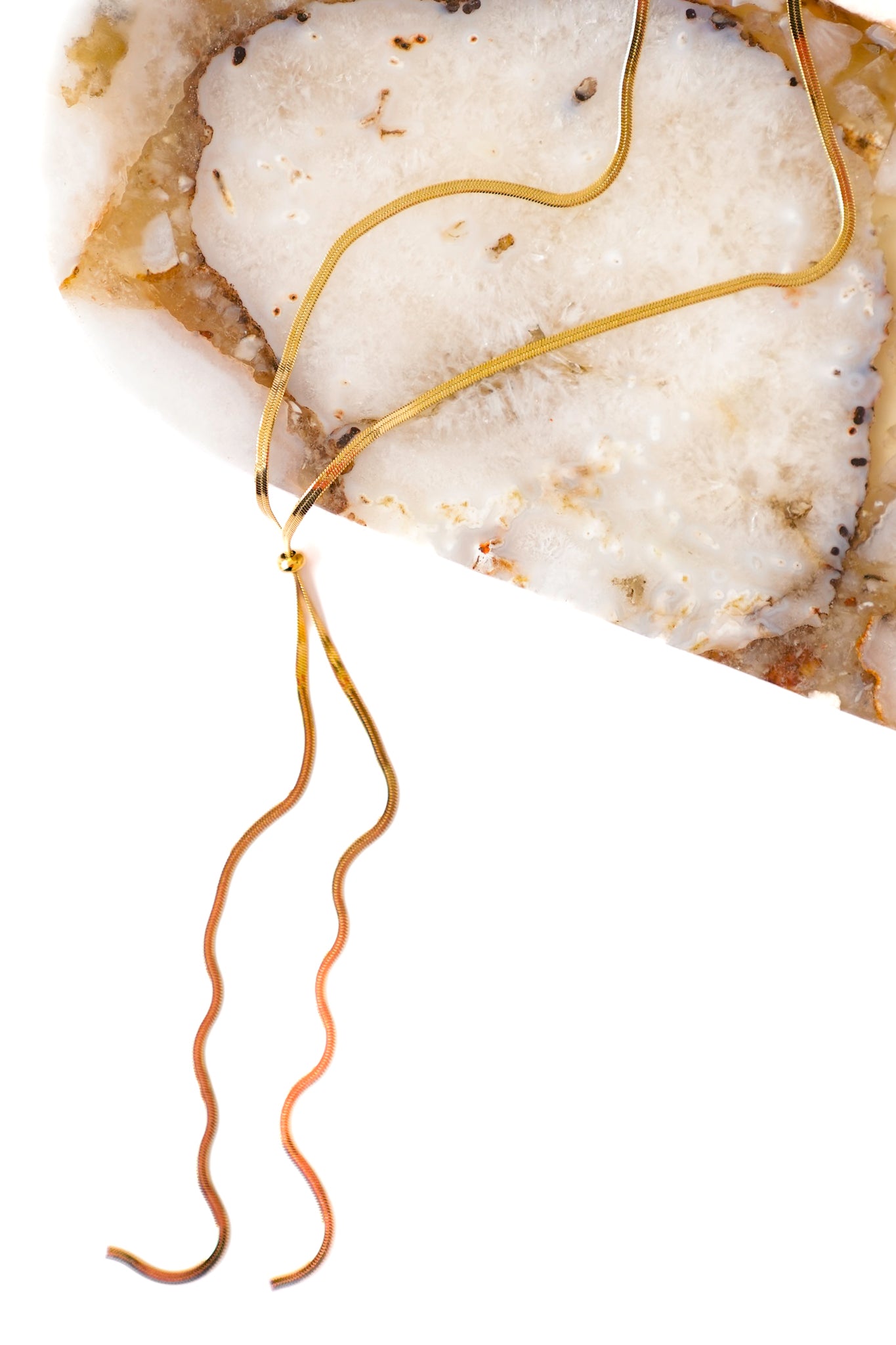 This piece blends timeless elegance with a hint of modern edge. The smooth herringbone texture catches the light beautifully, while the adjustable bolo style lets you wear it high or low depending on your neckline. Layer it with other gold chains or let it shine solo with your favorite sweater or dress.