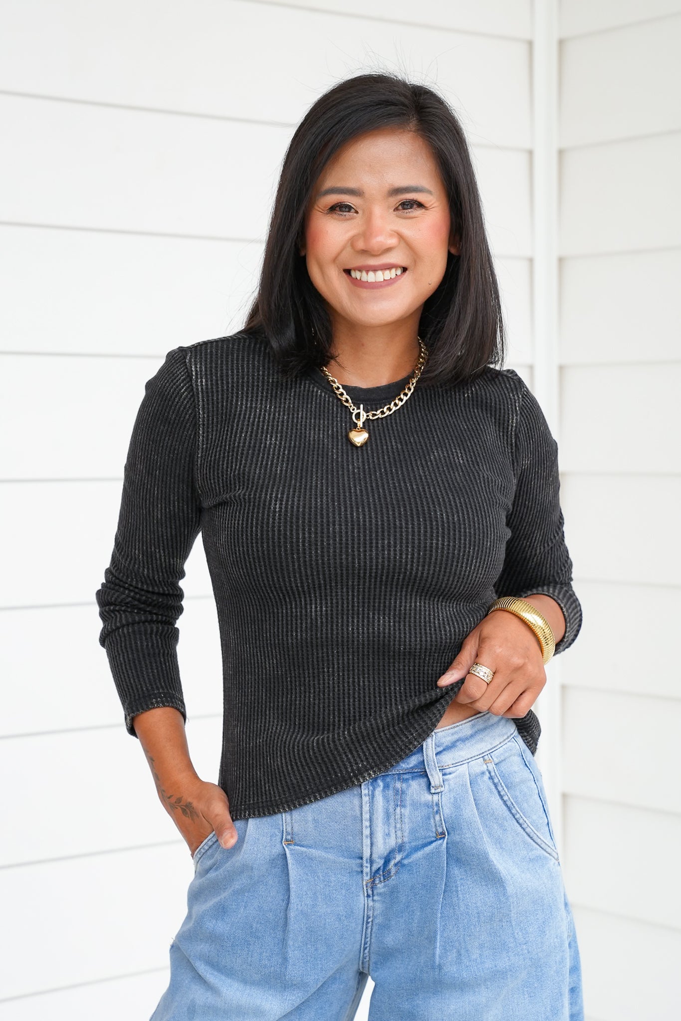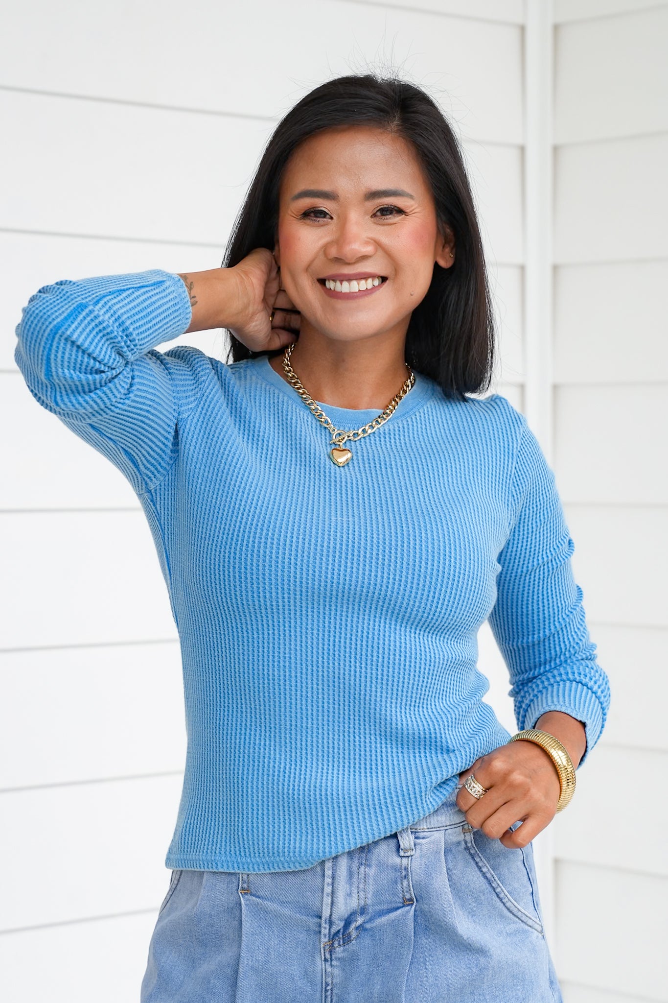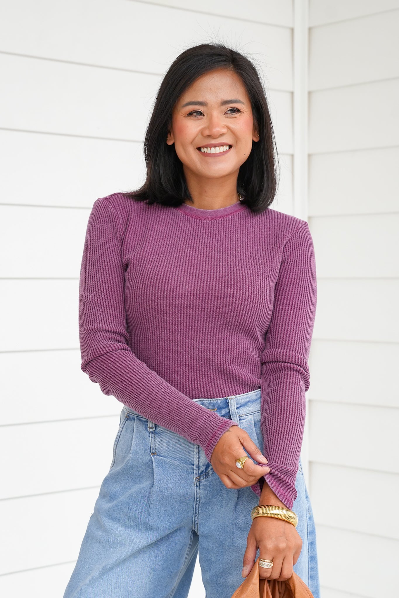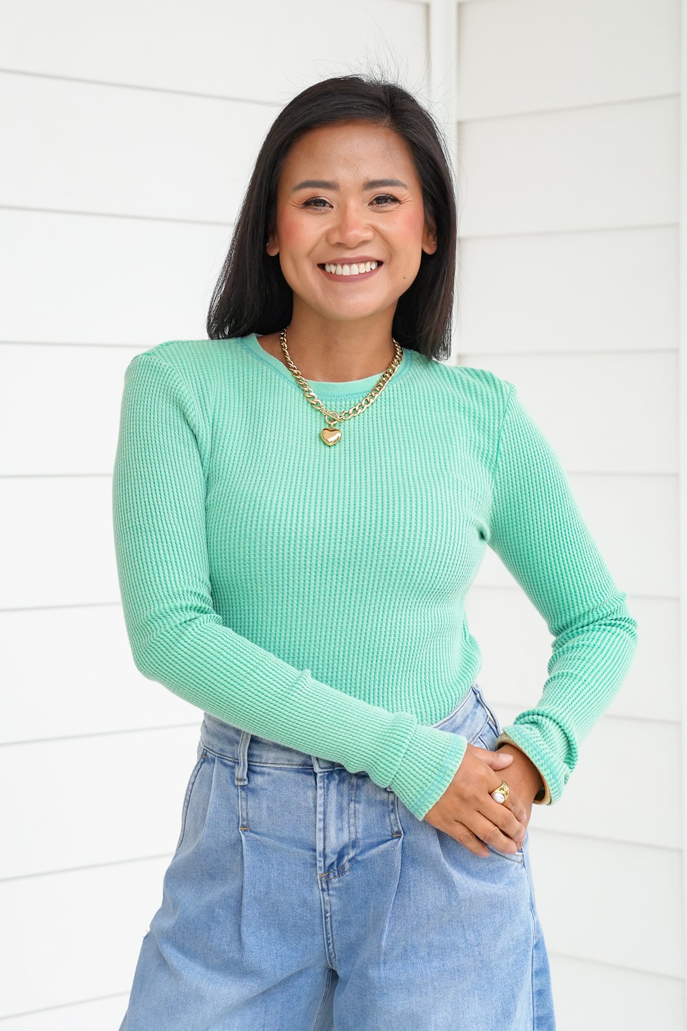 This mineral wash waffle knit top is the elevated basic your closet has been waiting for! With its soft texture, classic crew neckline, and long sleeves, it’s easy to wear on its own or layered under jackets, cardigans, or vests. The mineral wash gives it that effortlessly cool, lived-in vibe while still feeling polished enough for everyday wear. A versatile piece like this is one you’ll find yourself reaching for again and again, whether you’re dressing it up or keeping it casual.