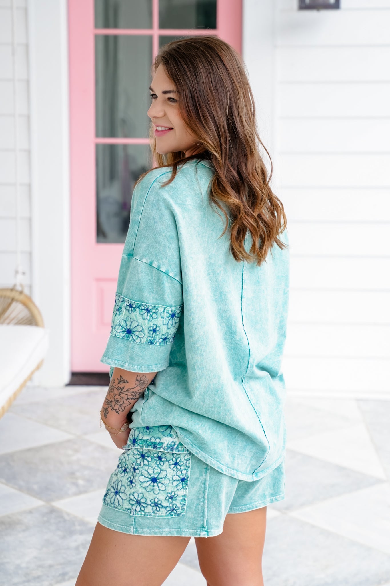 Mineral Wash Short Sleeve Top with Floral Embroidery Detail