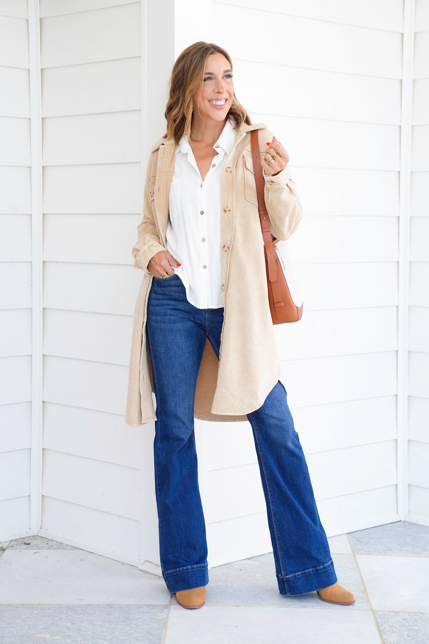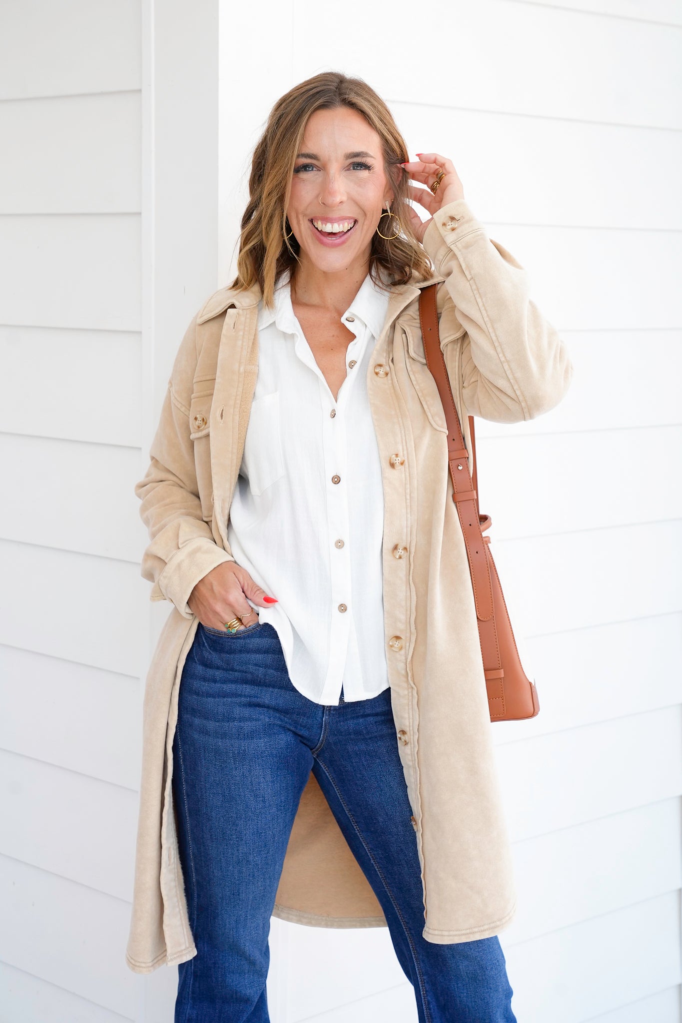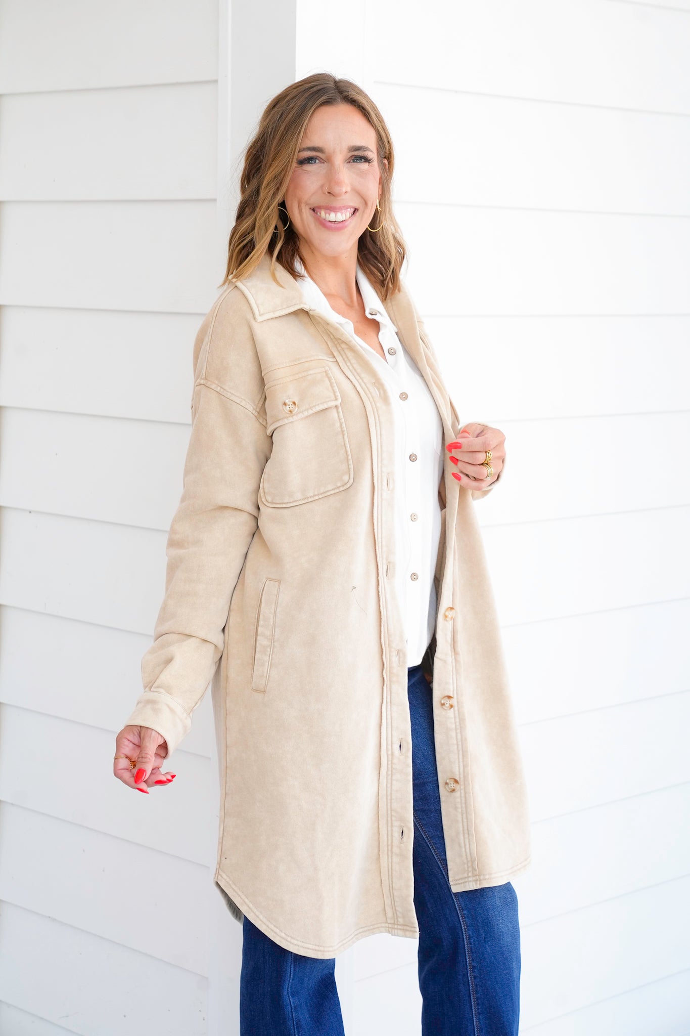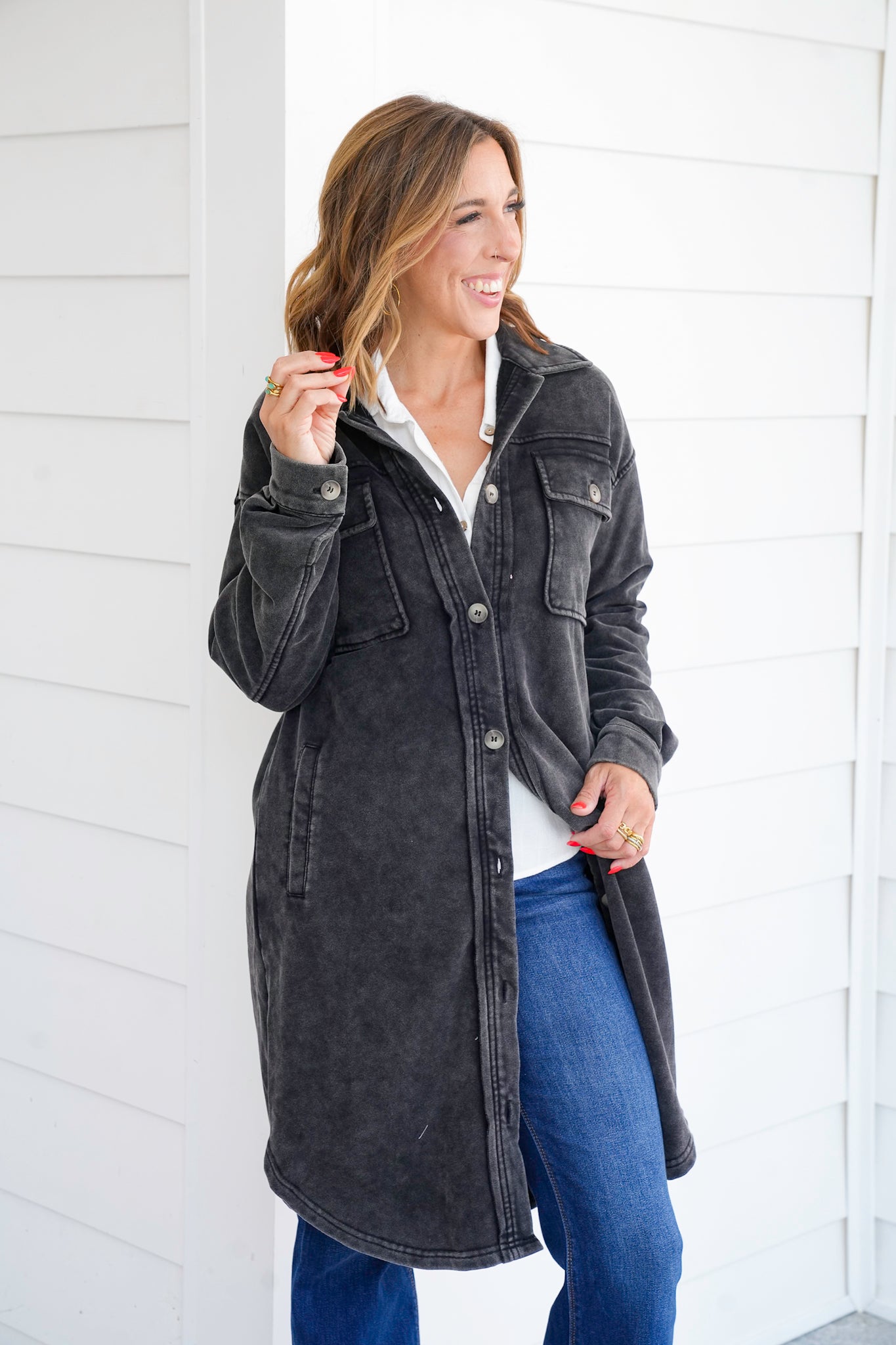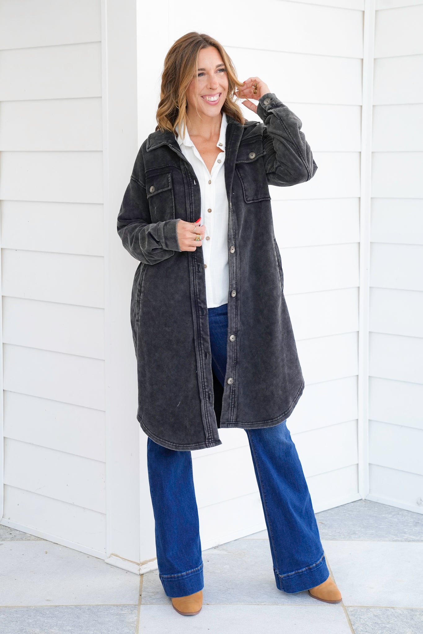 This mineral-washed jacket is the definition of casual-cool. With its lived-in look and longer cut, it’s the piece you’ll throw on with everything from jeans and a tee to leggings and boots. The washed finish gives it that vintage edge, while the button front and chest pockets keep it classic and practical. It’s the jacket that makes every outfit look instantly put-together.