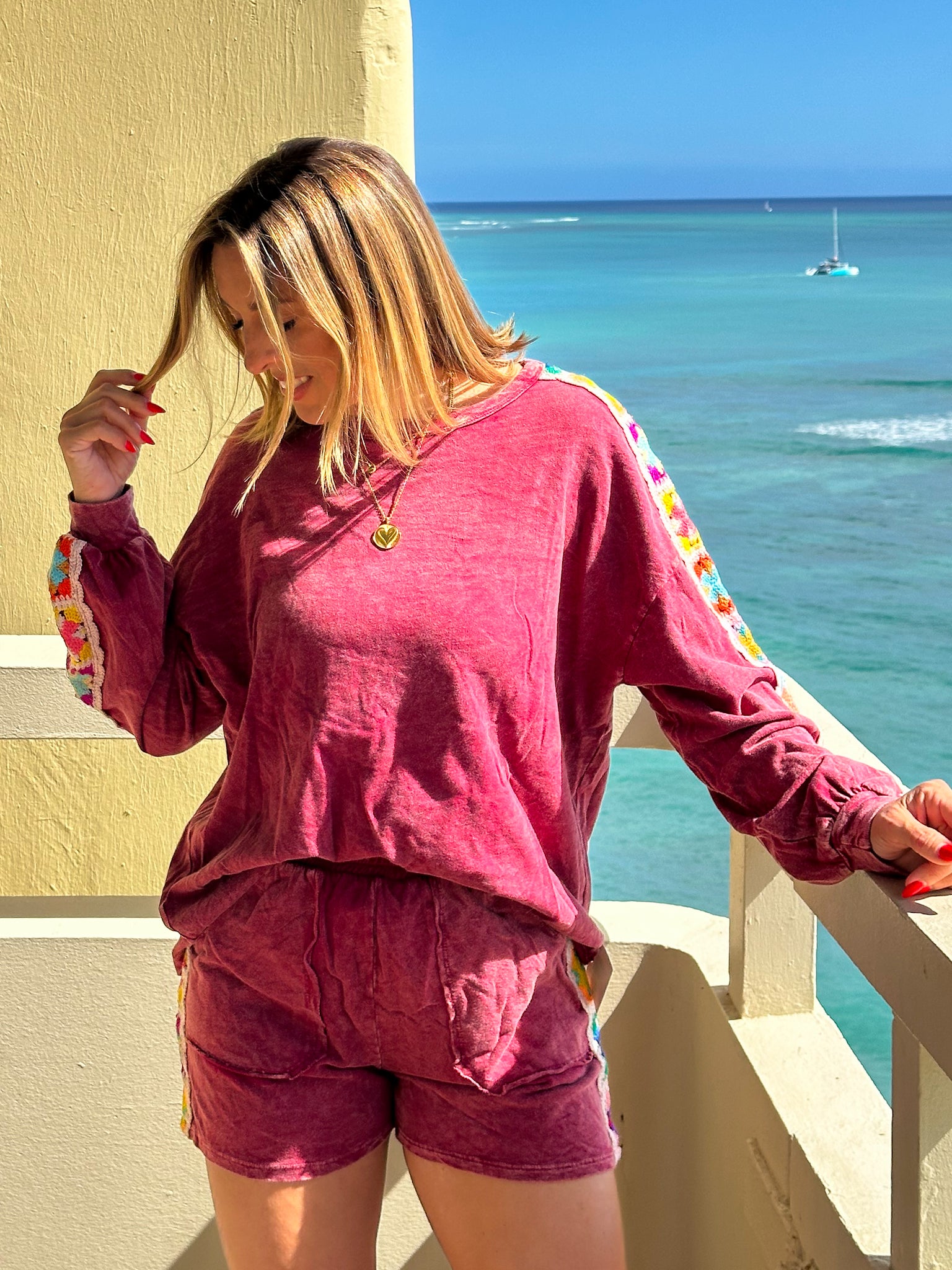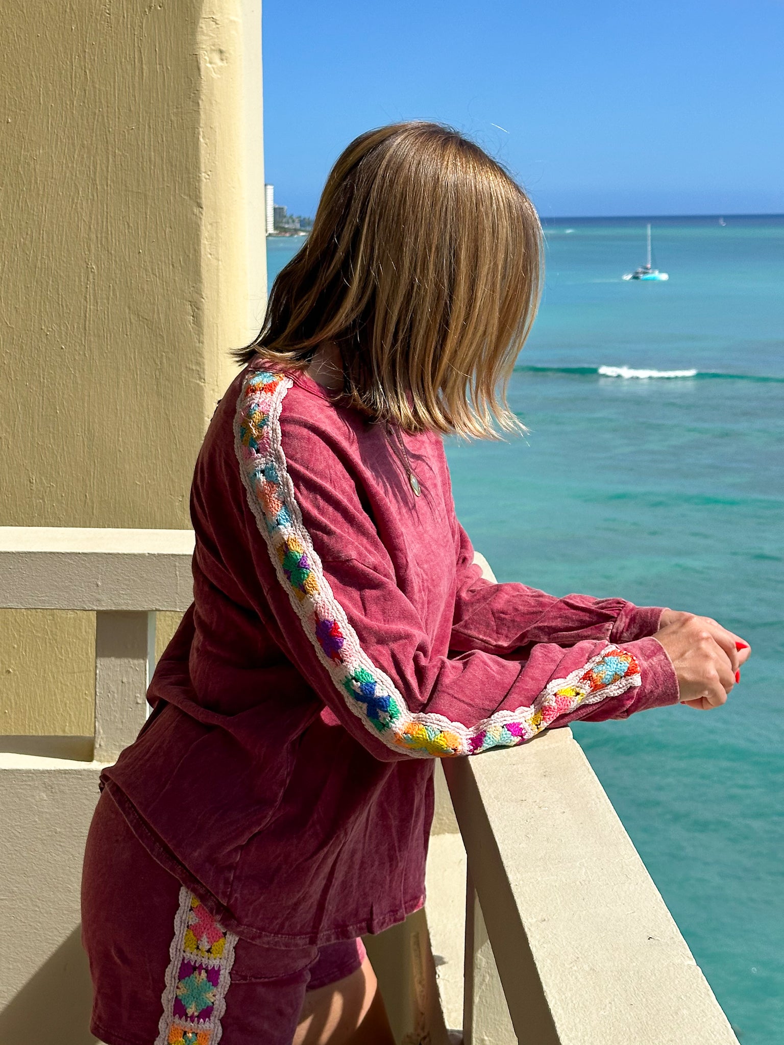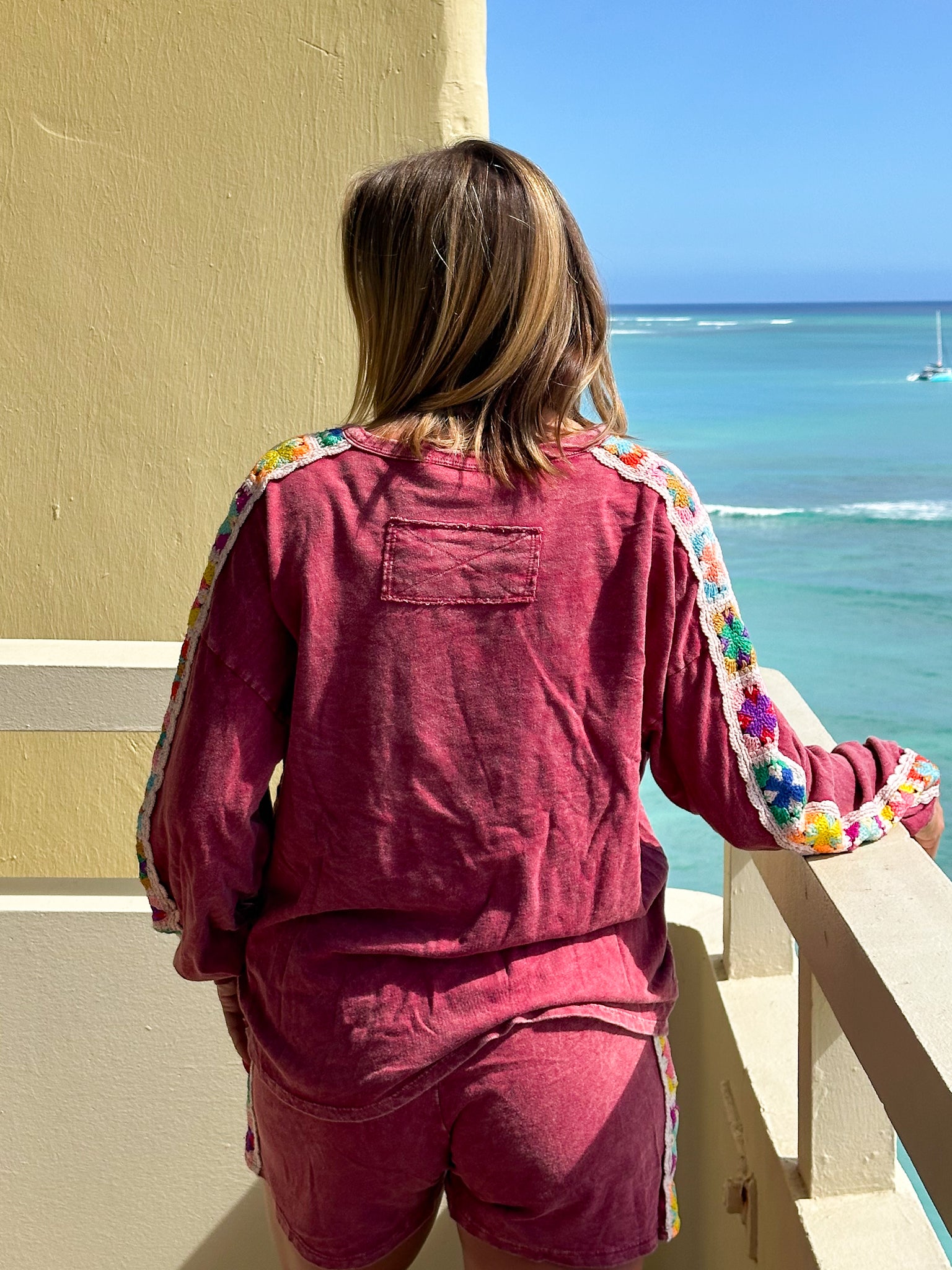 A cozy knit with personality, this mineral-washed top is made for laid-back days and fun styling. The colorful crochet detailing down the sleeves adds that touch of retro charm, while the oversized fit keeps it casually chic. Pair it with the matching shorts for a coordinated set or style it with your favorite denim cutoffs for an easy weekend look.