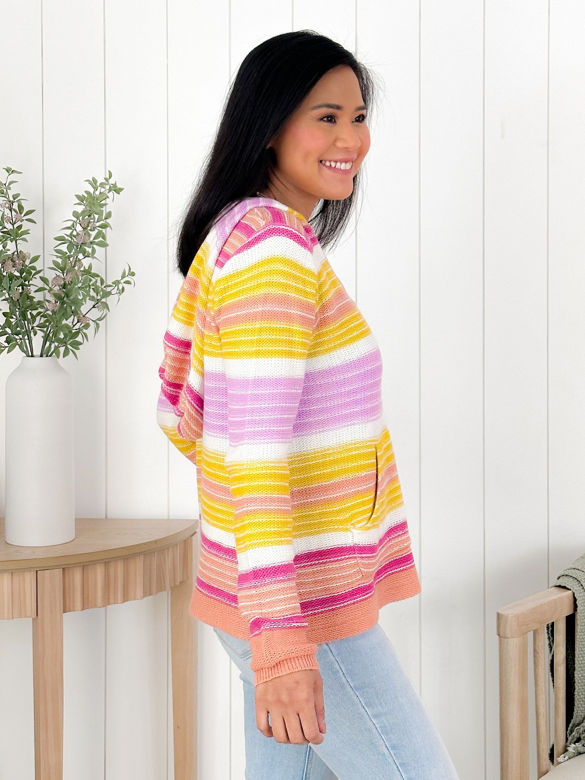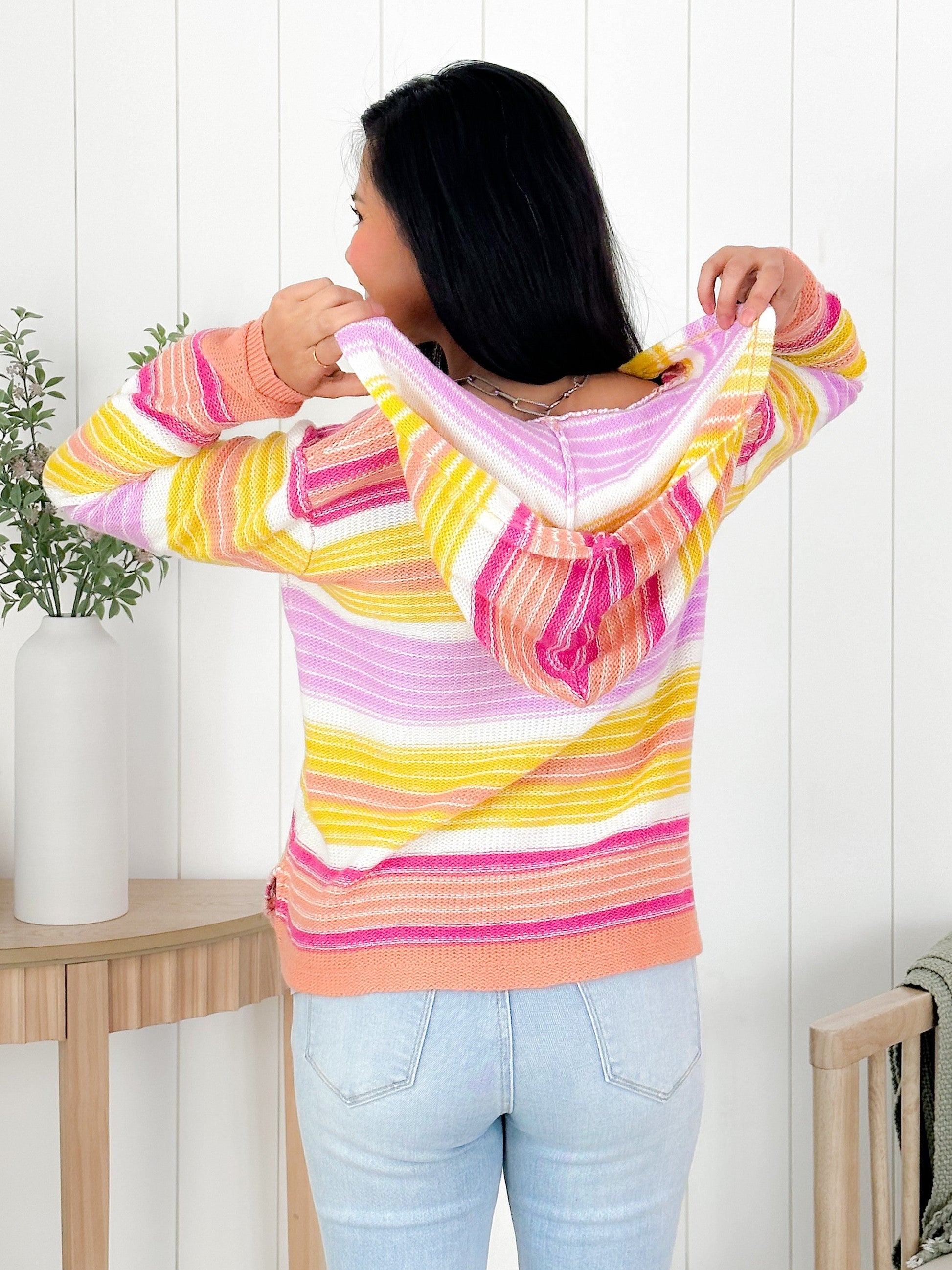 Add a burst of color to your wardrobe with this super fun sweater! It has a multi-color stripe pattern in bright, happy colors, a flattering v-neckline, and a kangaroo pocket. This is the perfect choice for those days when you want to stand out in style. Just throw it on with your favorite jeans or shorts for an easy, put-together look.