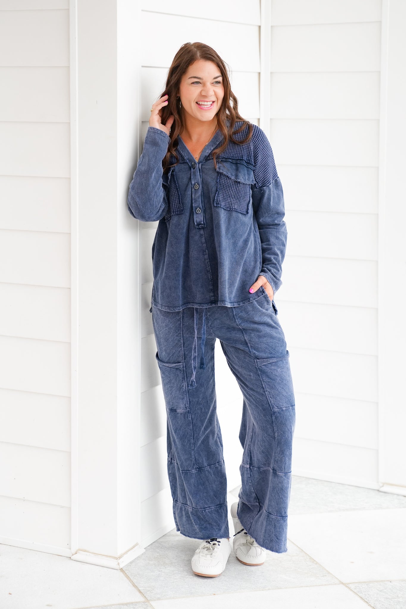 Cool, comfy, and stylish—these wide-leg pants bring major attitude while still keeping you cozy. The mineral wash creates a one-of-a-kind look, and the wide-leg cut makes them easy to style with sneakers, slides, or even ankle boots. Pair with the matching Henley top for a set that turns heads, or throw on a chunky knit for an elevated casual vibe.