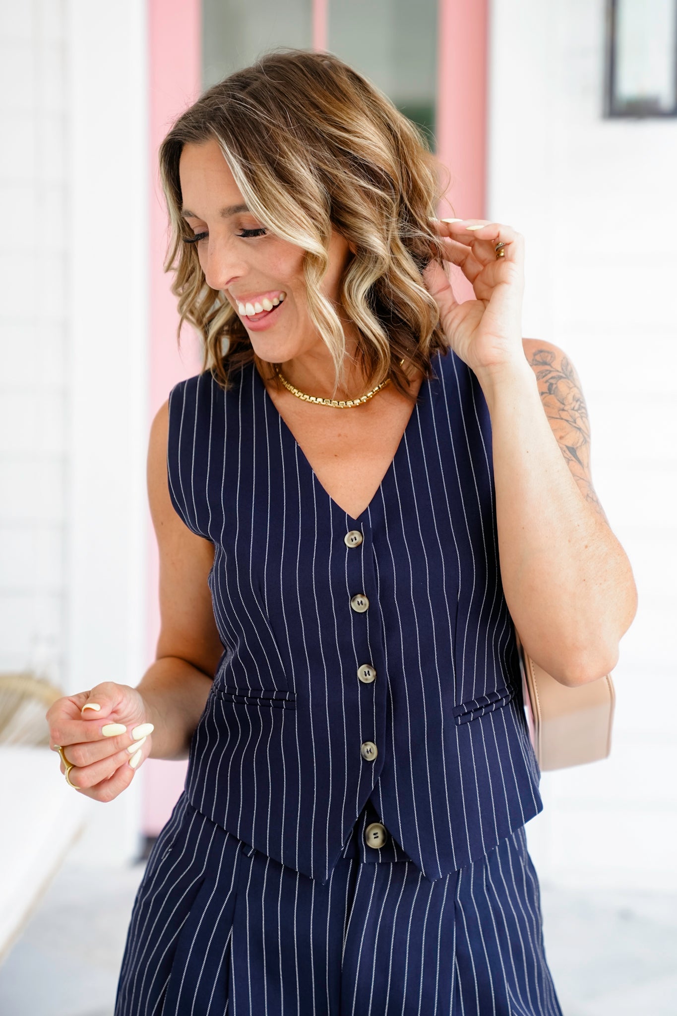 Sharp and polished with a little vintage charm, this navy pinstriped vest is the ultimate power piece for layering or wearing on its own. The functional buttons and tailored lines make it perfect for dressing up with the matching trousers (sold separately) or adding some edge to casual denim. It’s sleek, versatile, and totally chic with a menswear-inspired vibe that still feels feminine.