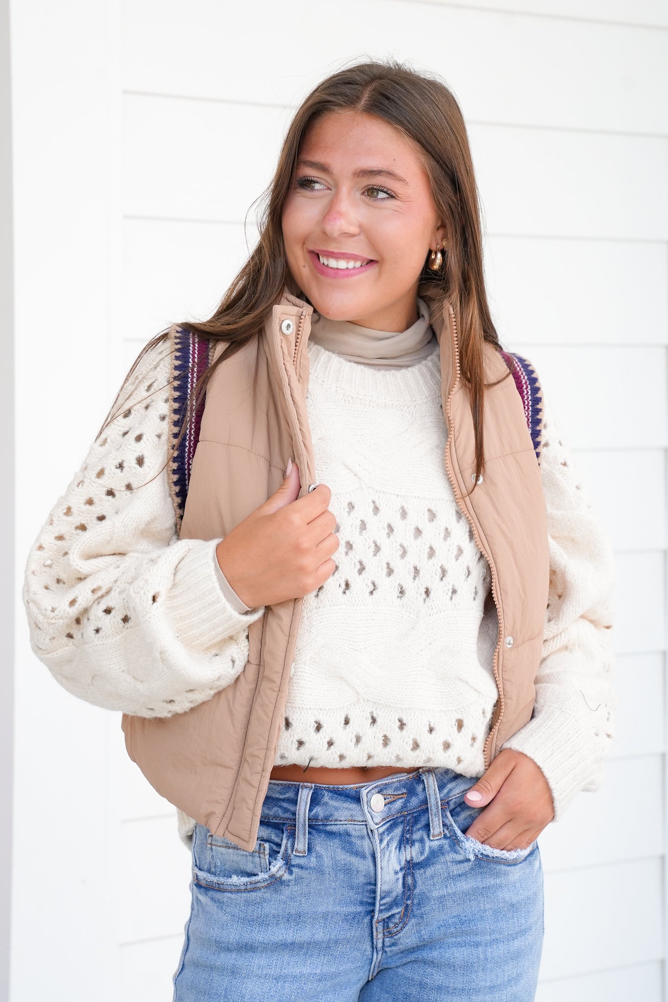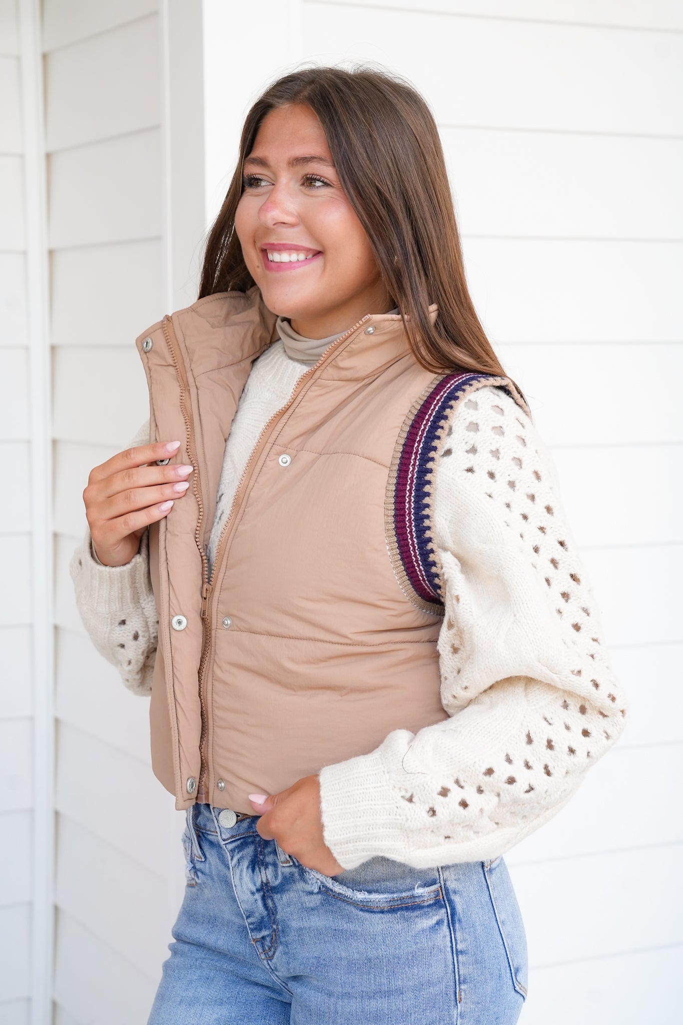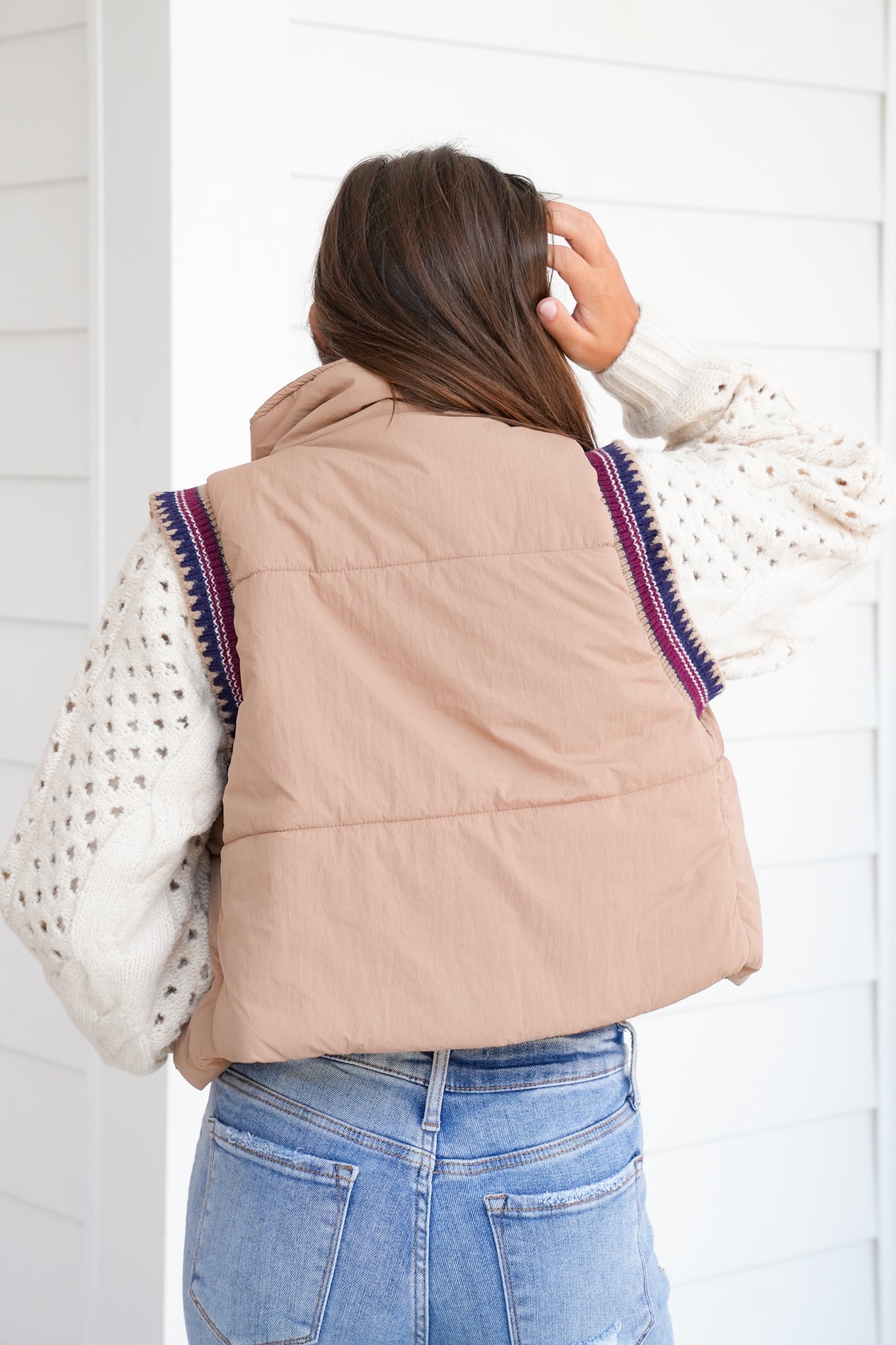 Layer up in style with this padded vest that delivers both fashion and function. The sleek neutral tone makes it a versatile match for any outfit, while the trim detail adds just the right touch of personality. Perfect for tossing over chunky sweaters, plaid shirts, or long sleeve tees, it keeps you warm and looking put-together.