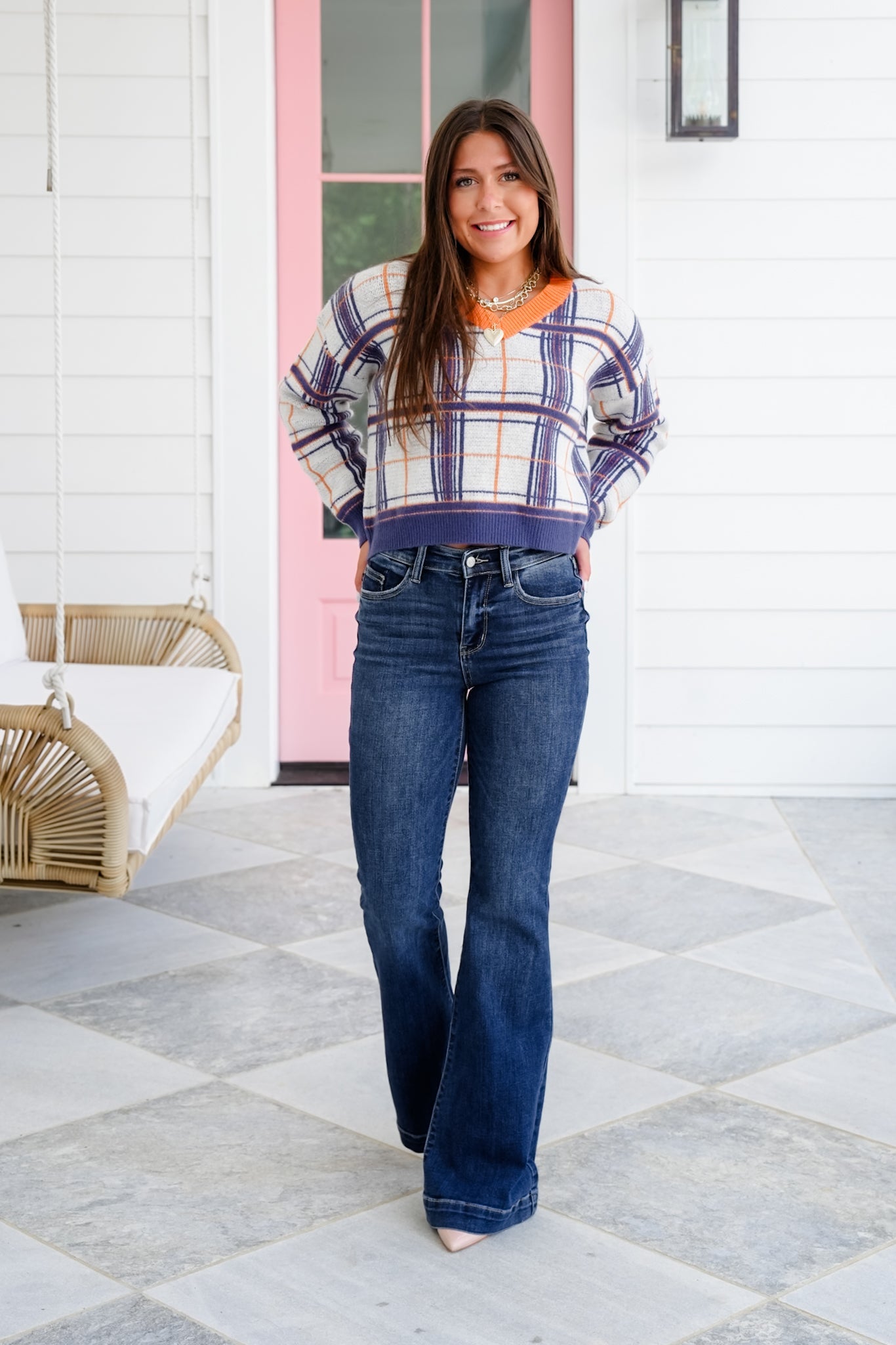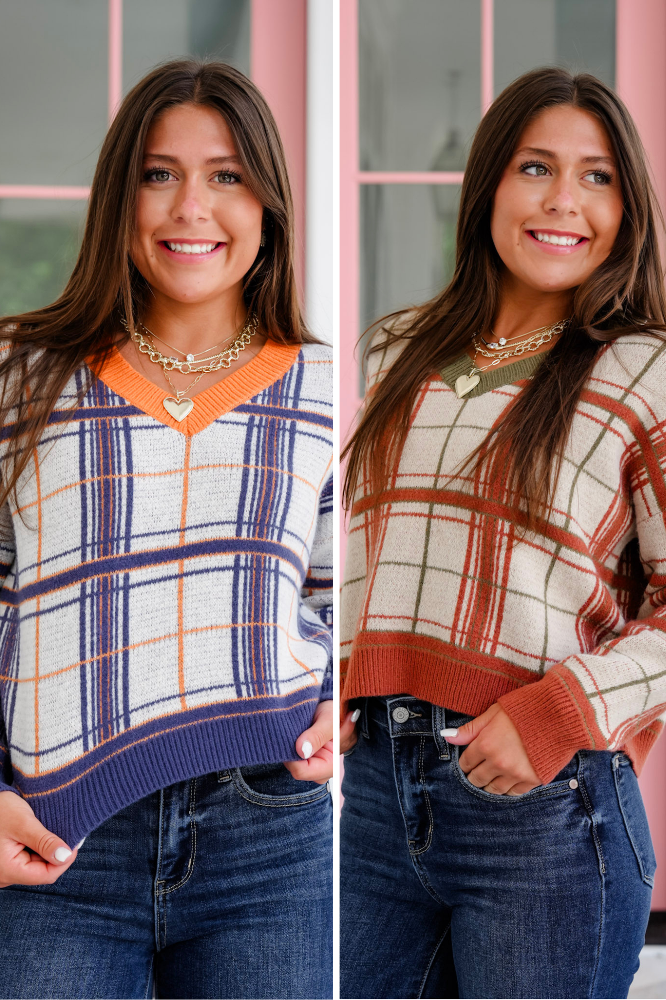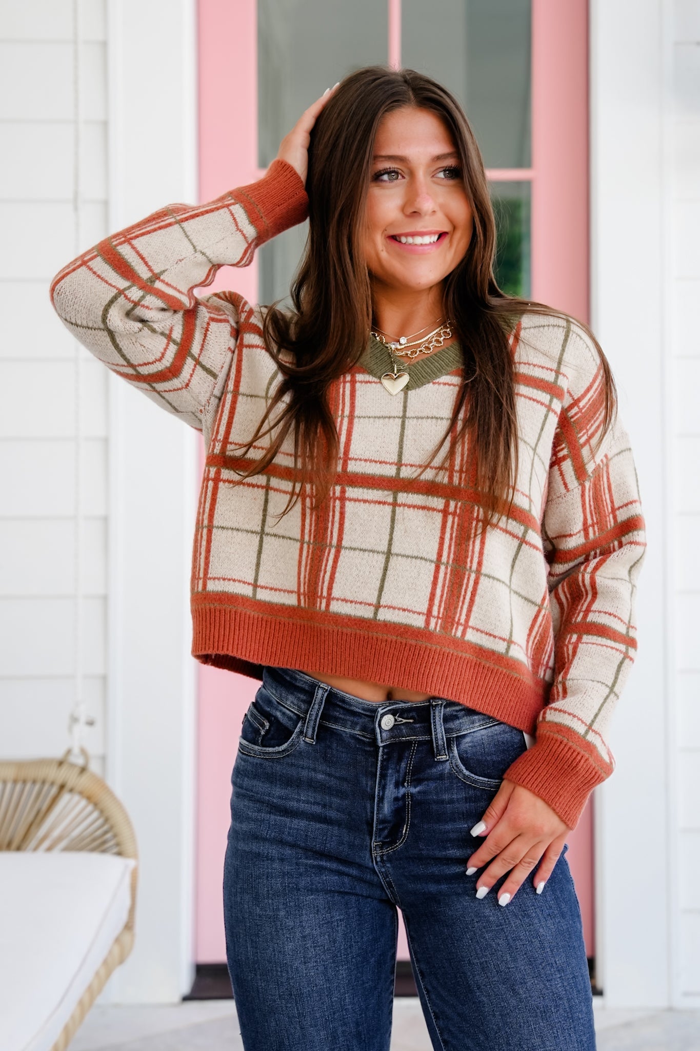 This plaid V-neck sweater is giving elevated cozy with a bold, playful twist. Designed to stand out, it blends rich seasonal tones with a classic check pattern and contrast trim for that boutique-worthy charm. The soft knit has incredible stretch and a luxe, brushed feel that wraps you in comfort while still keeping things lightweight and breathable. Pair it with high-rise denim and layered gold chains for a casual-chic vibe that’s anything but basic.