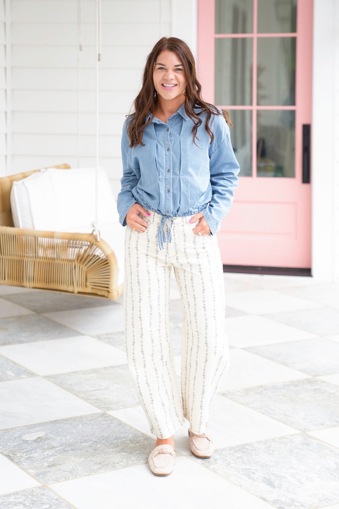 This pleated long-sleeve button-up top is the perfect mix of classic and casual with its functional buttons and easy silhouette. The drawstring waistband lets you cinch it in for a more tailored look or keep it relaxed and laid-back, making it a versatile piece for your wardrobe. Softly pleated detailing adds just the right touch of texture and polish.