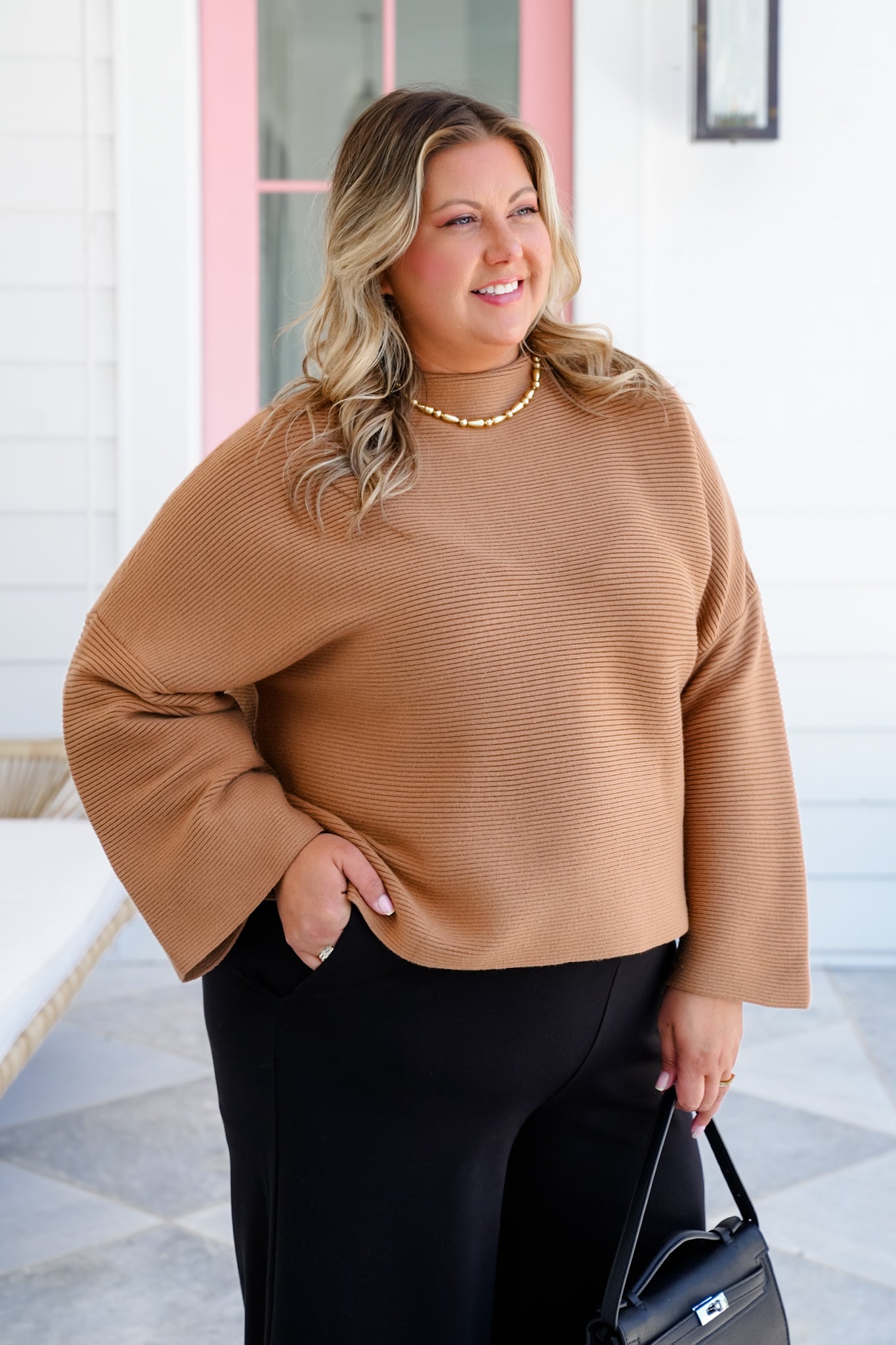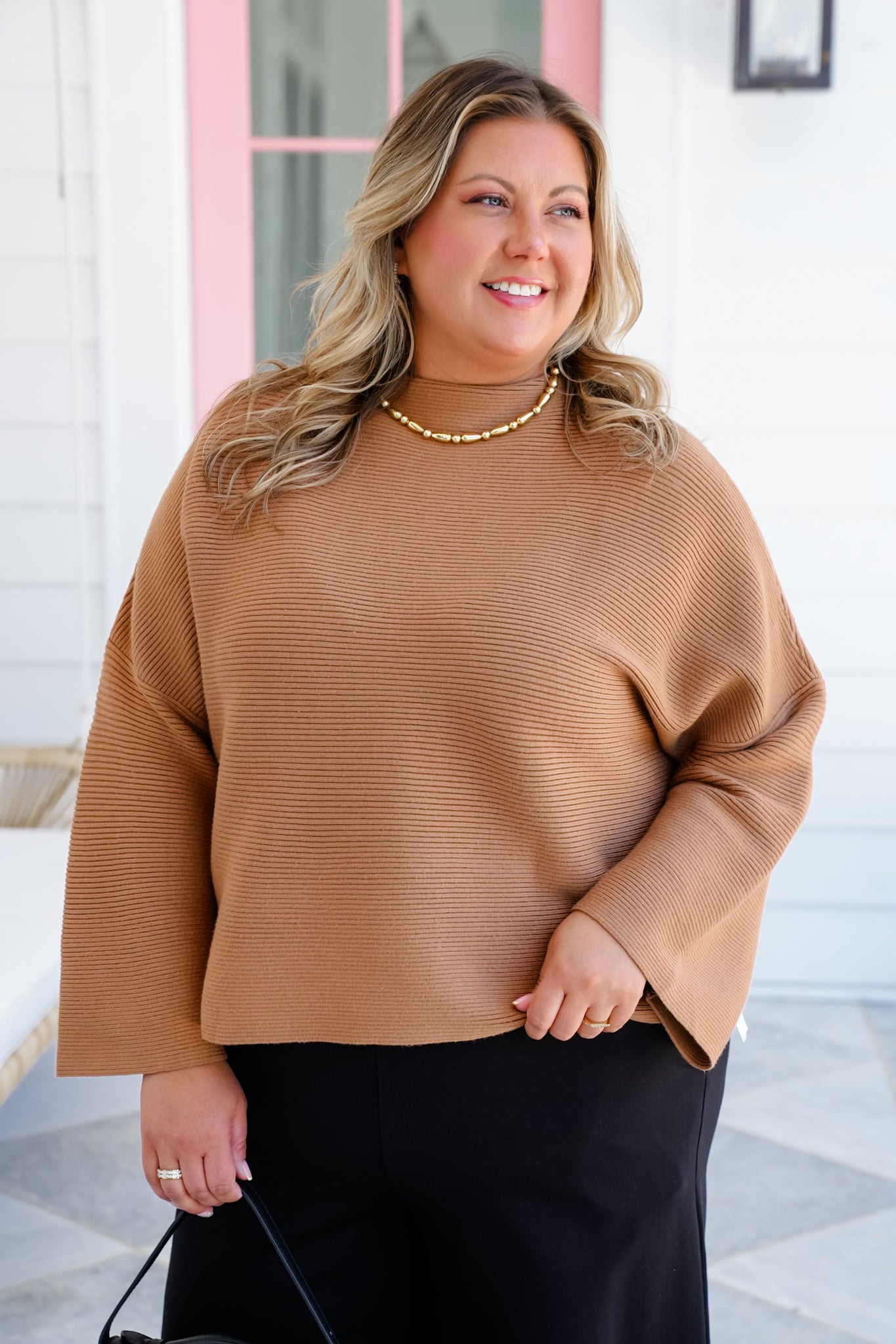 This camel ribbed knit top is the perfect mix of polished and effortless, with a luxe horizontal ribbed texture and a high mock neck that instantly gives it a chic, elevated vibe. The 3/4 sleeves and slightly cropped boxy cut make it a standout piece that pairs beautifully with everything from skirts to denim.