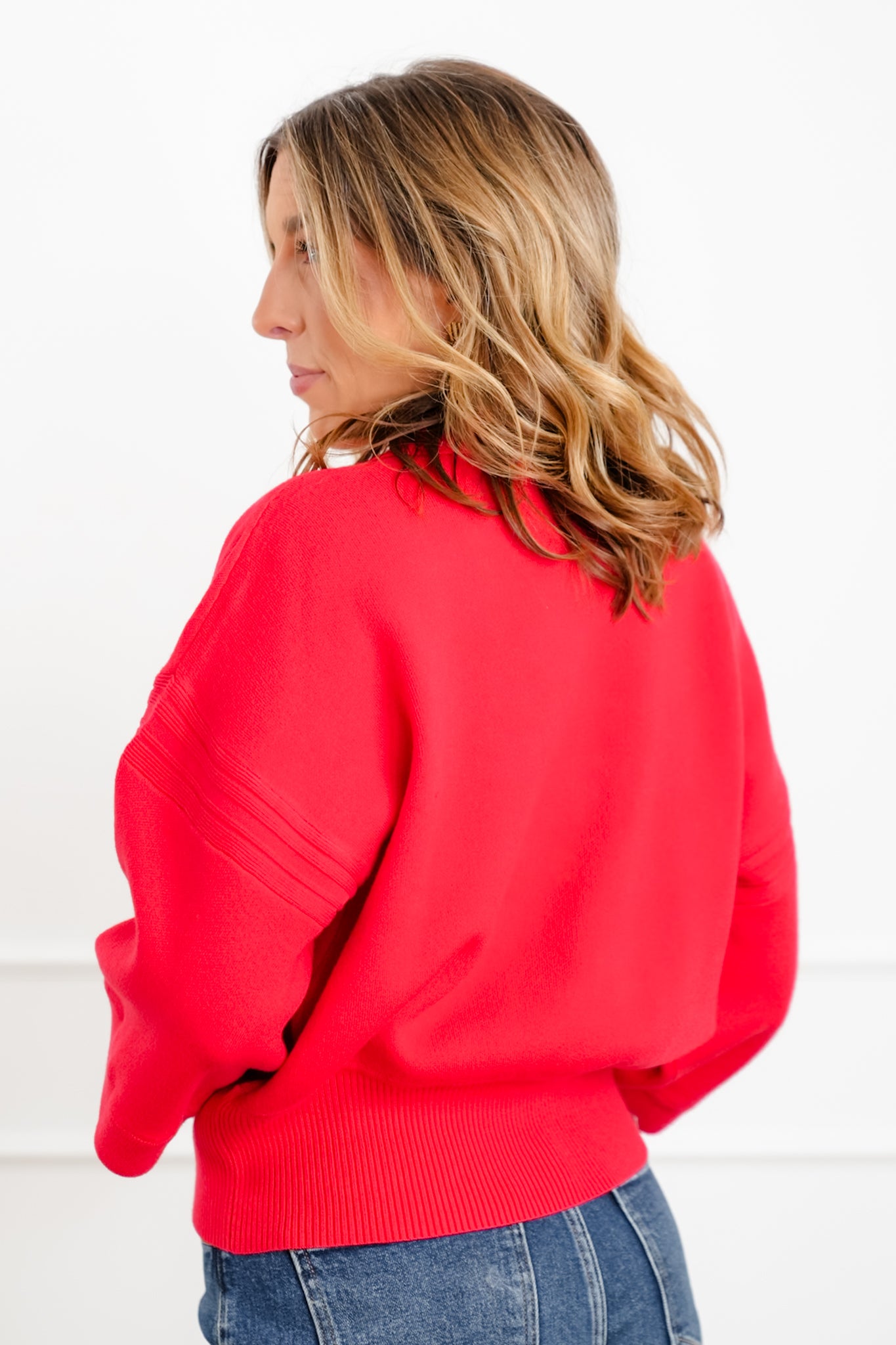 This top brings that fun, sporty edge with the contrast V-neck detail and rich red knit. The relaxed drape keeps it comfortable and flattering, while the wide ribbed waistband adds shape without clinging. The cropped length hits perfectly with high-rise denim, so you can throw it on with your favorite jeans and instantly look styled and confident.