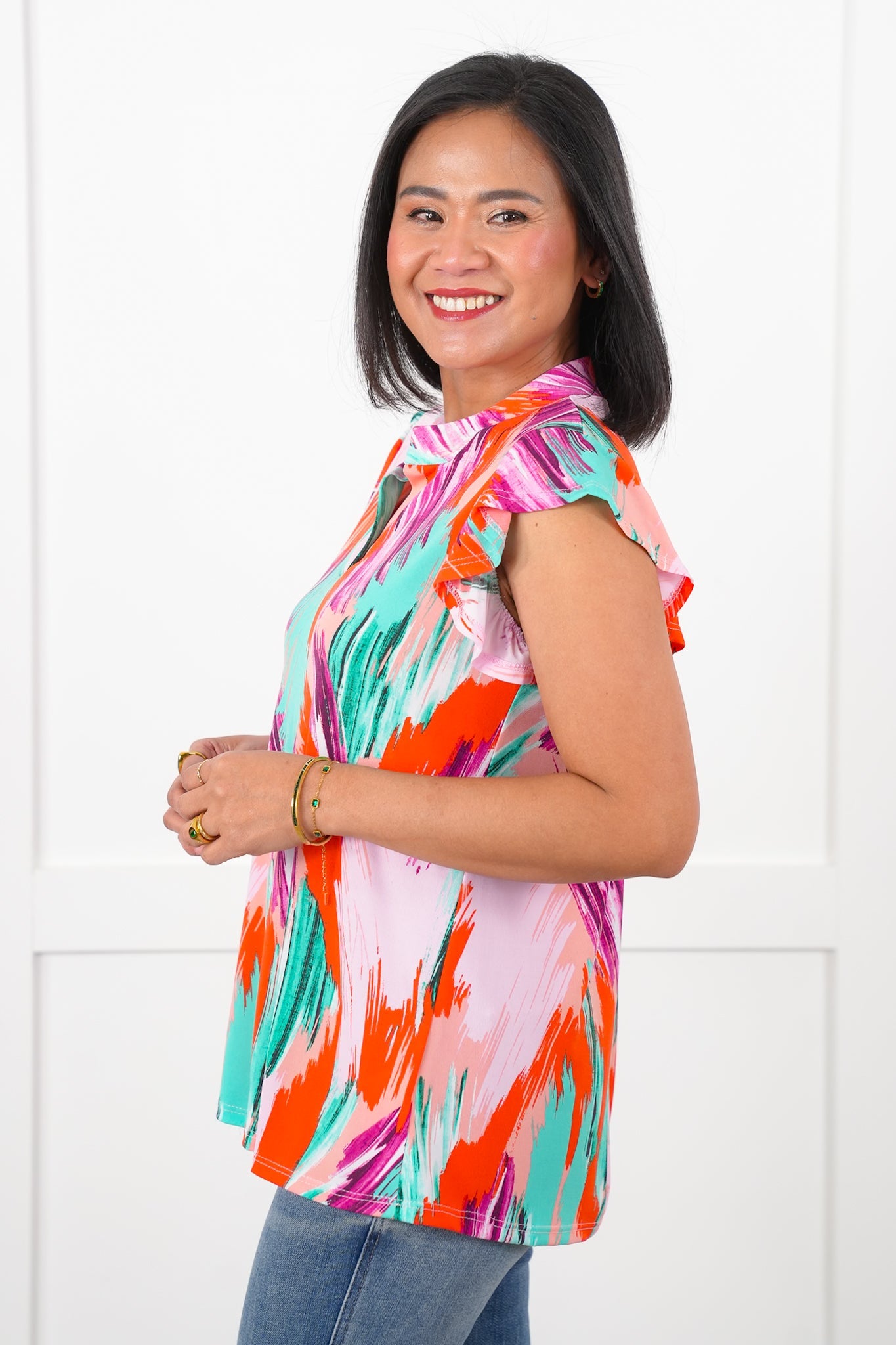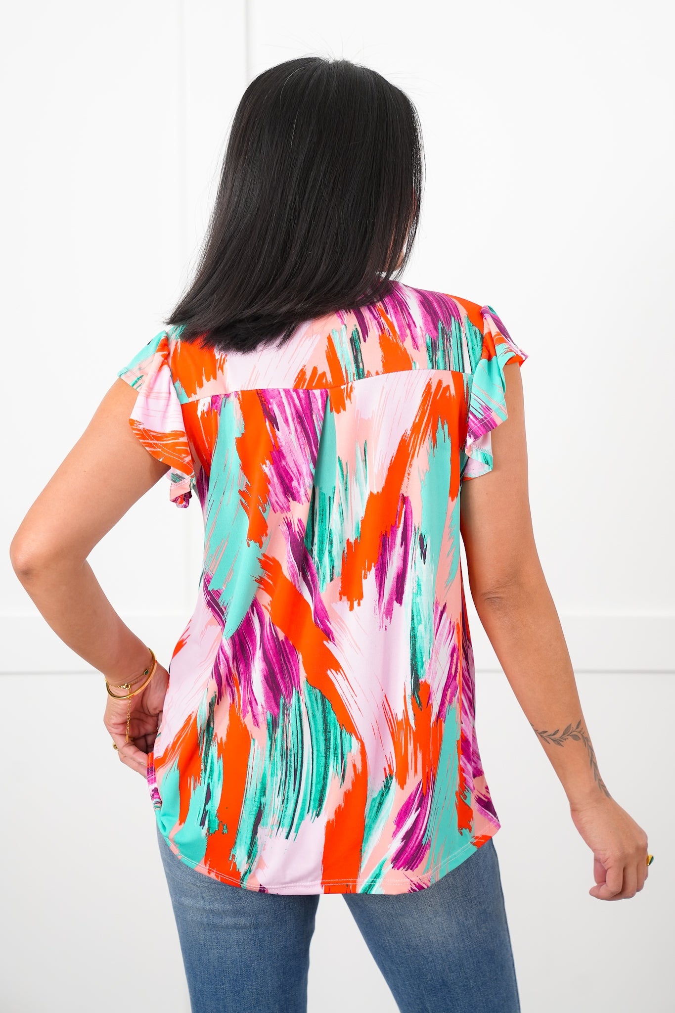 This top is a true showstopper with its gorgeous abstract print in the most vibrant rainbow of colors that instantly brightens your day and your wardrobe! Those sweet ruffle sleeves add such a feminine touch while the split neckline creates a flattering frame for your face and neckline. The combination of playful details with that eye-catching print makes this piece absolutely irresistible.