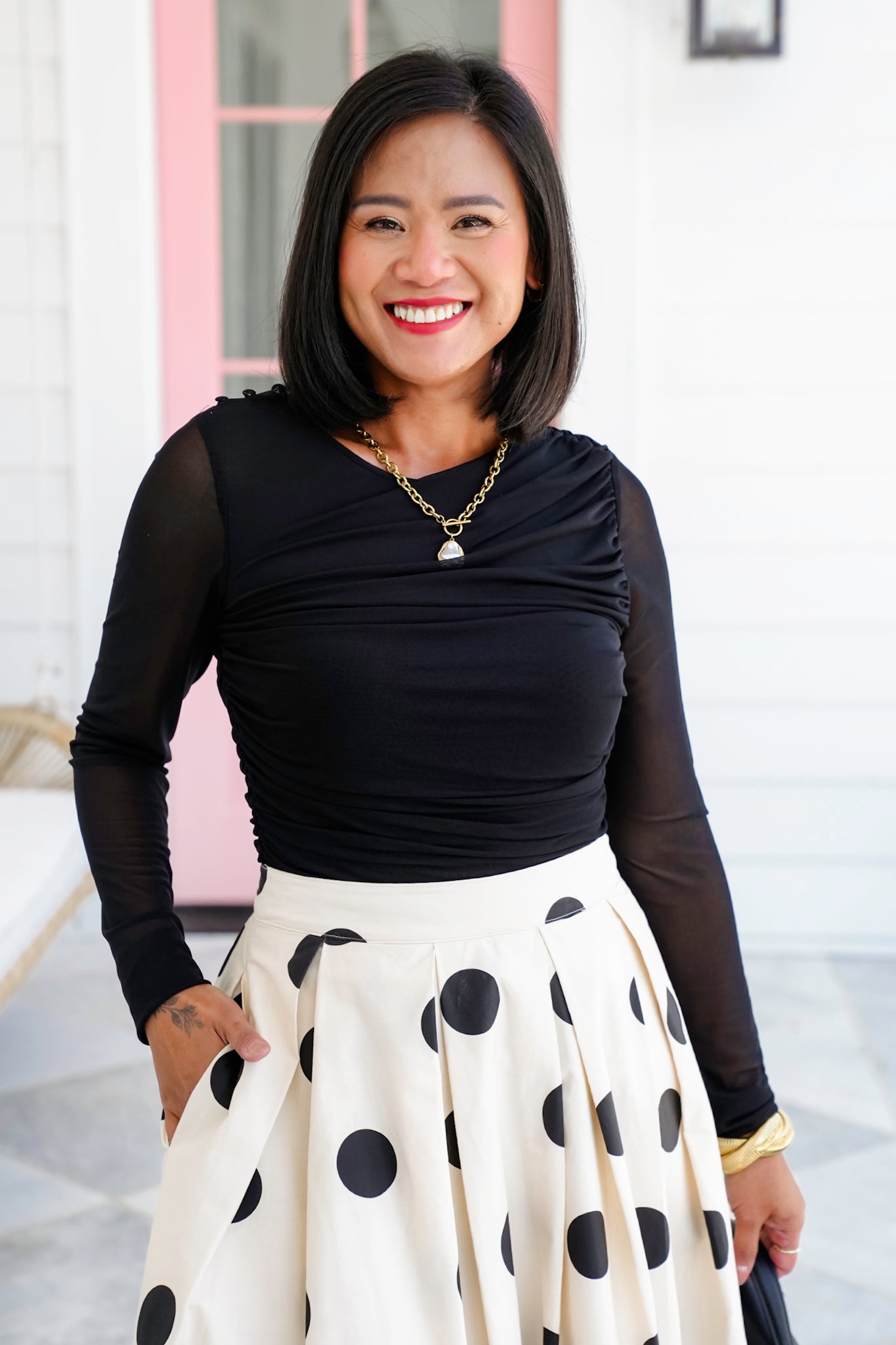 This sleek black top is your new go-to for a polished, confident look. The double-lined bodice offers smooth coverage, while the stretchy fabric moves with you for all-day comfort. Pair it with statement skirts, tailored trousers, or high-rise denim for a chic, put-together outfit that transitions from work to evening with ease.