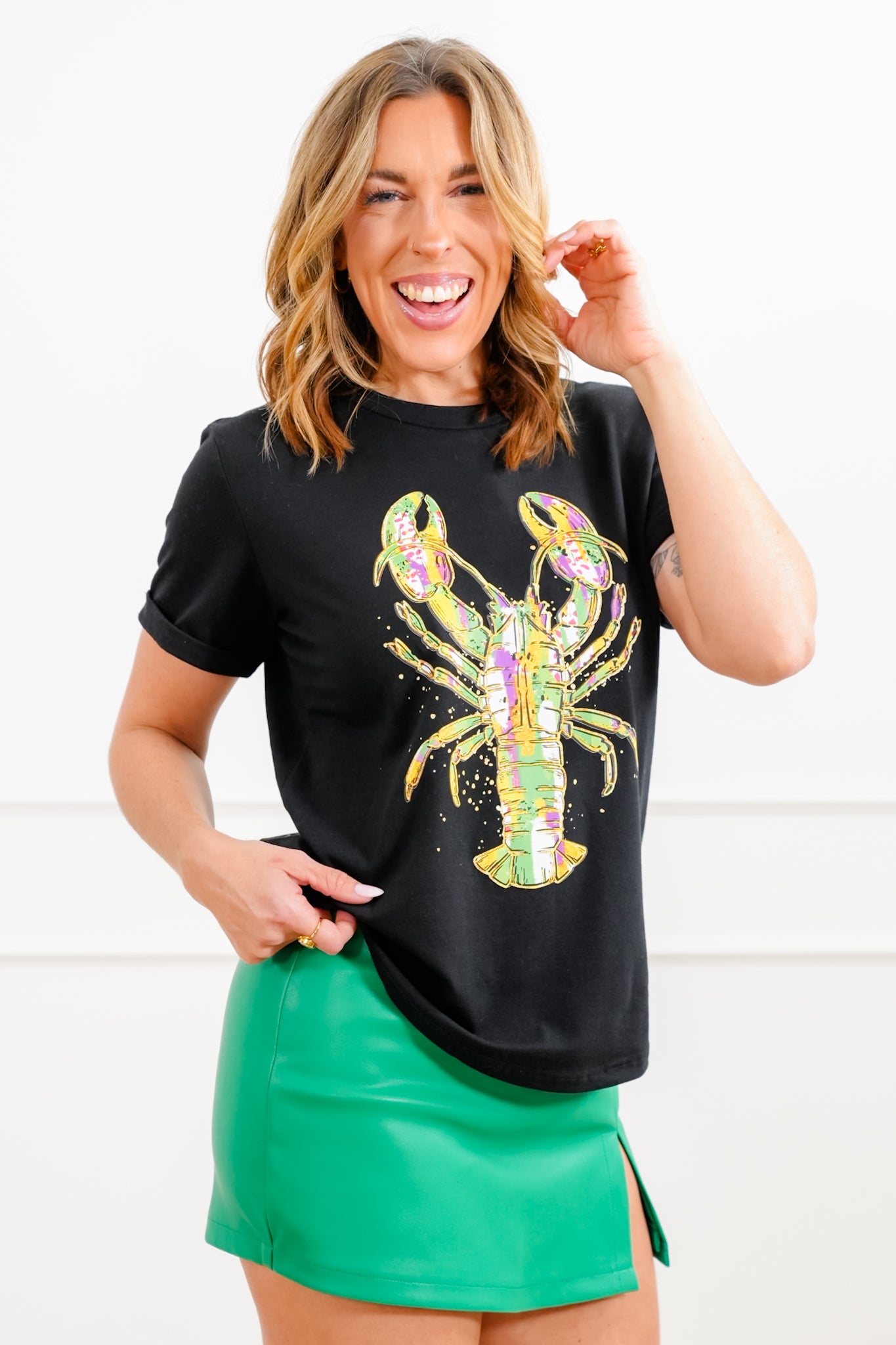 This tee brings Mardi Gras energy with a standout lobster graphic that feels fun, festive, and full of character. The soft, stretchy fabric keeps it comfortable, while the bold design makes it an instant favorite for parade days, casual parties, or styled with a skirt or denim for a laid-back festive look.