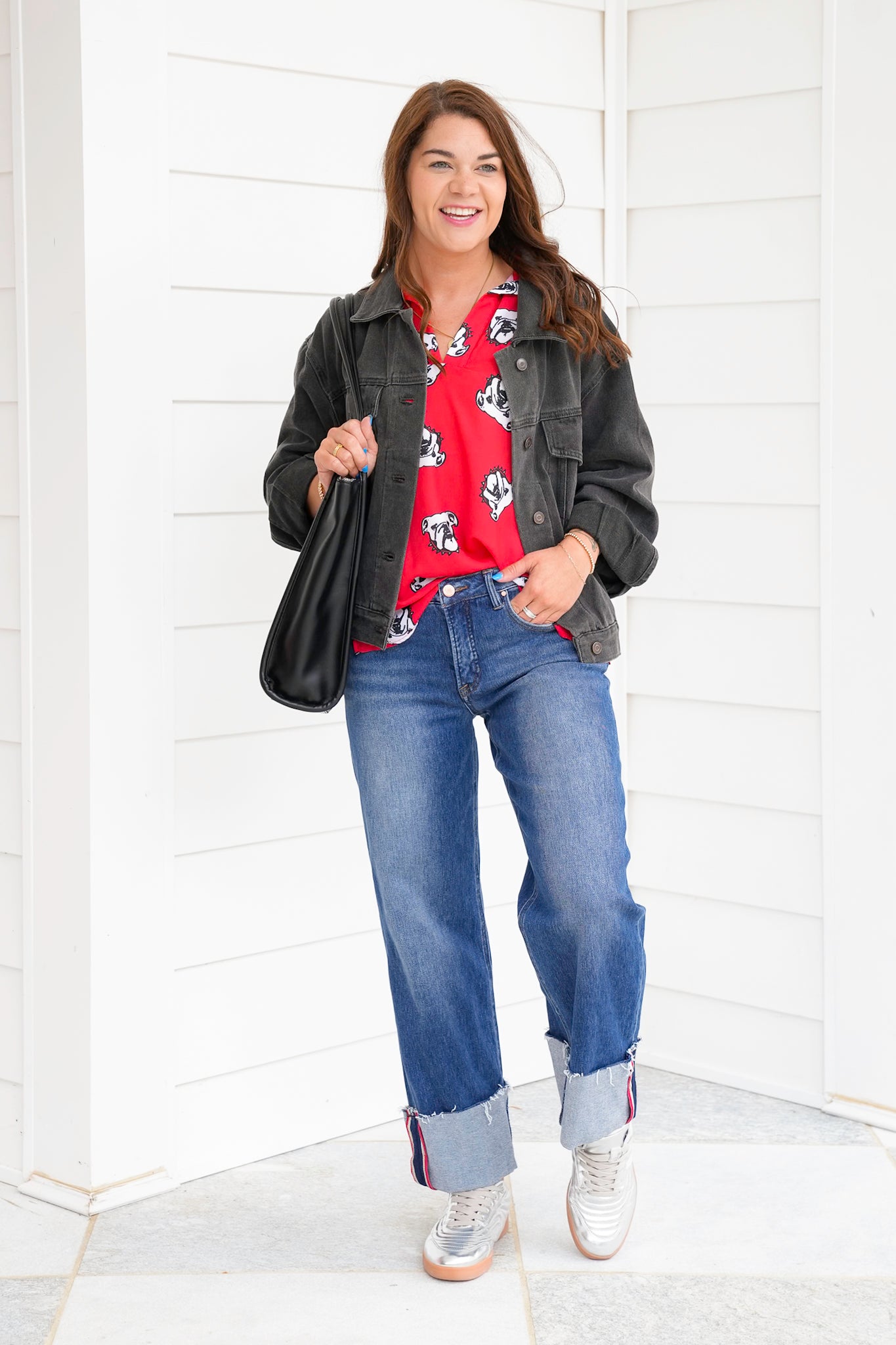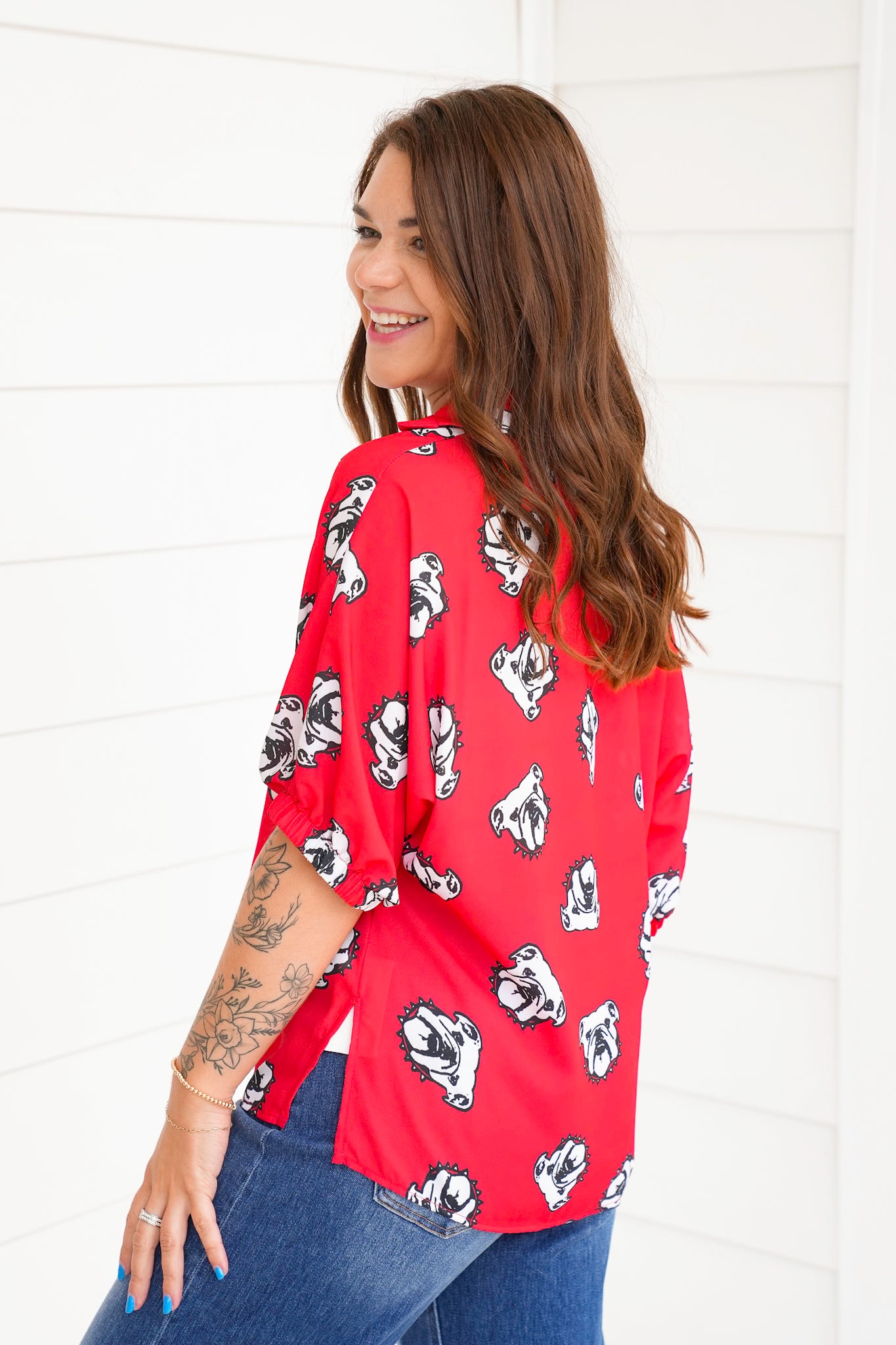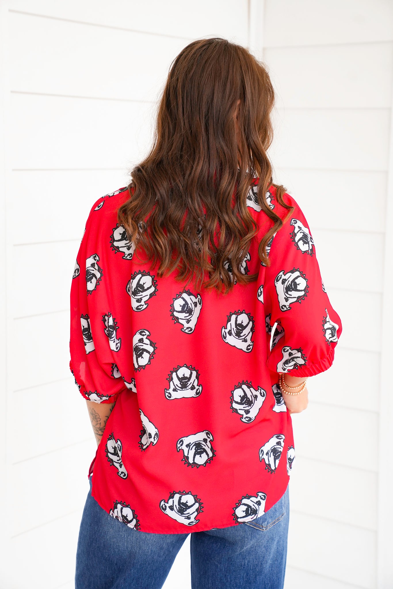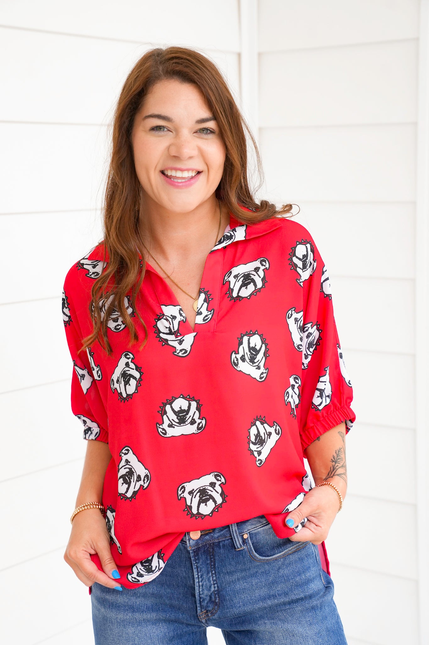 Bring major team spirit with a side of style in this bulldog print blouse! Fun, bold, and totally unique, this top makes cheering feel chic. The lightweight woven fabric keeps you cool while the playful bulldog pattern guarantees compliments. Pair it with denim and sneakers for gameday or tuck it into a skirt with booties for a fun tailgate-ready look.