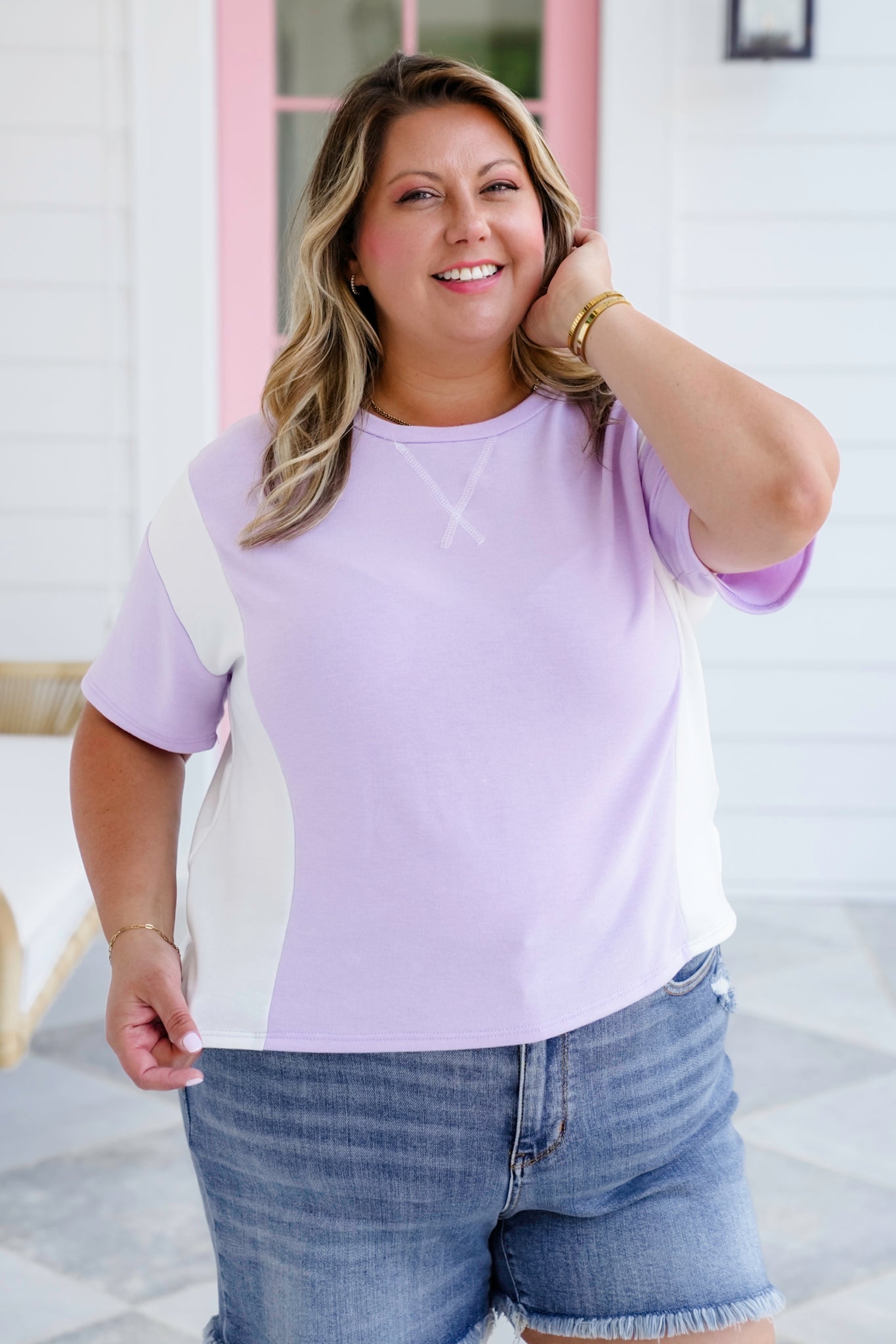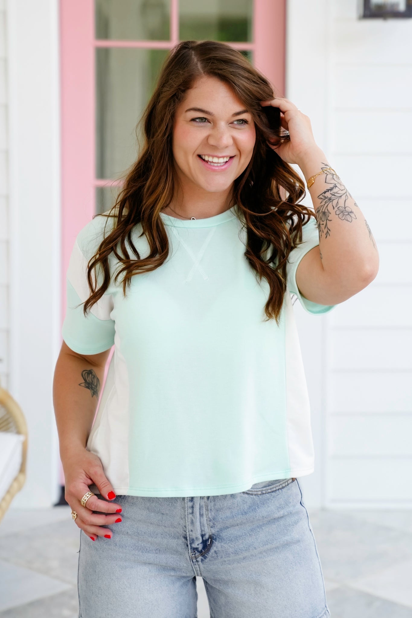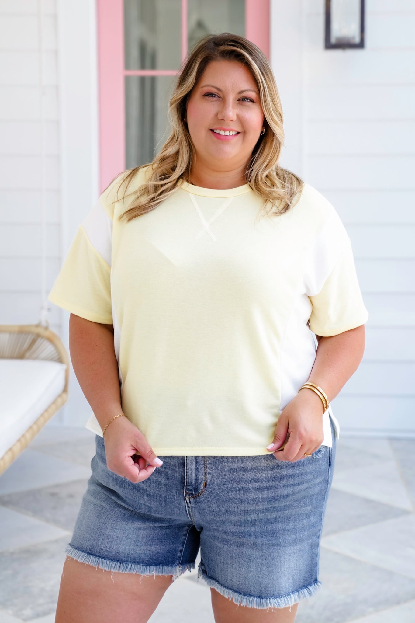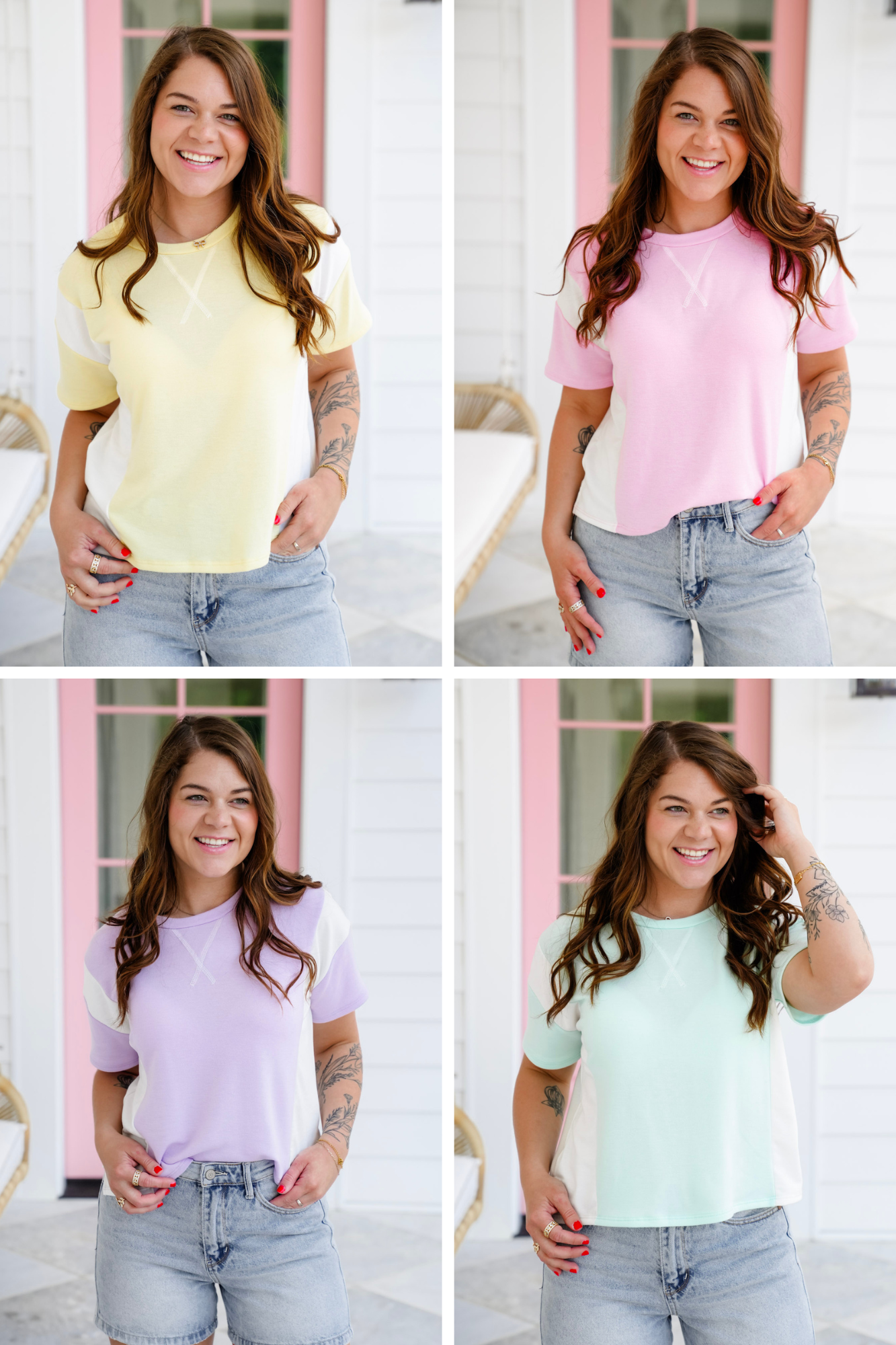 Soft, sweet, and full of laid-back charm, this color block tee is the perfect grab-and-go top for sunny days! The dreamy pastel tones and playful contrast make it pop, while the round neckline and boxy cut keep things relaxed and easygoing.