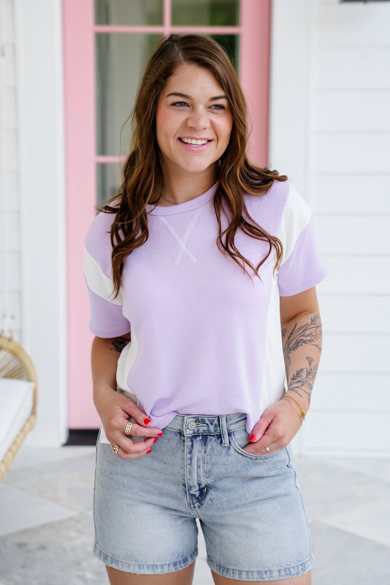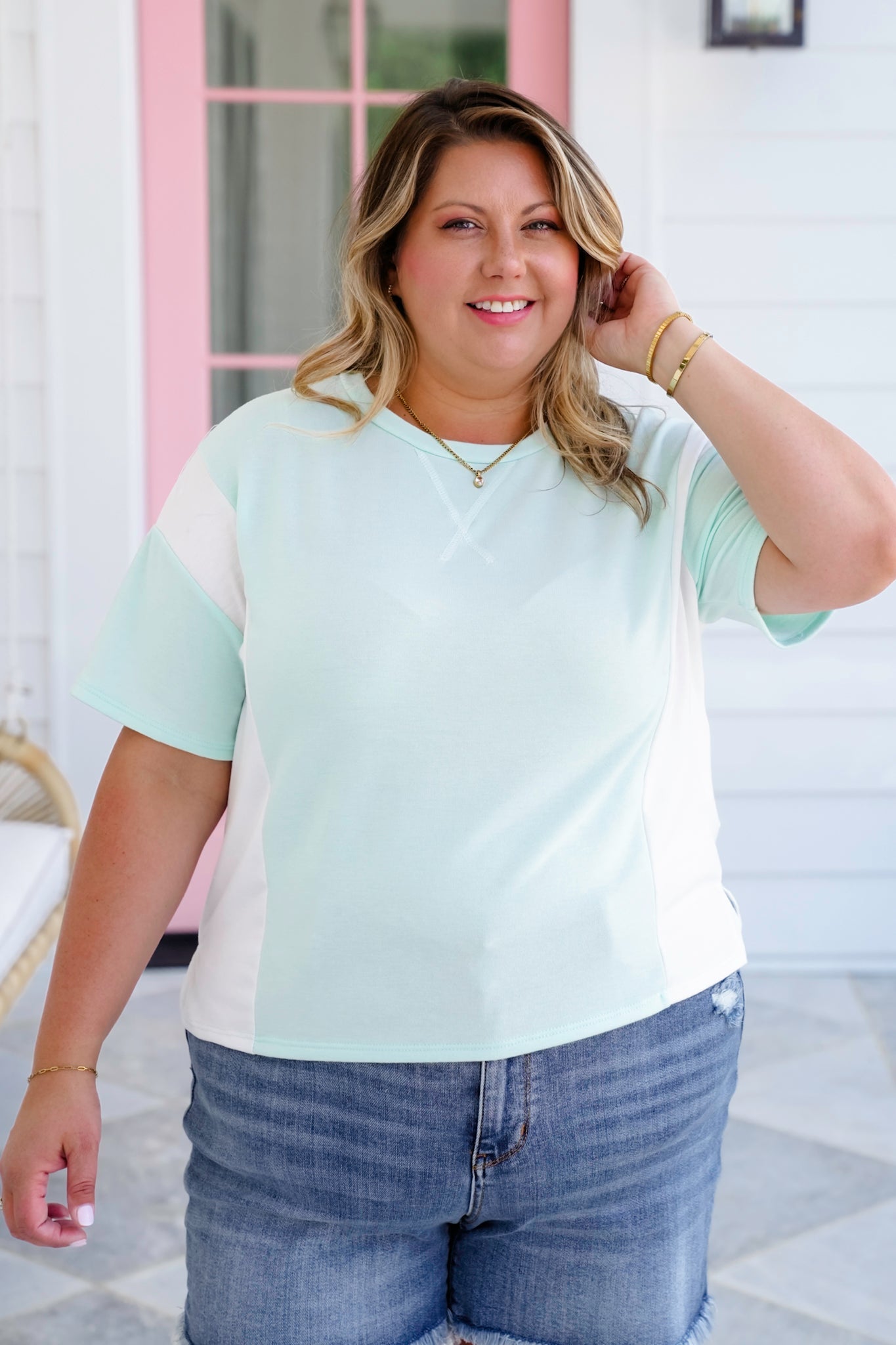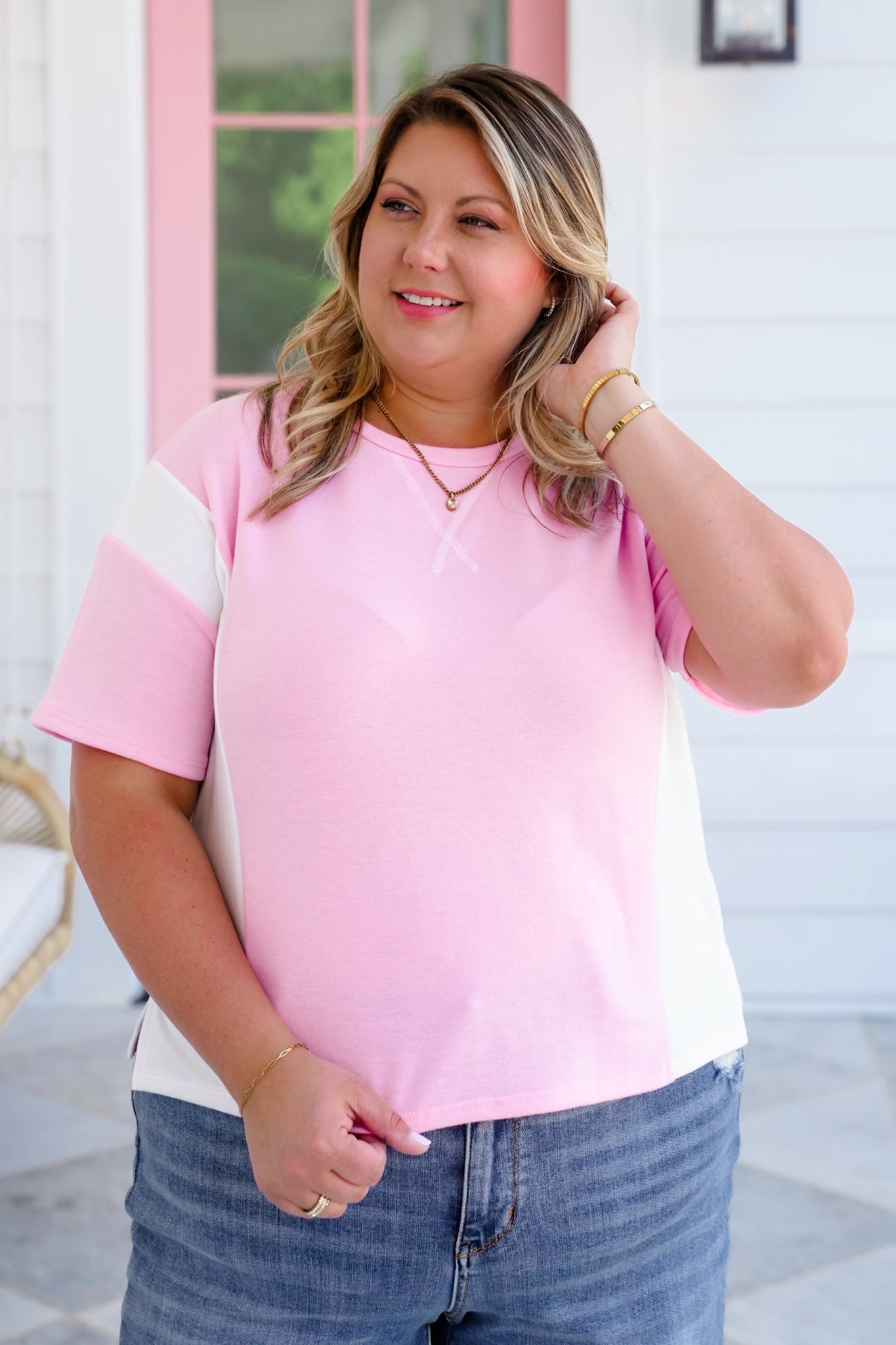 Soft, sweet, and full of laid-back charm, this color block tee is the perfect grab-and-go top for sunny days! The dreamy pastel tones and playful contrast make it pop, while the round neckline and boxy cut keep things relaxed and easygoing.