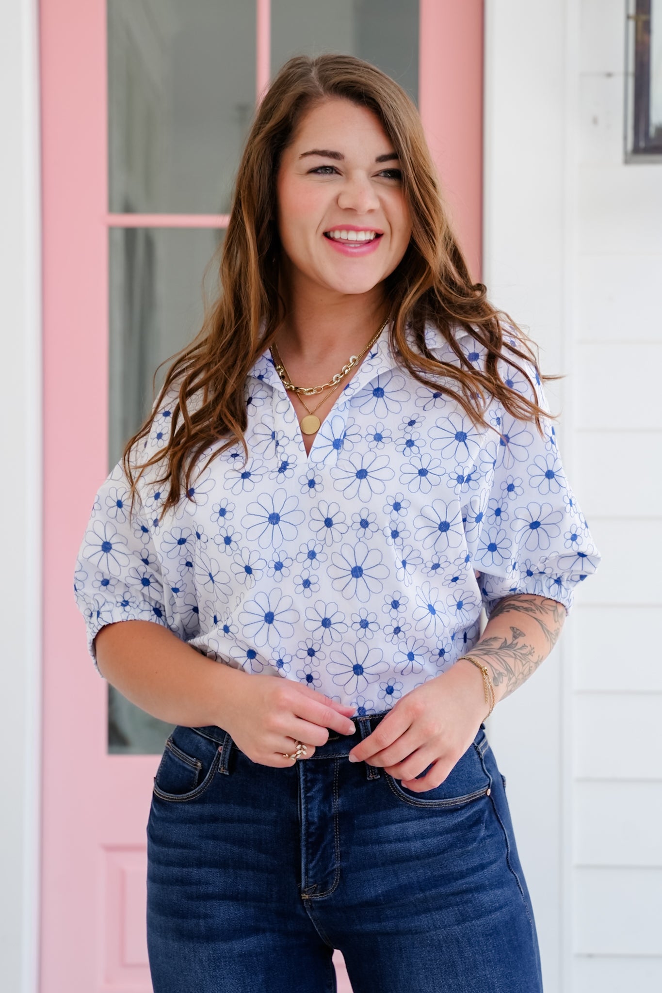 Brighten up your day (and everyone else’s) with this charming embroidered daisy top! From the playful blue daisies that dance across the soft fabric to the breezy short sleeves and flattering V neckline, this top is all about easy, cheerful style. Pair it with the matching skirt (sold separately) for a darling set, or keep it casual with your favorite denim.