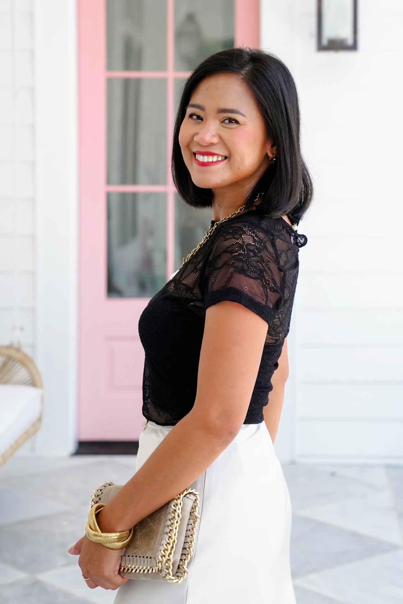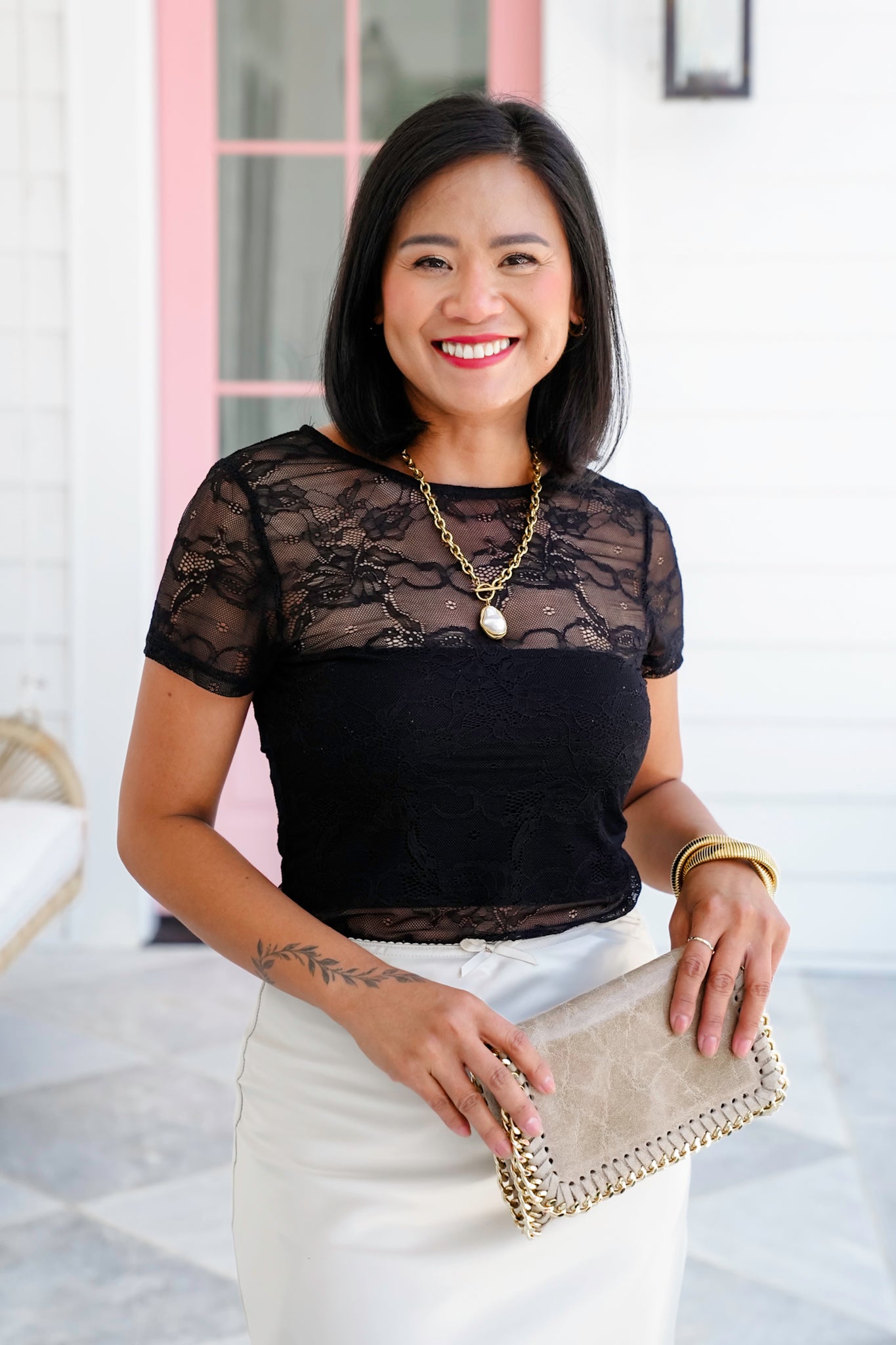Fit: The fit is true to size with plenty of stretch, so it hugs comfortably without feeling restrictive. All sizes are available, and it works beautifully on its own with a cami underneath or styled to let the lace peek through for a more daring vibe.