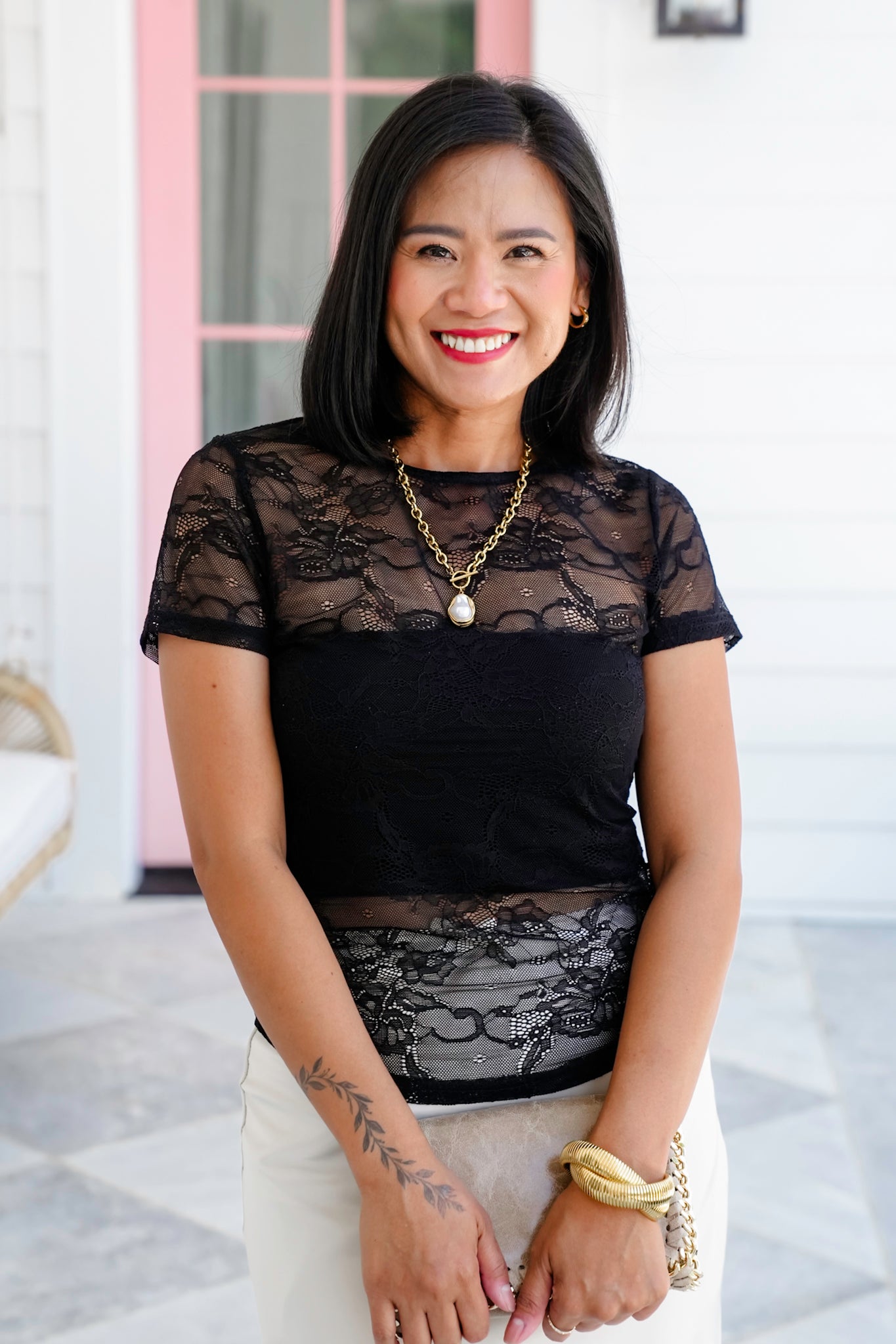 This floral lace short-sleeve top is the perfect blend of romantic and chic, with its delicate sheer lace fabric and pearl-button closure at the back adding just the right touch of elegance. It’s lightweight, breathable, and easy to style for everything from a night out to layering under a blazer for an elevated look.