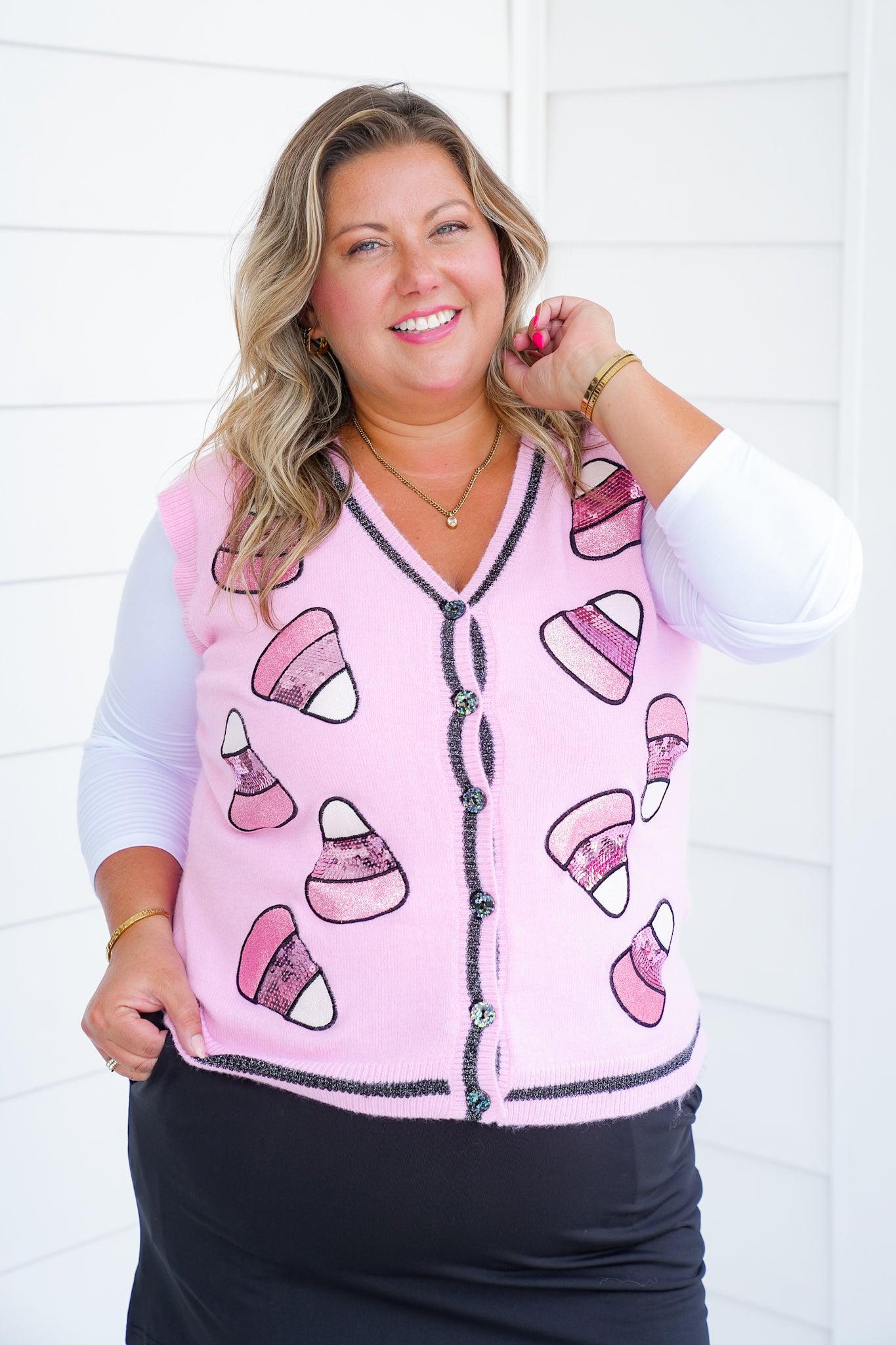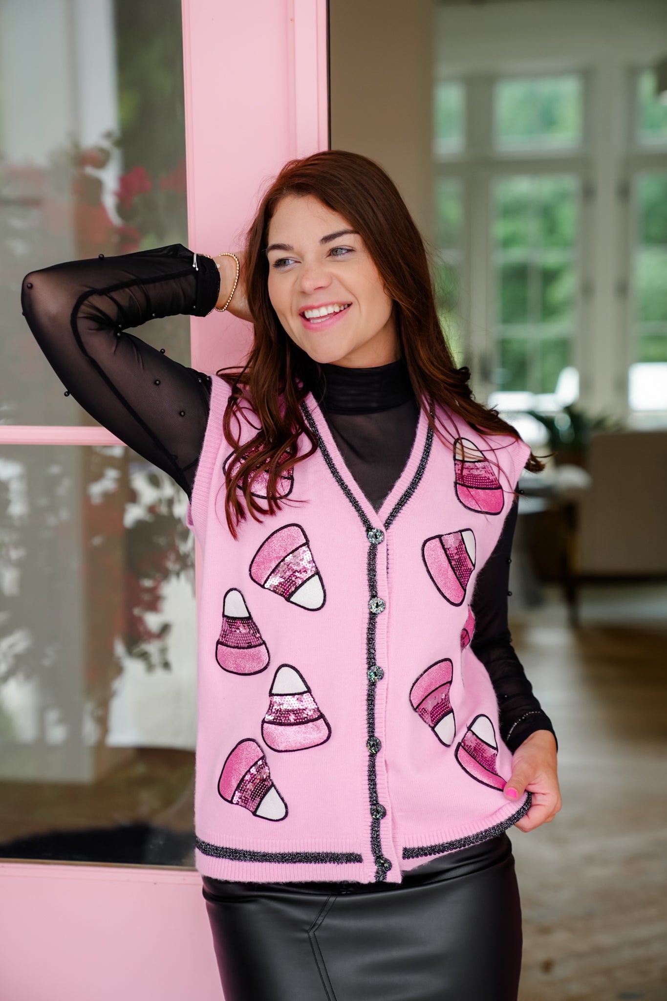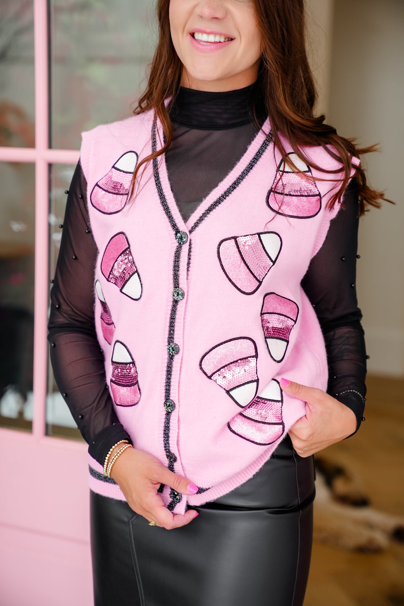 Bring the treat to every Halloween gathering with this candy-inspired statement piece! The playful candy corn sequins catch the light beautifully, making you sparkle in any spooky season setting. Whether layered over a flirty mesh top for a night out or worn with jeans for a festive daytime look, this vest serves major charm and seasonal sass.