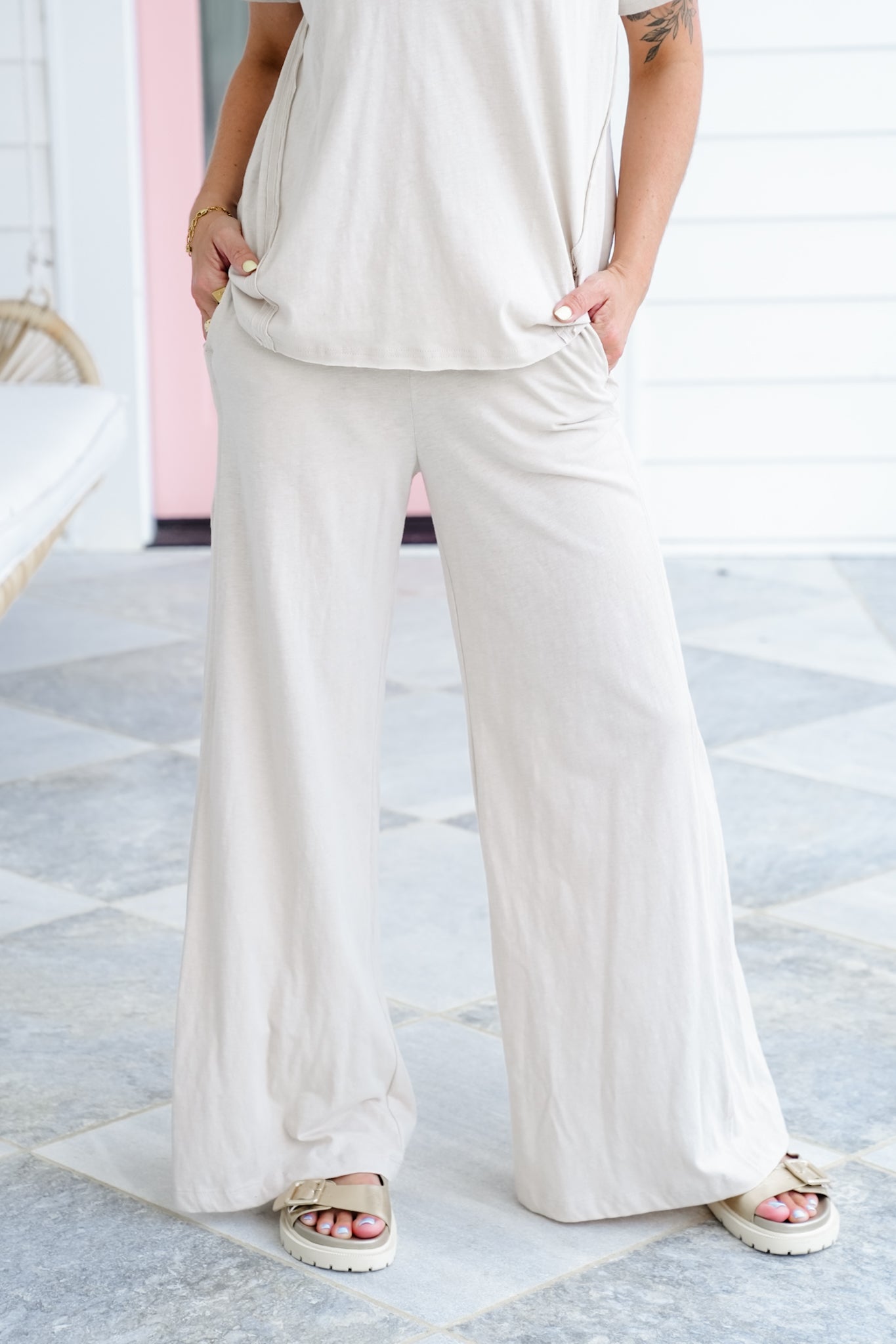 These wide-leg lounge pants bring comfort with a side of effortless style. The high waist and breezy shape are perfect for relaxing at home or grabbing lunch on a sunny patio. Pair them with a fitted tank for an easy, balanced look or with the matching top (sold separately) for a laid-back set that feels instantly put together.